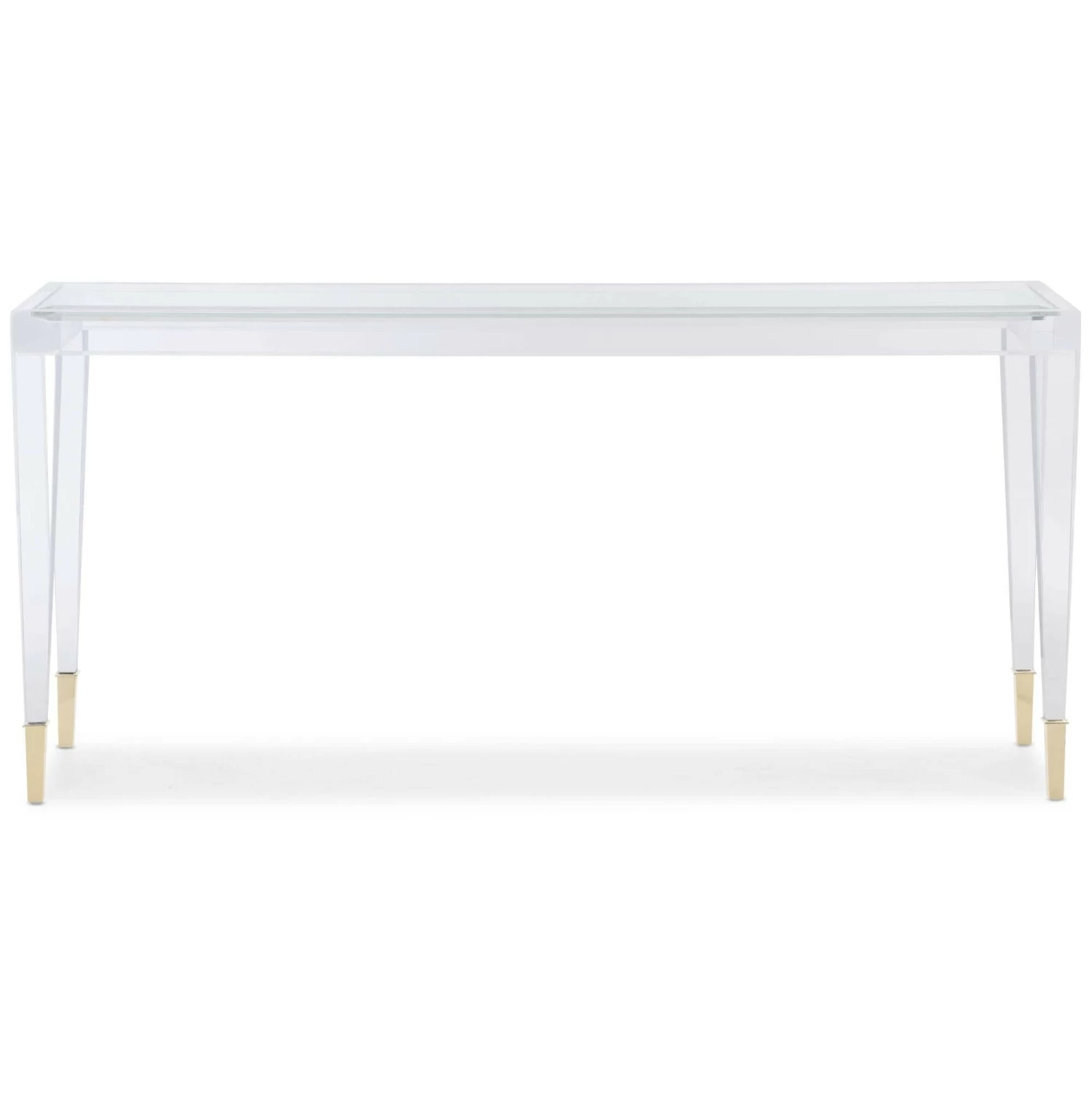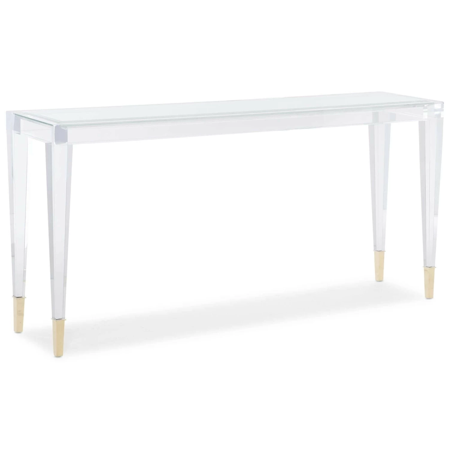 When it comes to alluring beauty, the choice is clear. You can’t help but love the unabashed brilliance of this console table. It’s so impressive, you’ll find yourself stopping to say “Ahhhhh.” With a clear acrylic frame, its see-through design adds modern charm to a room while still feeling visually light and airy. Metal ferrules in Whisper of Gold cap its acrylic legs and illustrate that what you see is what you get—and what you get is amazing. Acrylic legs and top frame. Beveled, clear glass top Ferrules in Whisper of Gold