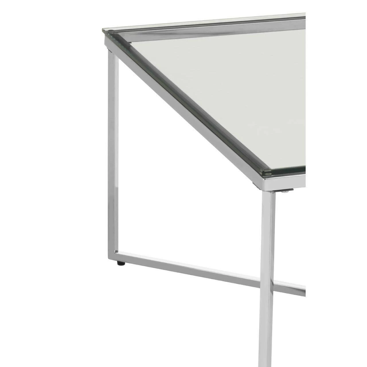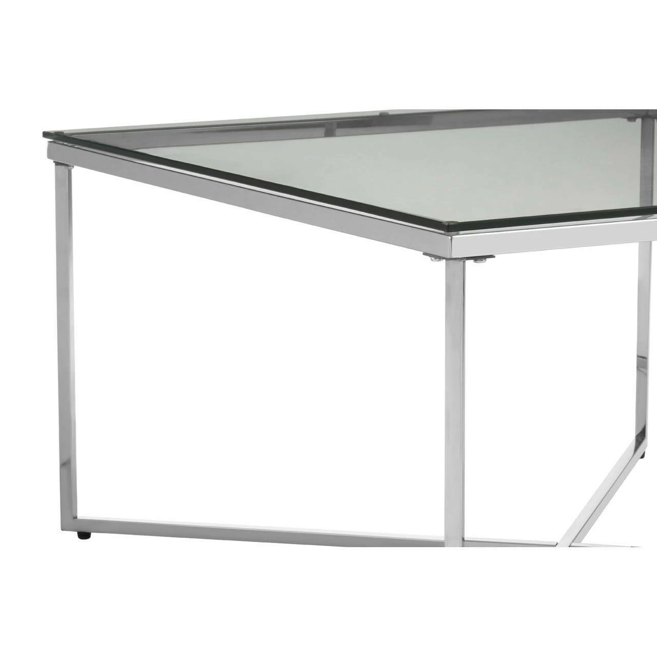 This end table makes a sophisticated impression thanks to its minimal-style frame, with an intersecting base for a subtle design flourish. The frame is finished in silver for a luxurious look and is reflective. The silver creates the perfect partner for the clear tempered glass top. Style with luxe furniture for a coordinated look.