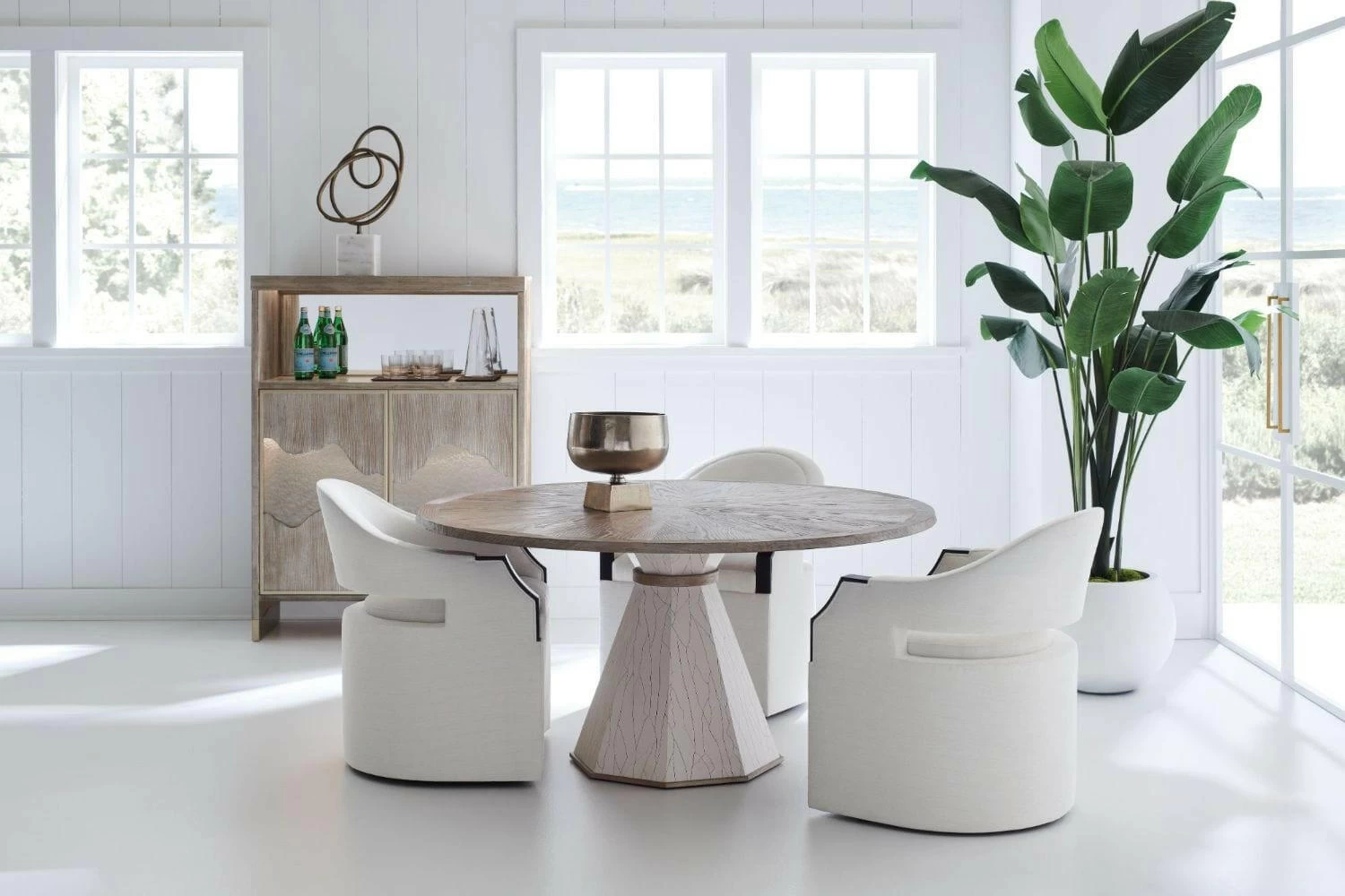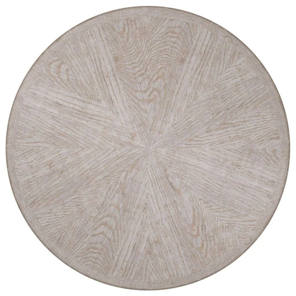 Crafted with the utmost attention to detail, this pedestal table introduces an element of ageless beauty to dining interiors. Inspired by a piece found while perusing antiques in Paris, its faceted base lends a look of surviving the centuries with a faux-crackle white finish. For added interest and tactile appeal, its generous tabletop features a pie-patterned veneer radiating from the centre, accented with solid wood banding. Top in Driftwood. Base is faux White Crackle
