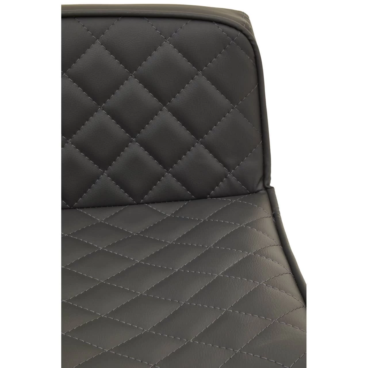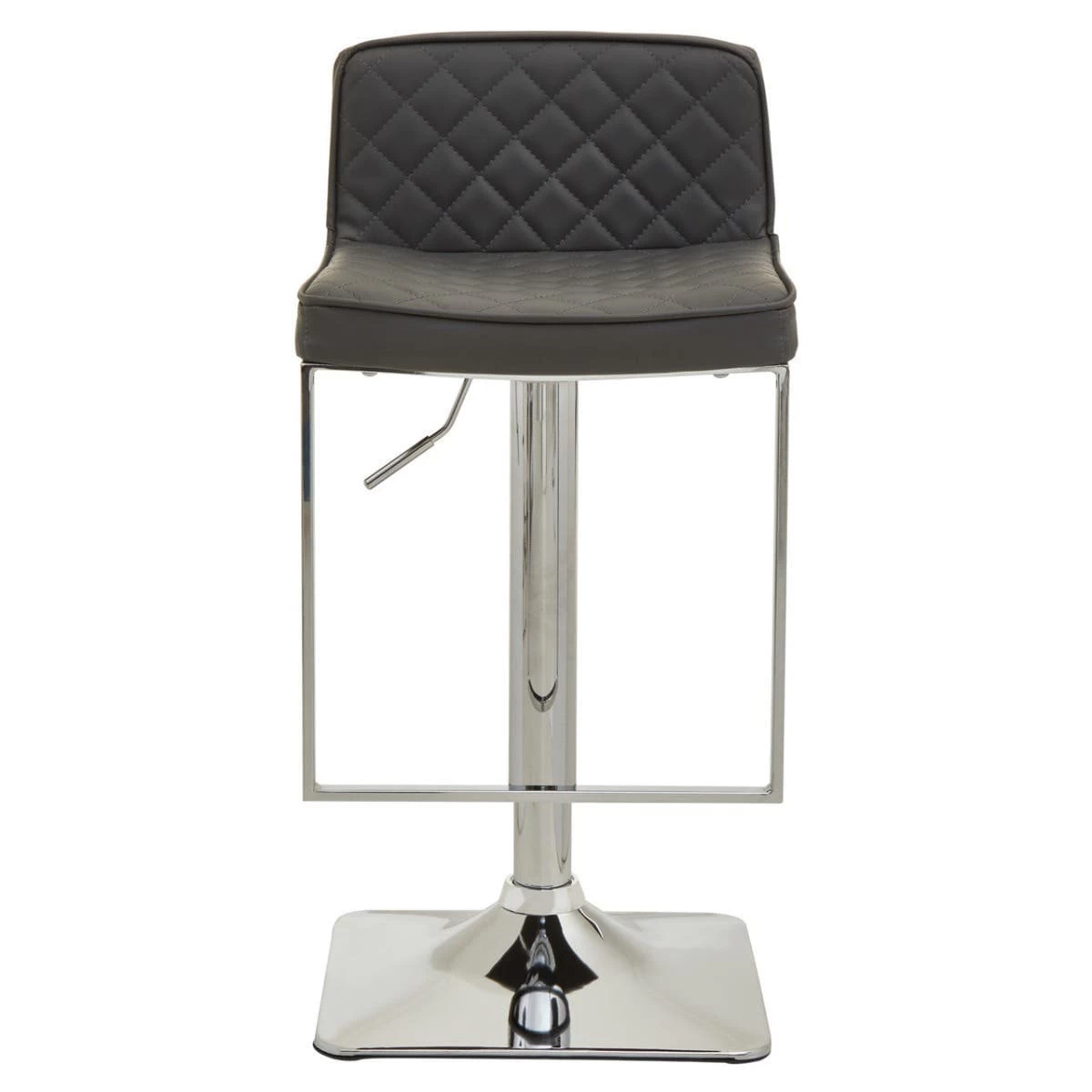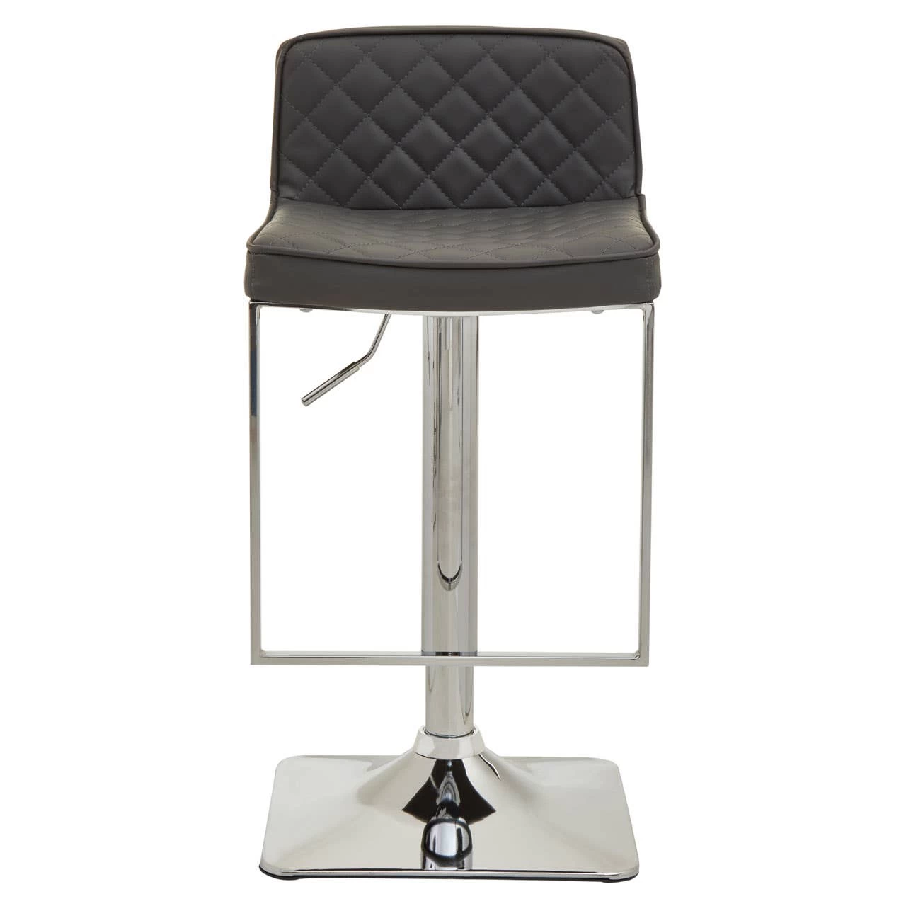 This bar stool features dark grey leather effect padded seat with diamond pattern tufted back. Height adjustable with swivel action, the square chrome finish pedestal base aligns with a minimal footrest and enhances luxe sophistication.