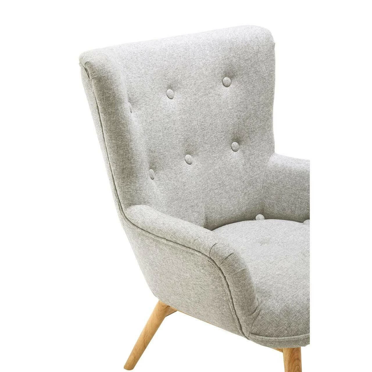 Its high backrest, large seating area and curving arms give the Bergen armchair presence. Upholstered in muted grey fabric, it features button detailing on the back and side of the seat. A tucked hem around its outer edges adds texture, while angled rubberwood legs further enhance the modern retro appeal.
