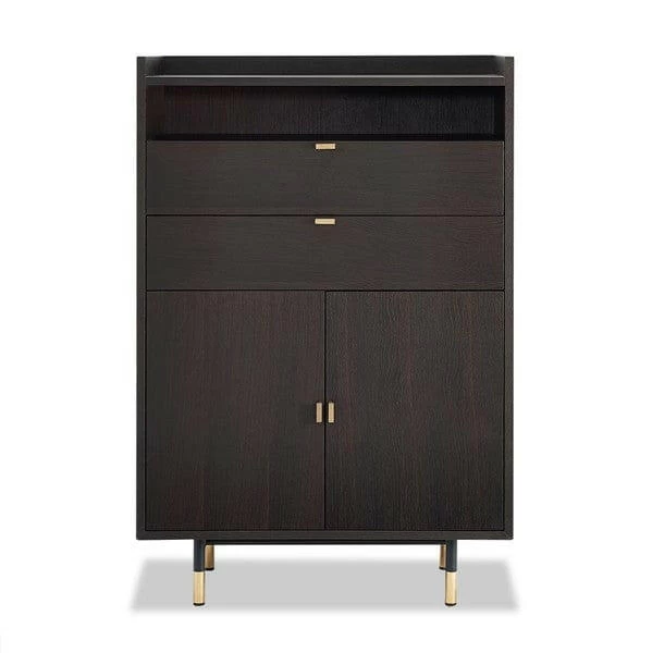 The Bofo Cabinet is a testament to chic sophistication, seamlessly fusing style and practicality. Its dark oak veneer cabinet body exudes a rich, inviting aura, while the black powder-coated metal legs, adorned with brass foot caps, add a touch of opulence and modernity. With its clever design, this cabinet offers two doors and two drawers, providing ample storage space that is as functional as it is elegant. The Bofo Cabinet effortlessly embodies the essence of sophistication, making a bold statement in any room while maintaining an air of timeless charm and refined taste.