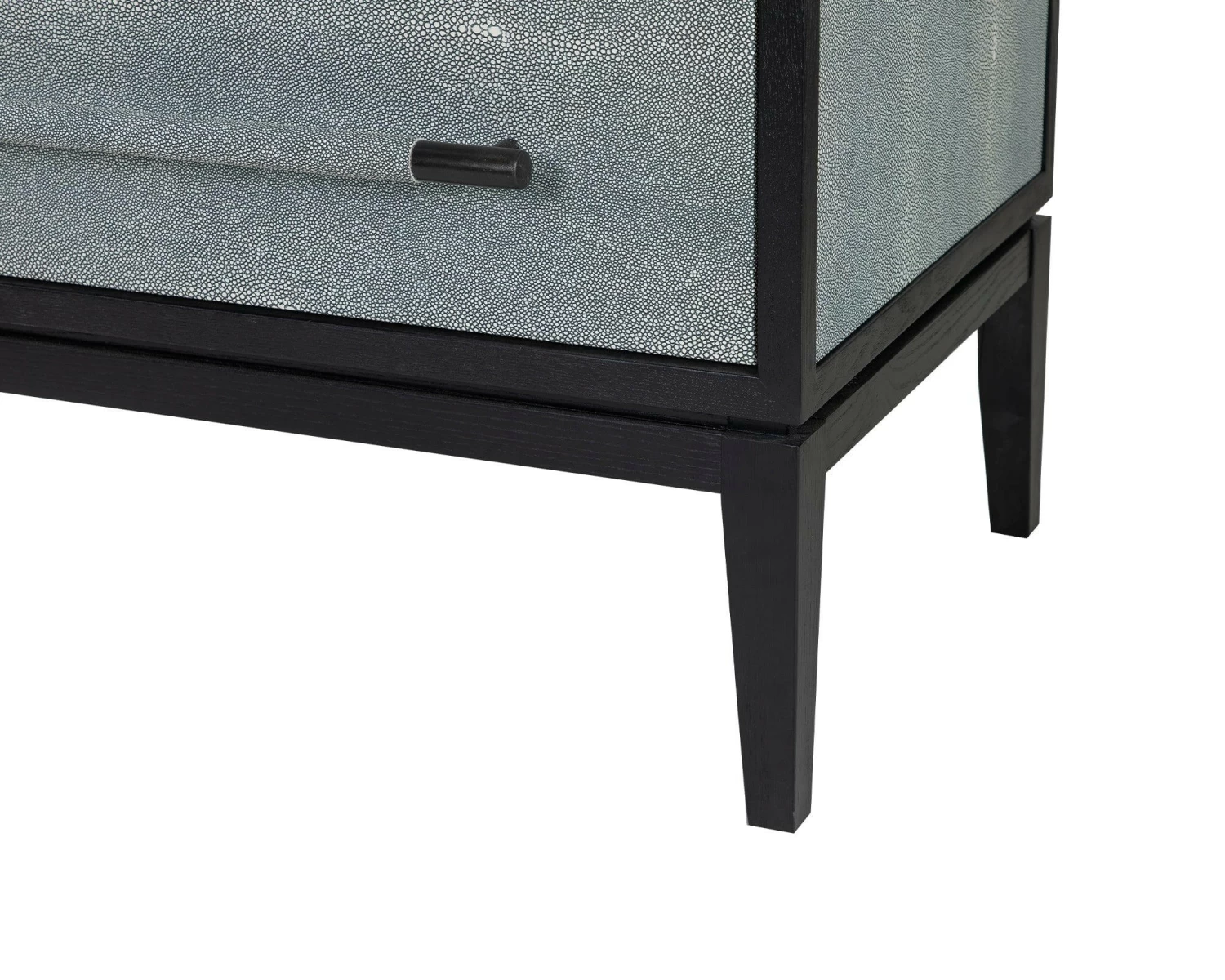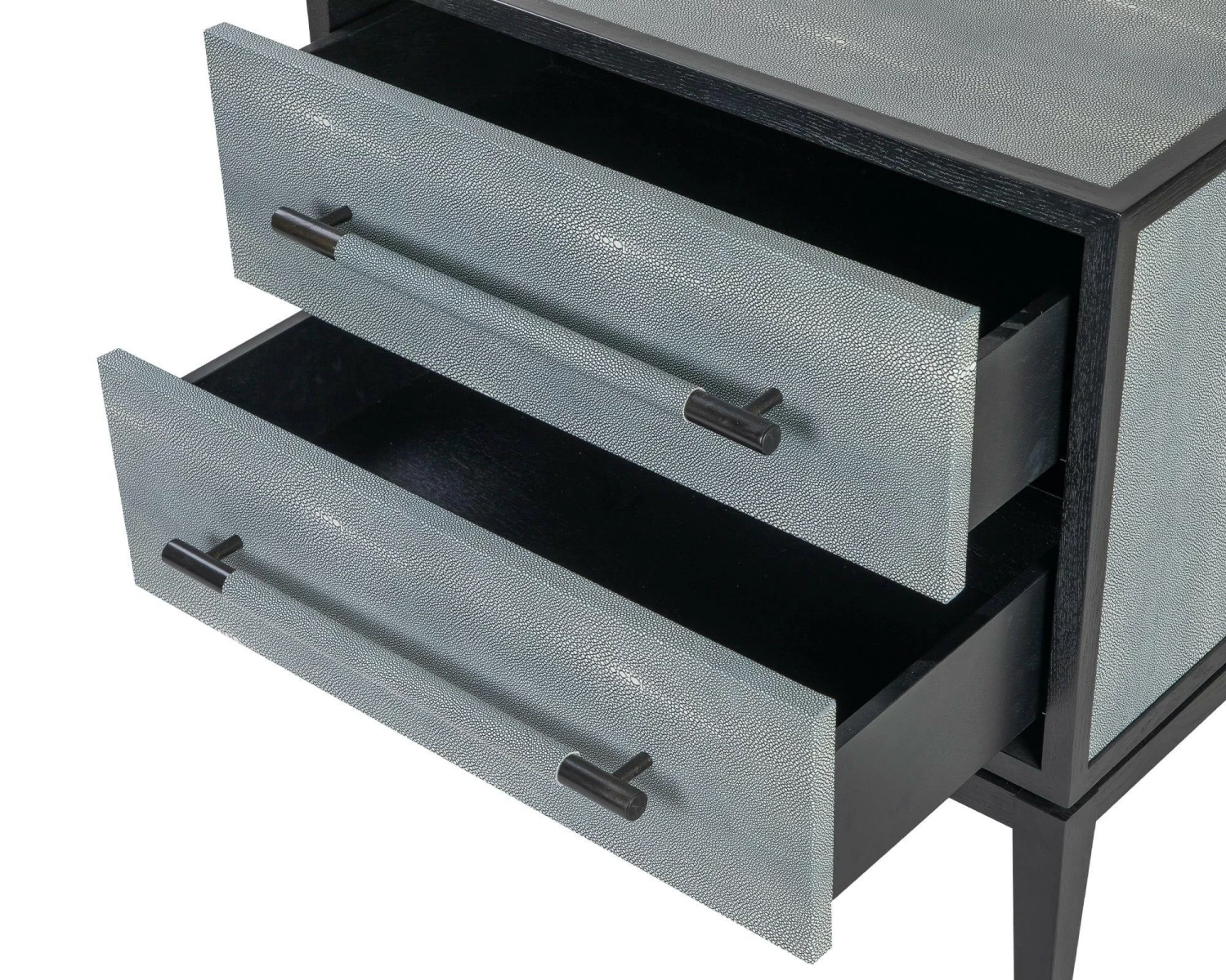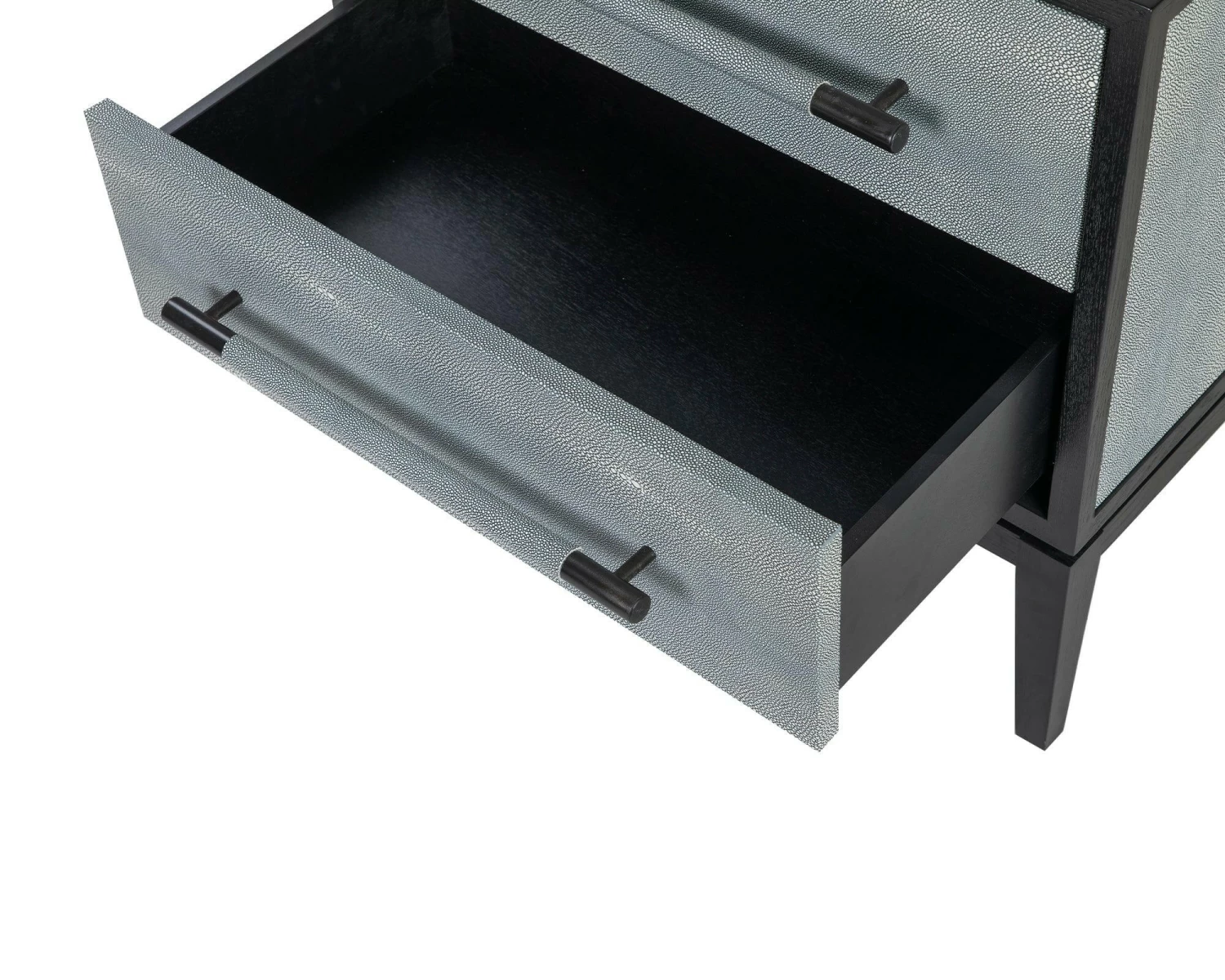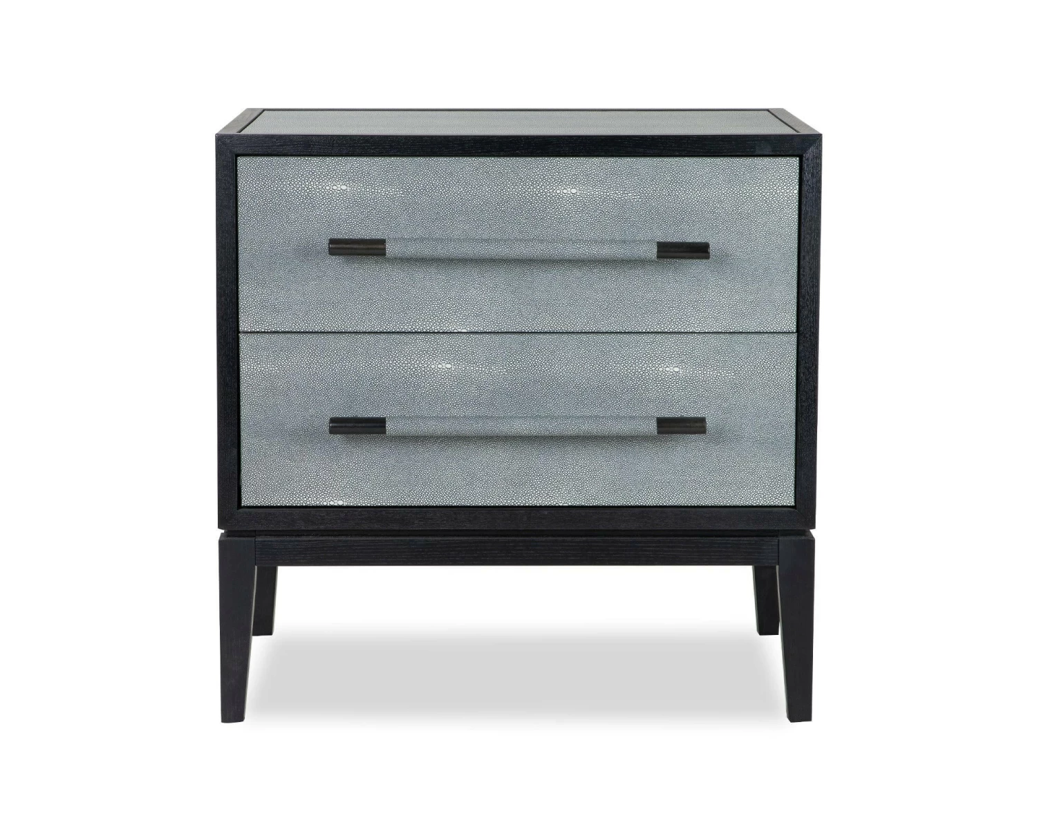 Grey Leather Look, Black Ash Veneer & Metal Handles Elevate any interior with the Bologna Bedside Table. A faux shagreen exterior in cool grey creates a modern look that will elevate your bedroom space. Coveted for its beautiful style, this bedside table offers you total convenience as well as character. Matching Shagreen Handles and Black Ash Veneer frame bring the whole piece together in harmony.