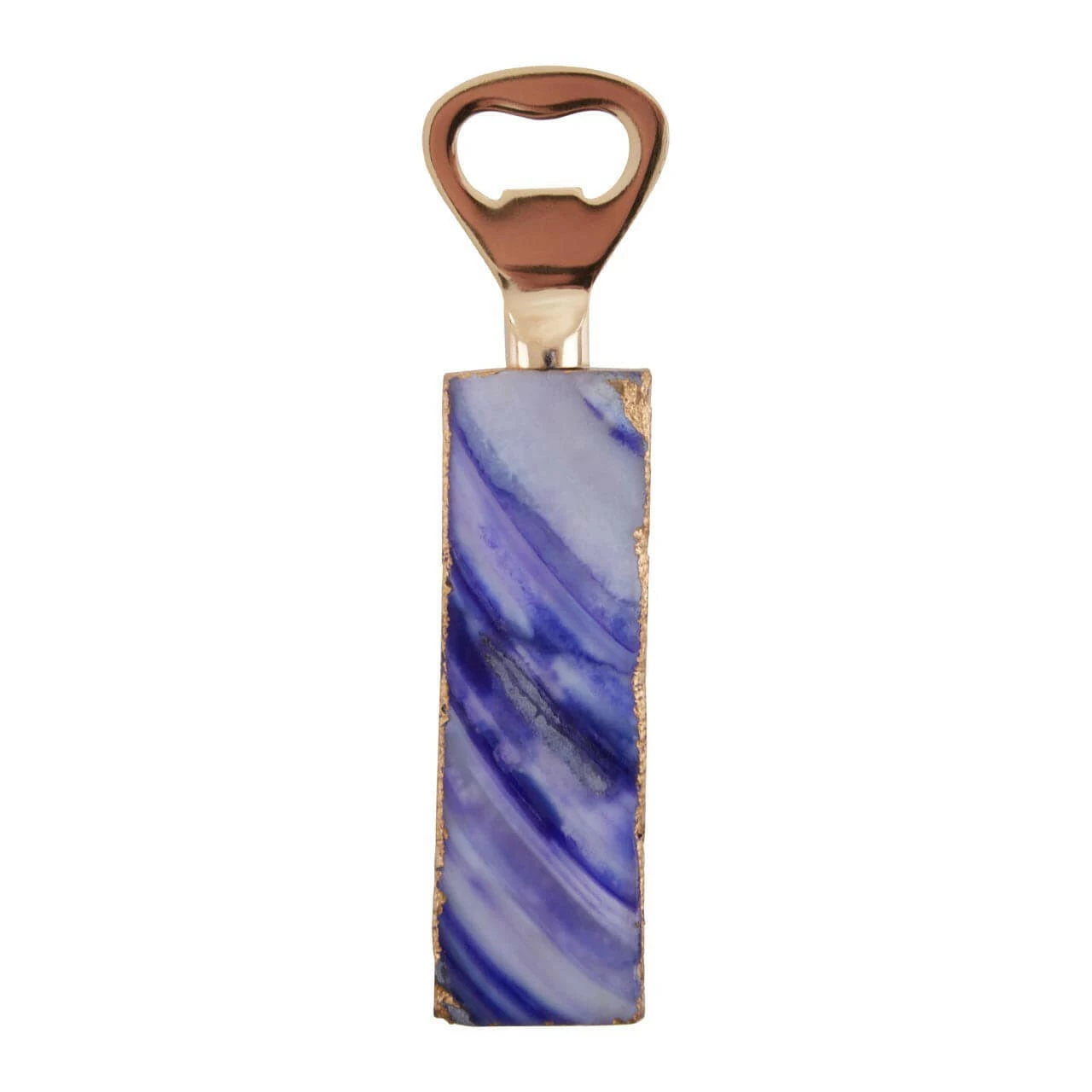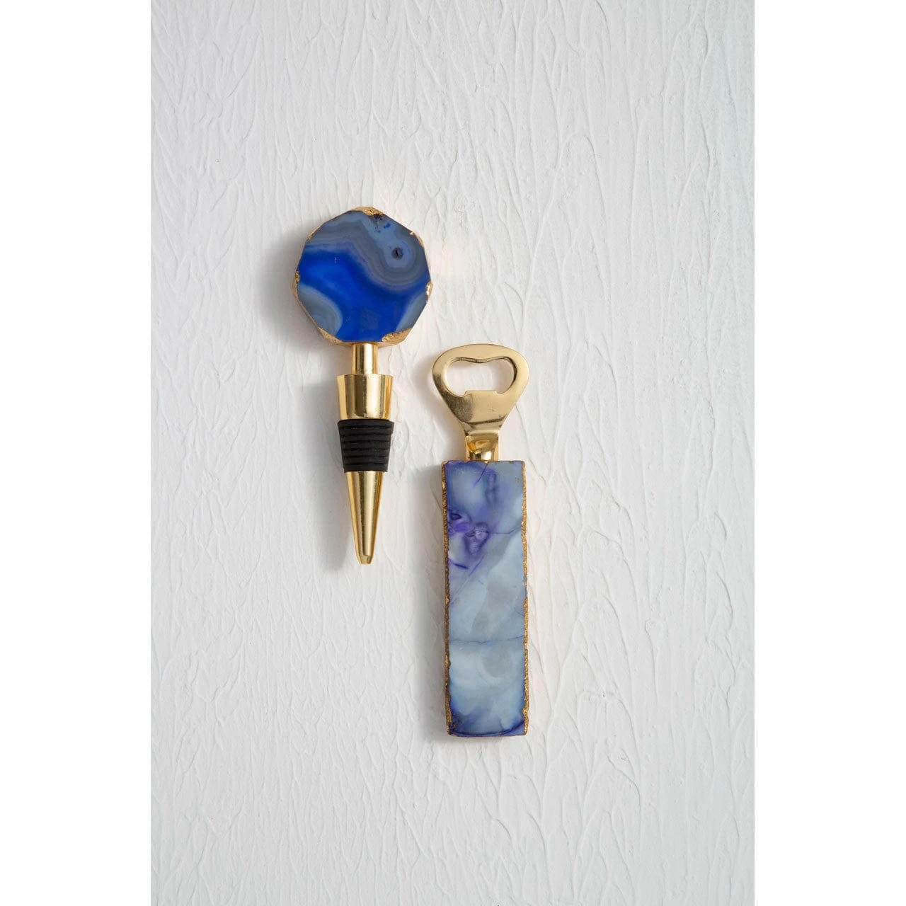 Agata bottle opener is made with stainless steel and its blue geode textured grip has warm metallic edging which gives a luxe accent to barware. It is paired with a stopper having a pointed base with rubber gasket to keep the bottle airtight.