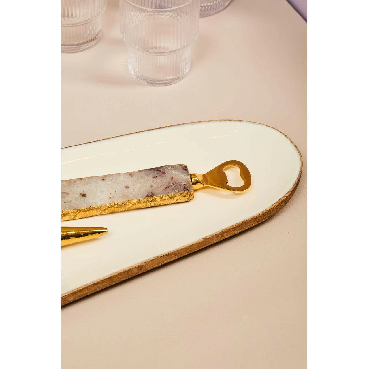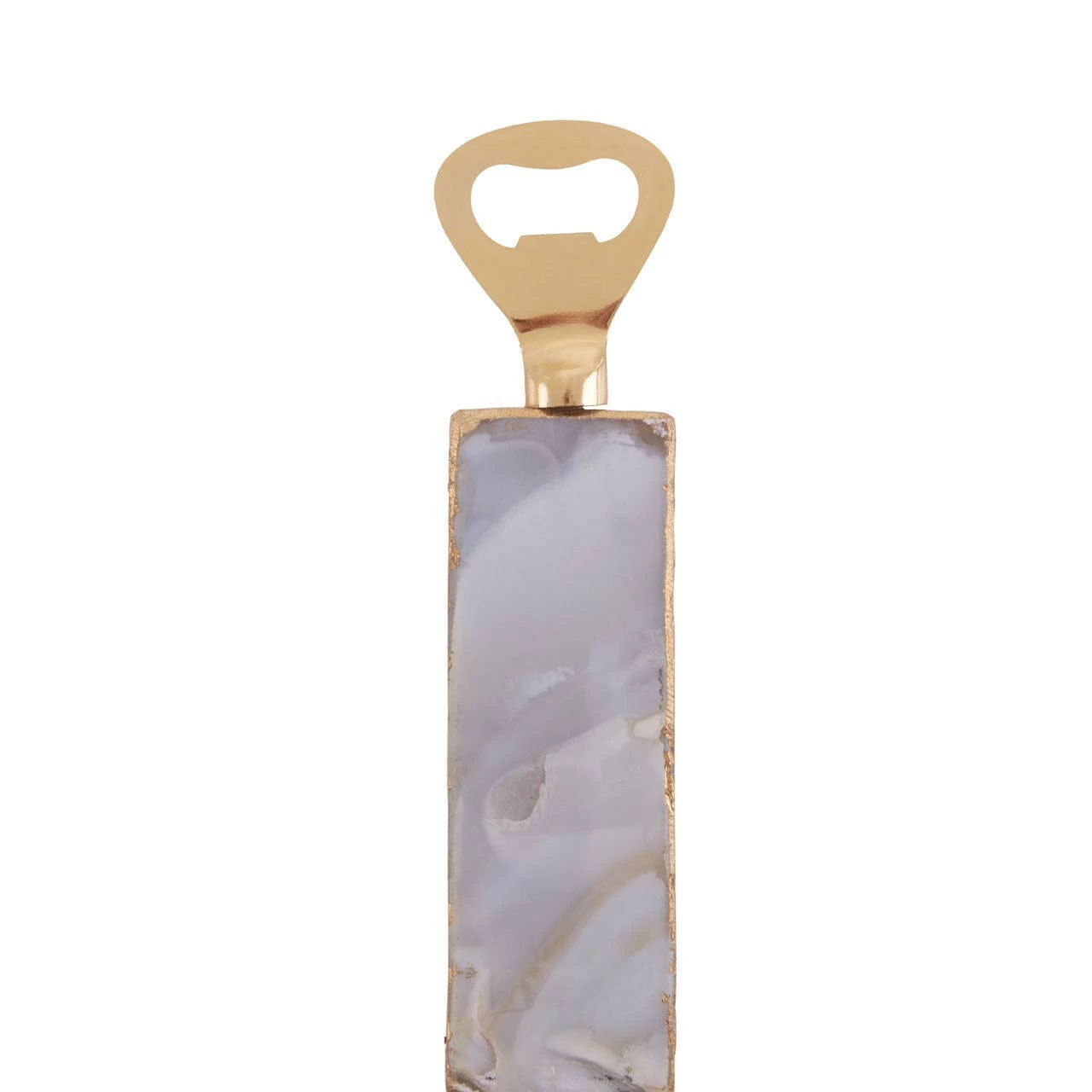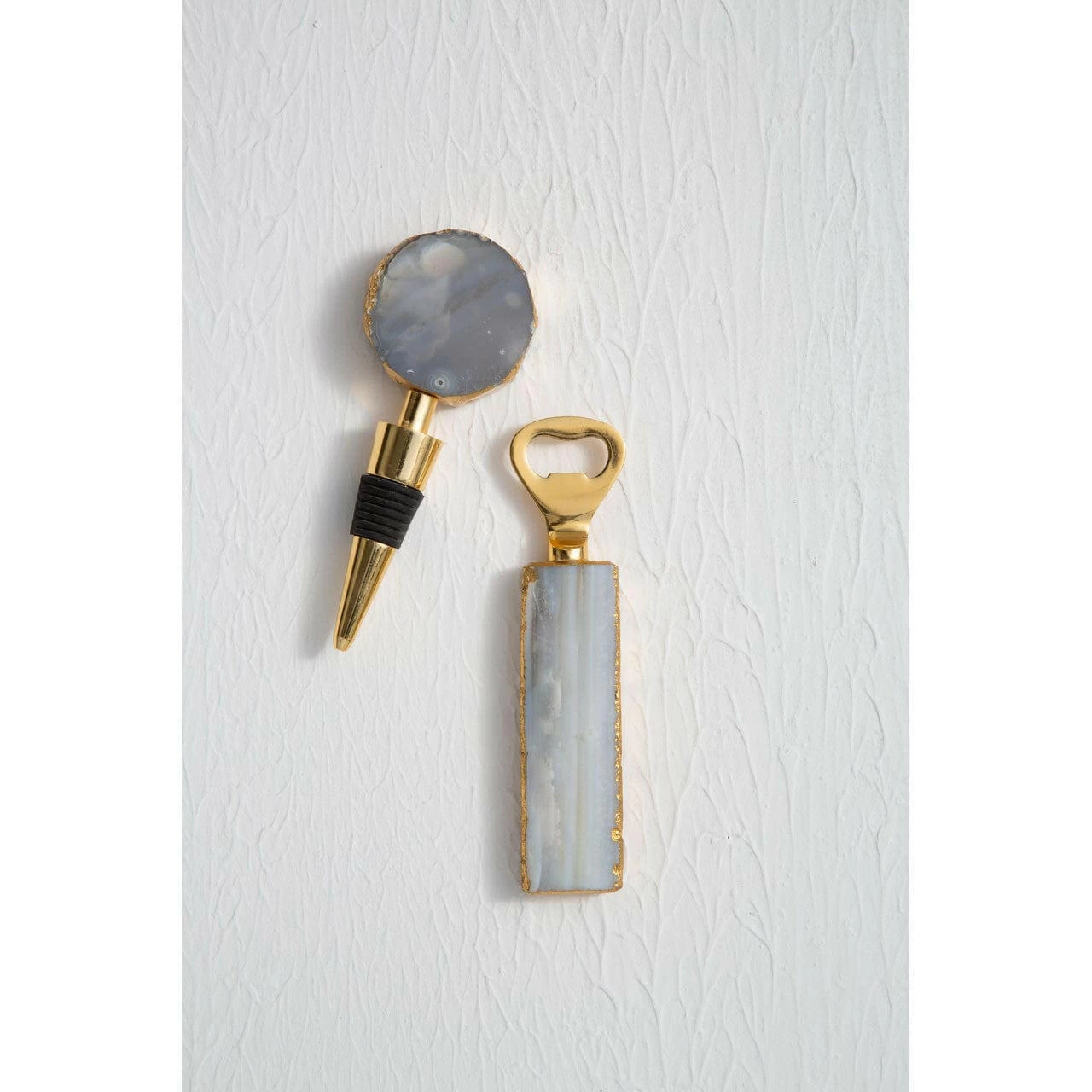 Agata bottle opener is made with stainless steel and its natural geode textured grip has warm metallic edging which gives a luxe accent to barware. It is paired with a stopper having a pointed base with rubber gasket to keep the bottle airtight.
