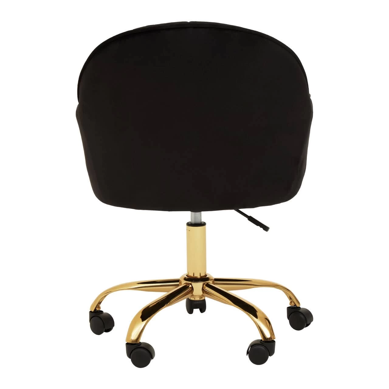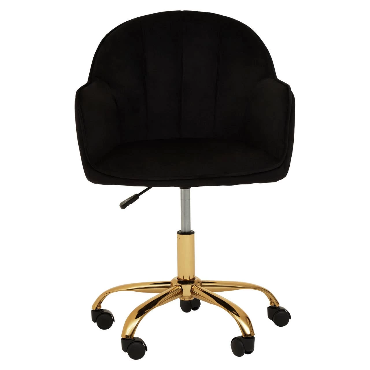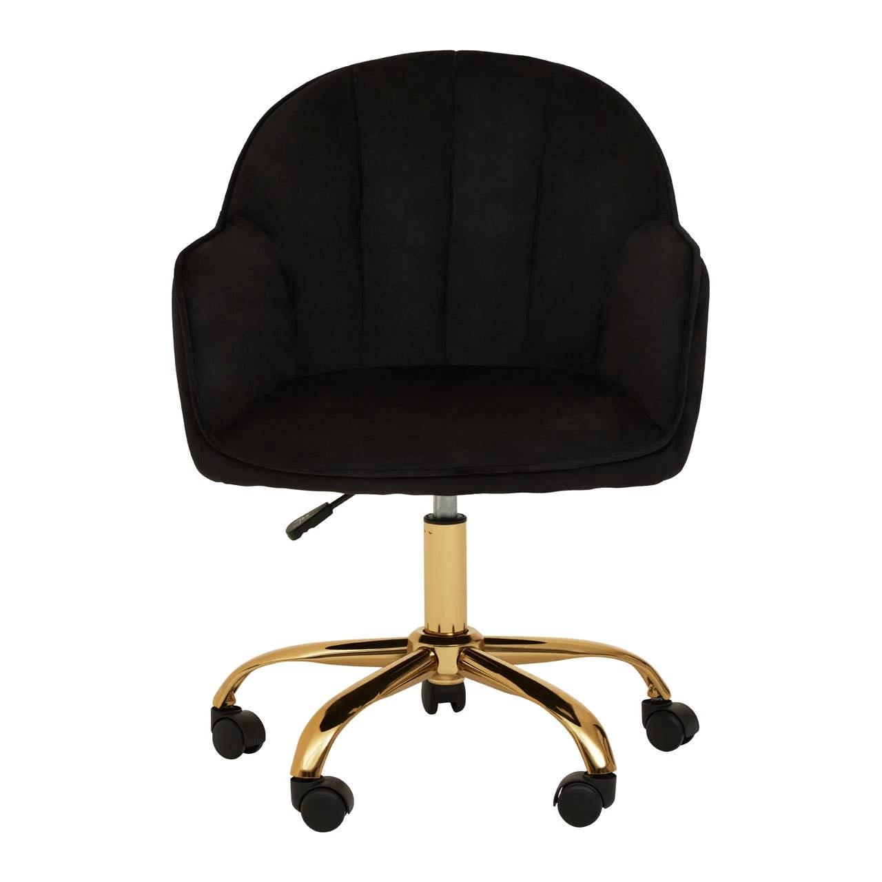 This home office chair boasts stylish integrated flared arms upholstered in black velvet for added softness and durability. The gold base provides a modern finish to this sophisticated versatile home or office chair.