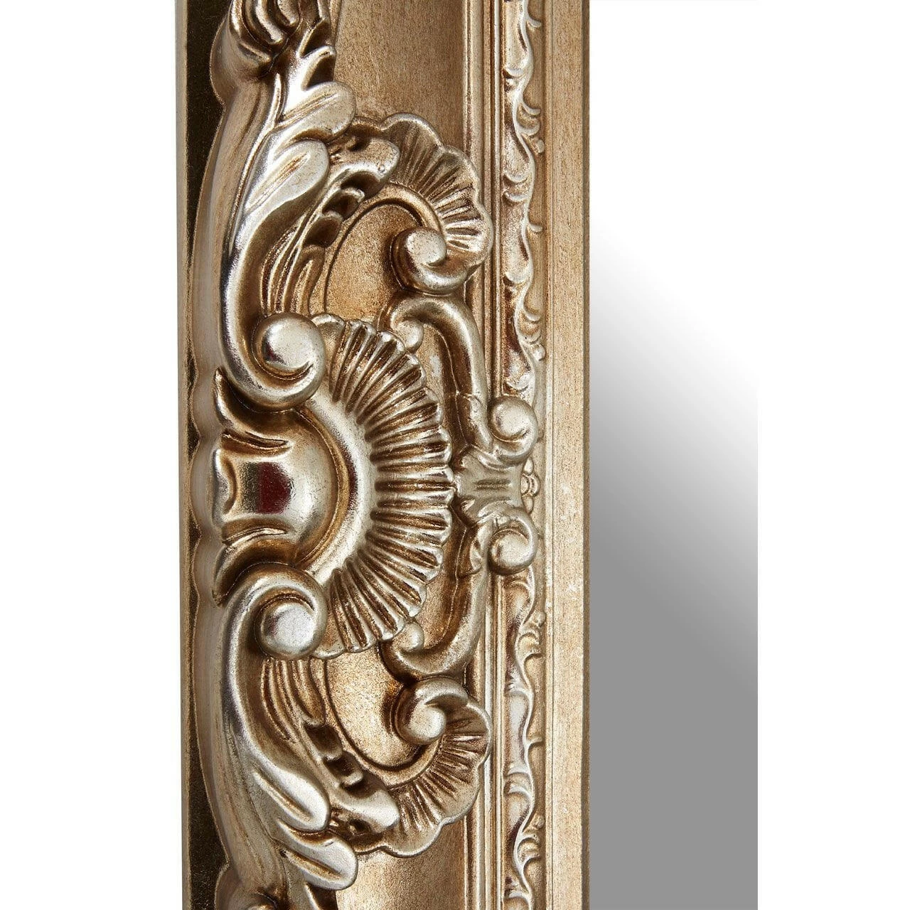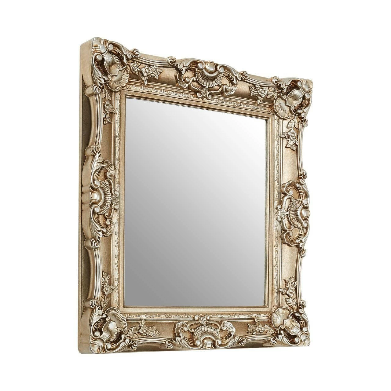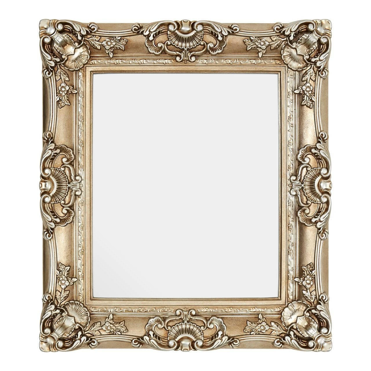 The thick frame is replete with Enlightenment-era motifs, including clamshells, flowers, and petals. Their symmetrical arrangement combines with the distressed champagne finish to help the mirror achieve its antique look. Capable of being displayed landscape or portrait, style it with metallic coloured lighting and furniture.