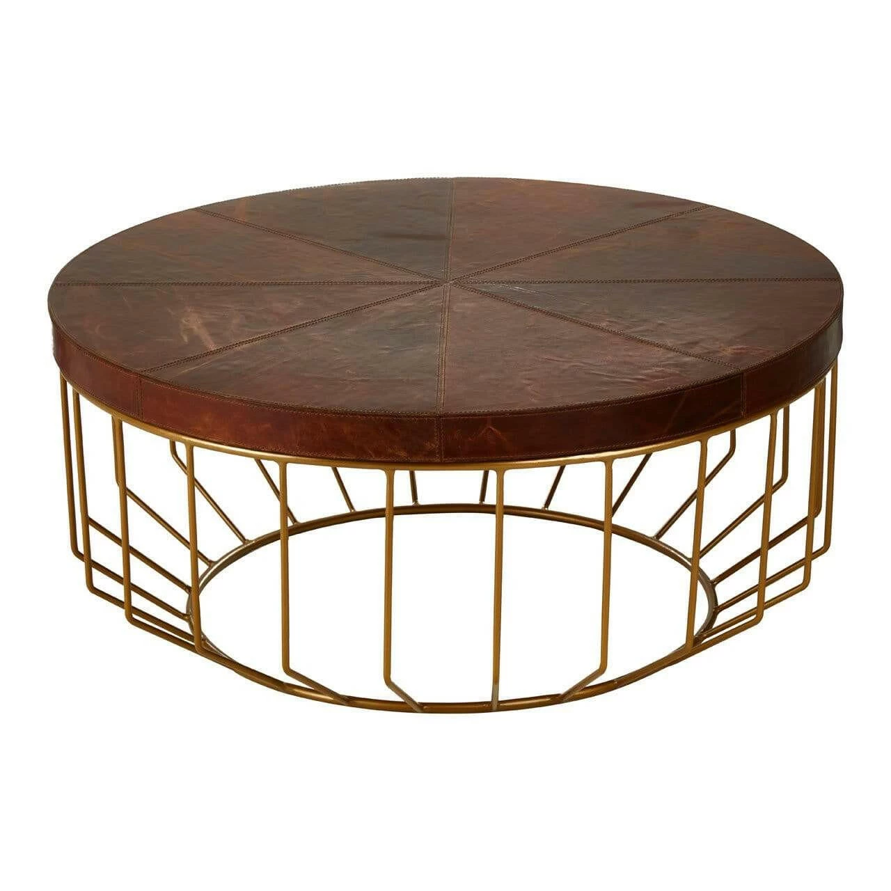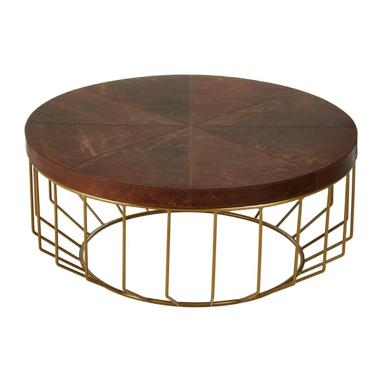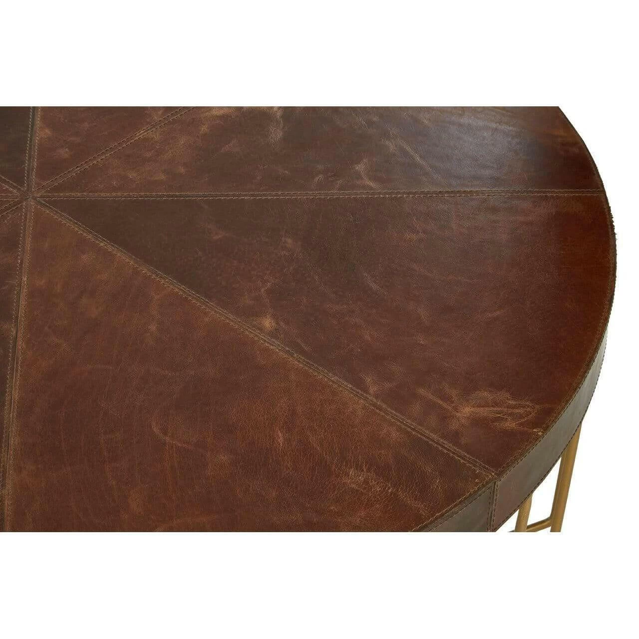 The tabletop is dressed with genuine tan leather, with a subtly segmented pattern that creates a textured look. Lines of powder coated iron form the base and are coloured copper to complement the leather.