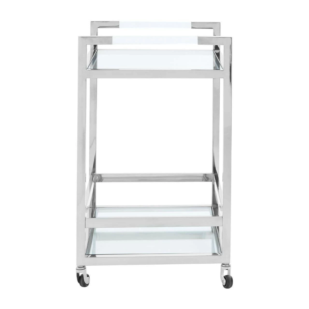 The frame of the Vogue butler trolley is made from polished stainless steel, with a bar surrounding its bottom section to ensure bottles stay in place when the trolley is being pushed. Both of its tiers are made from a single pane of clear tempered glass. A segment of clear acrylic is integrated into the trolley’s handles.