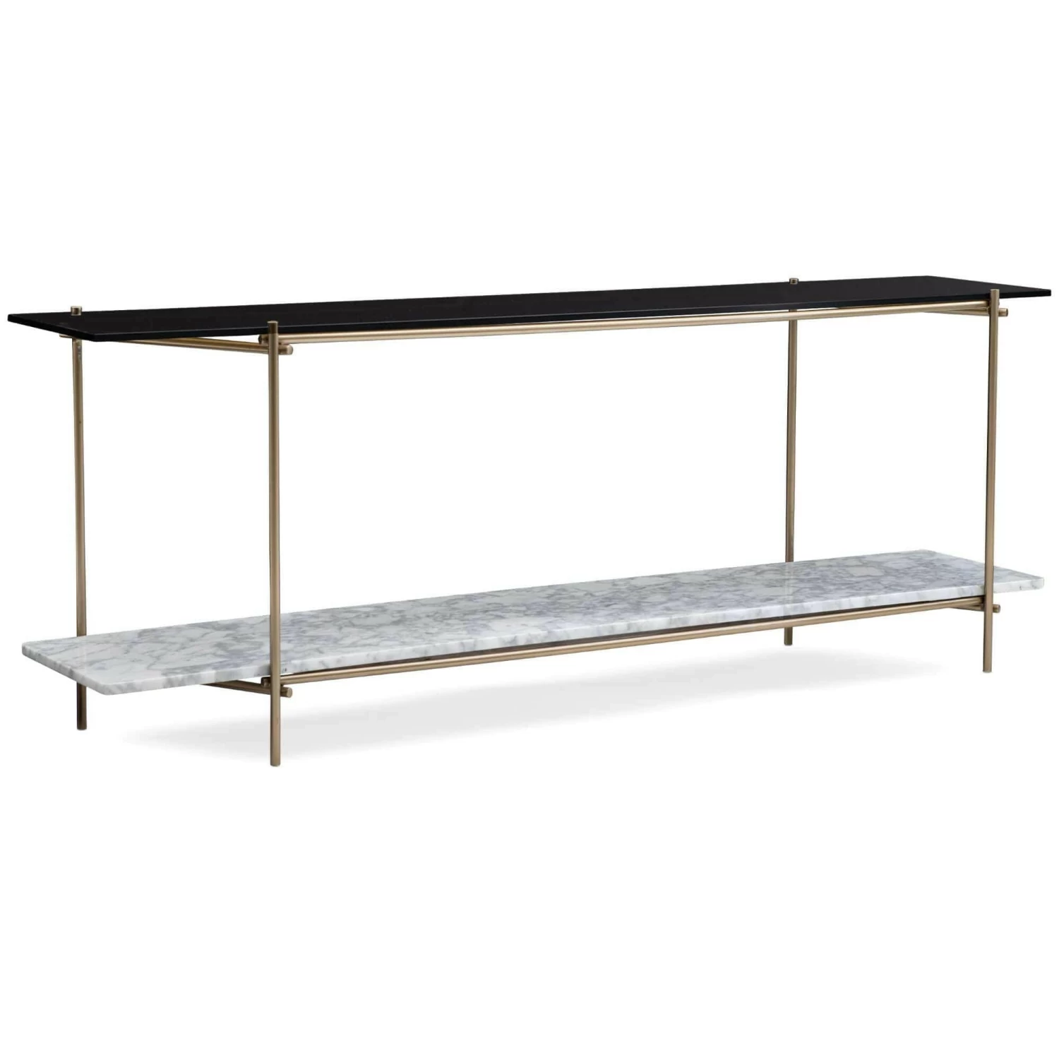 Glass, metal, and stone meet and meld in this exceptionally beautiful console table. Its modern silhouette is open and airy yet offers substantial presence. At the top you’ll find an elegant plane of glass tinted in a warm brown that lets you look through to see the beauty beneath. Visible from above, the bottom shelf is crafted of ¾-inch slab of Carcasta marble. Both glass and stone are outlined in a plated-metal frame finished in a luxurious Lucent Bronze. This console table’s stylish base features angular supports that offer a contemporary take on rustic construction while each design element is skilfully balanced to create a singular look that will stand out wherever it’s located. Plated metal frame finished in Lucent Bronze Smooth Metallic Paint. 12mm thick brown tinted tempered glass top. 3/4″ Caracasta laminated bottom stone shelf. Ships KD.
