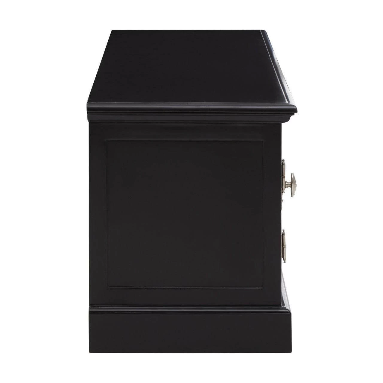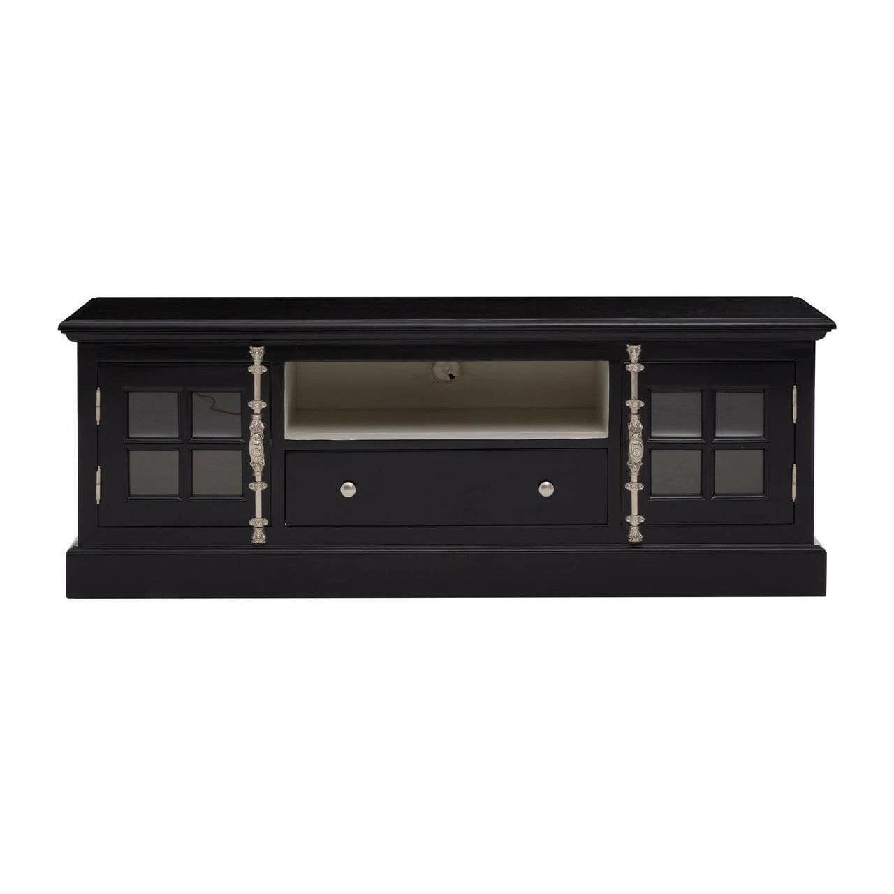 Black finish mahogany wood media unit offers ample storage with storage drawer, shelf and windowpane cabinets. Intricately carved silver finish detailing coordinates with the carved corners to enhance the colonial inspiration.