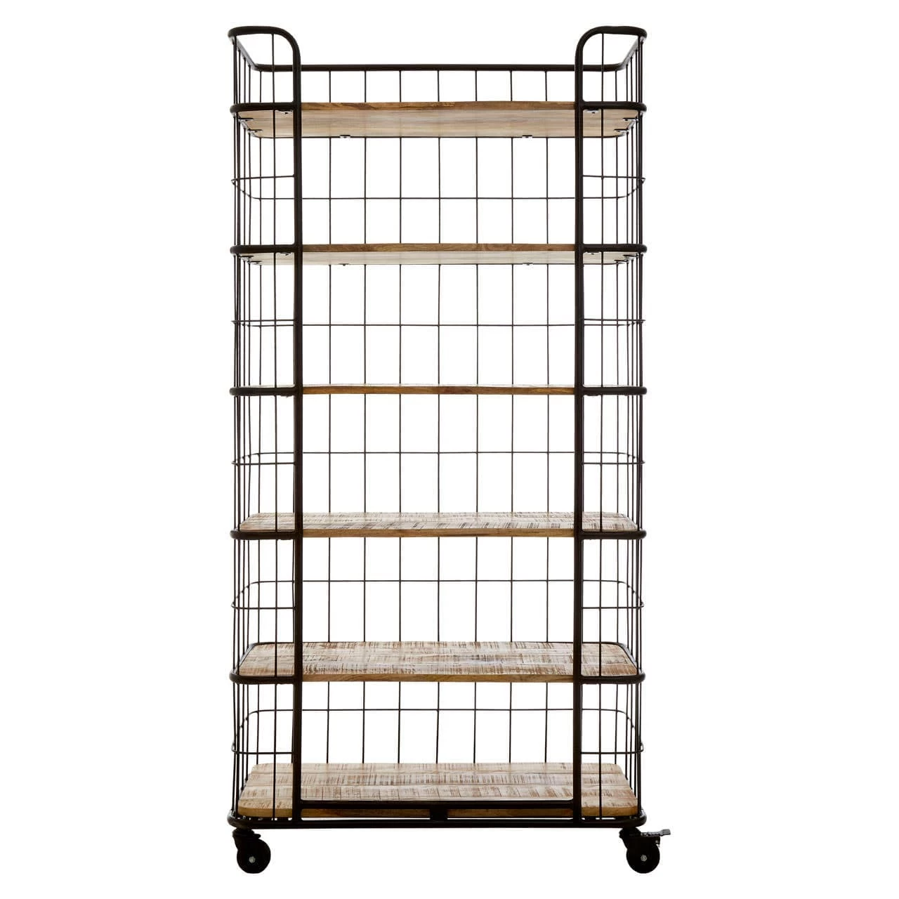 Its six shelves are made from renewable mango wood and offer an earthy contrast to the black iron wire structure that wraps around them. The shelves have a four panel configuration and have a golden colour and rich grain. Braked castor wheels at the base further contribute to its factory floor aesthetic.