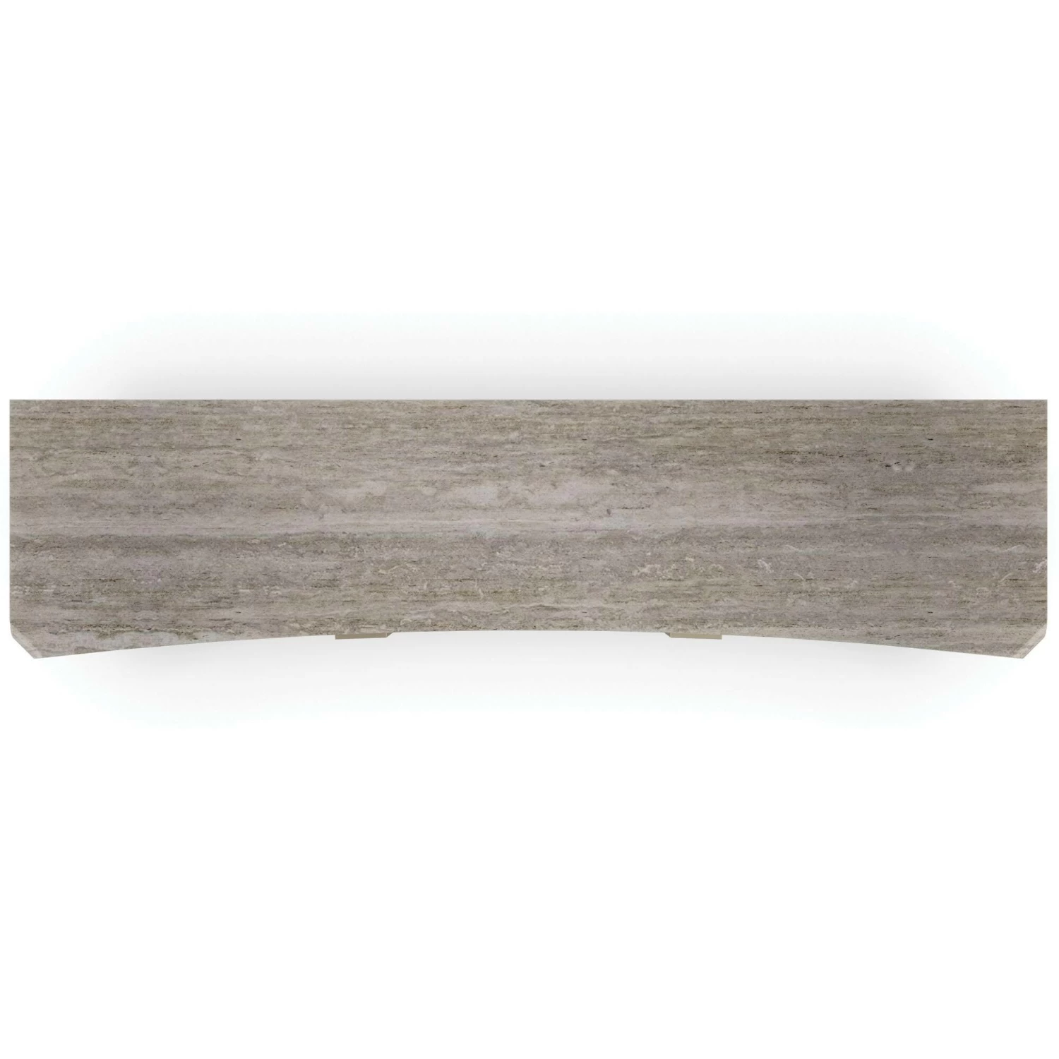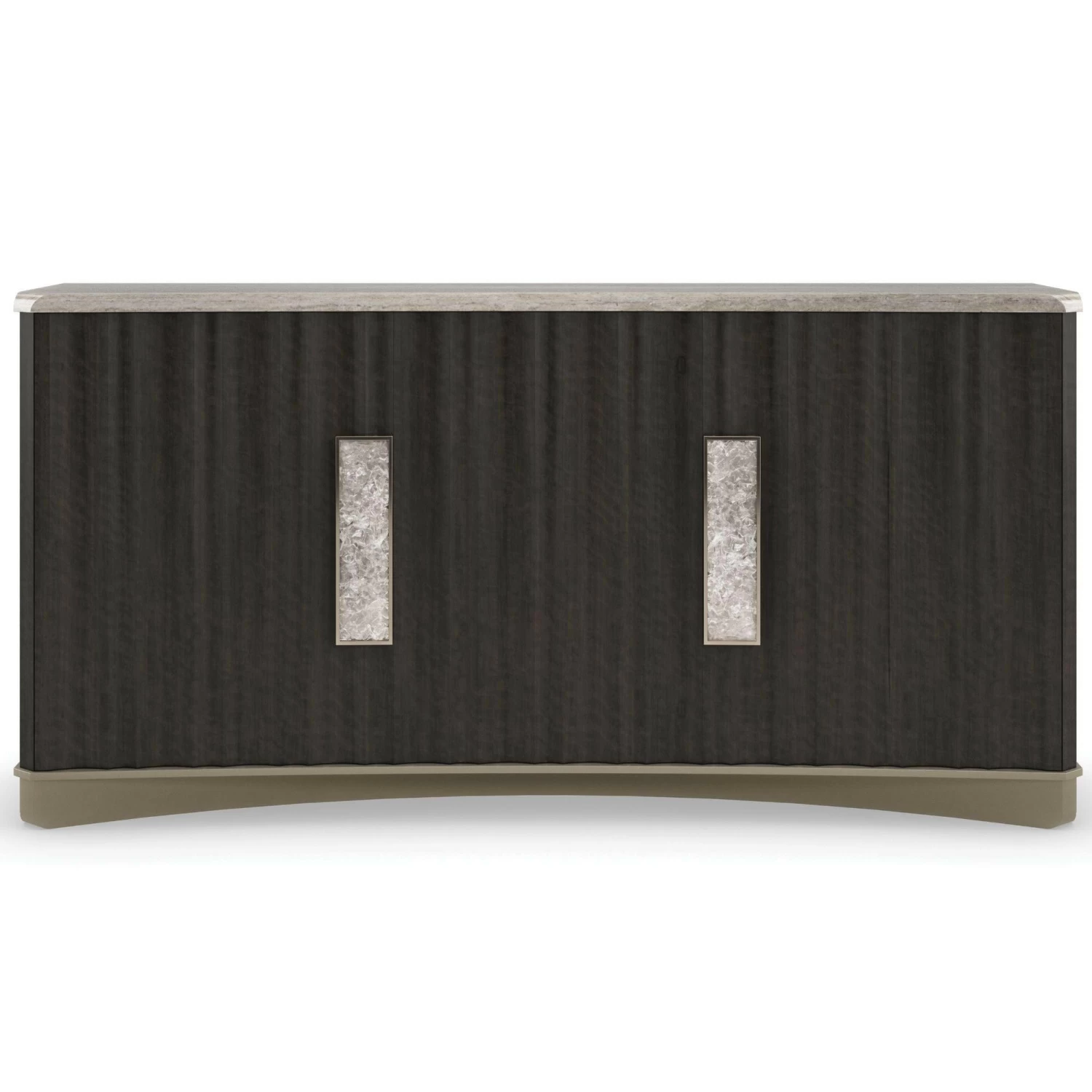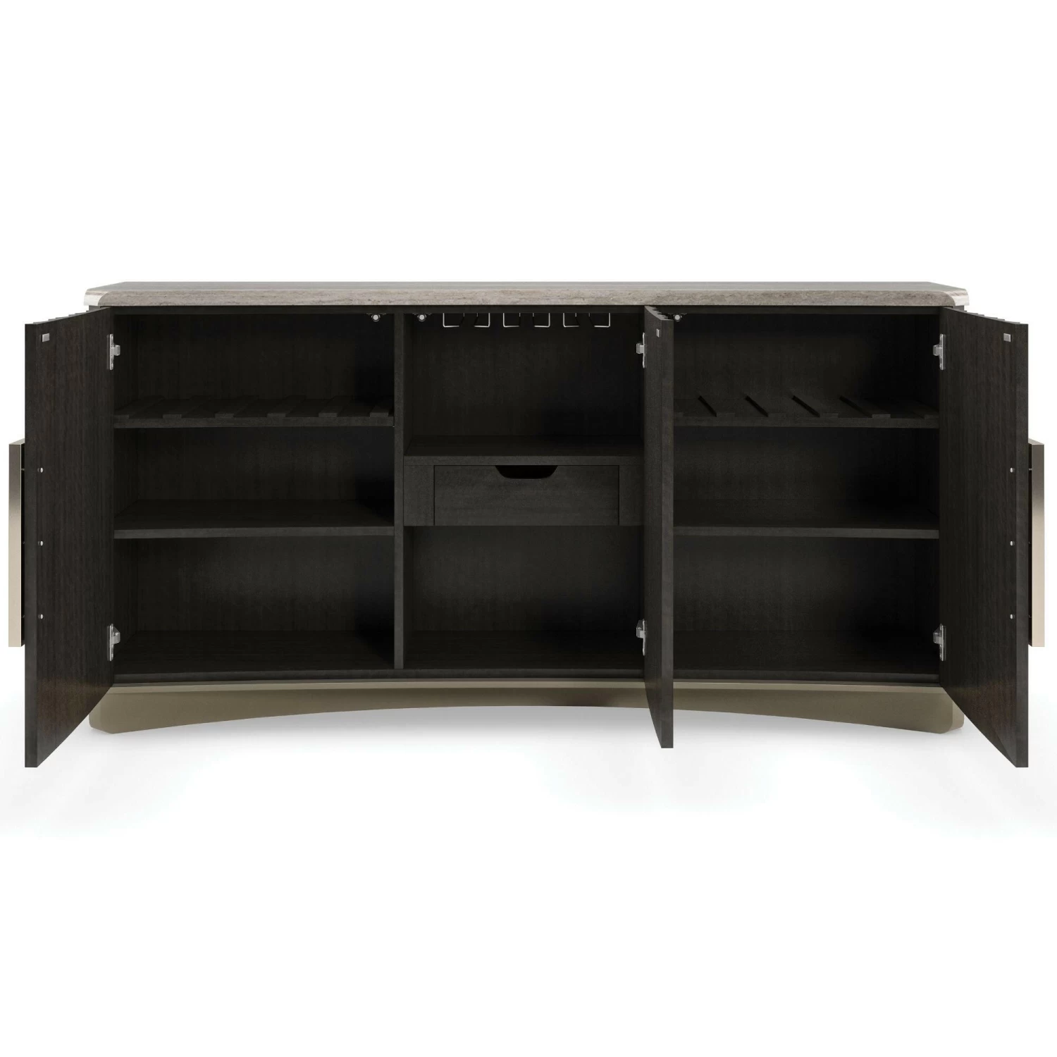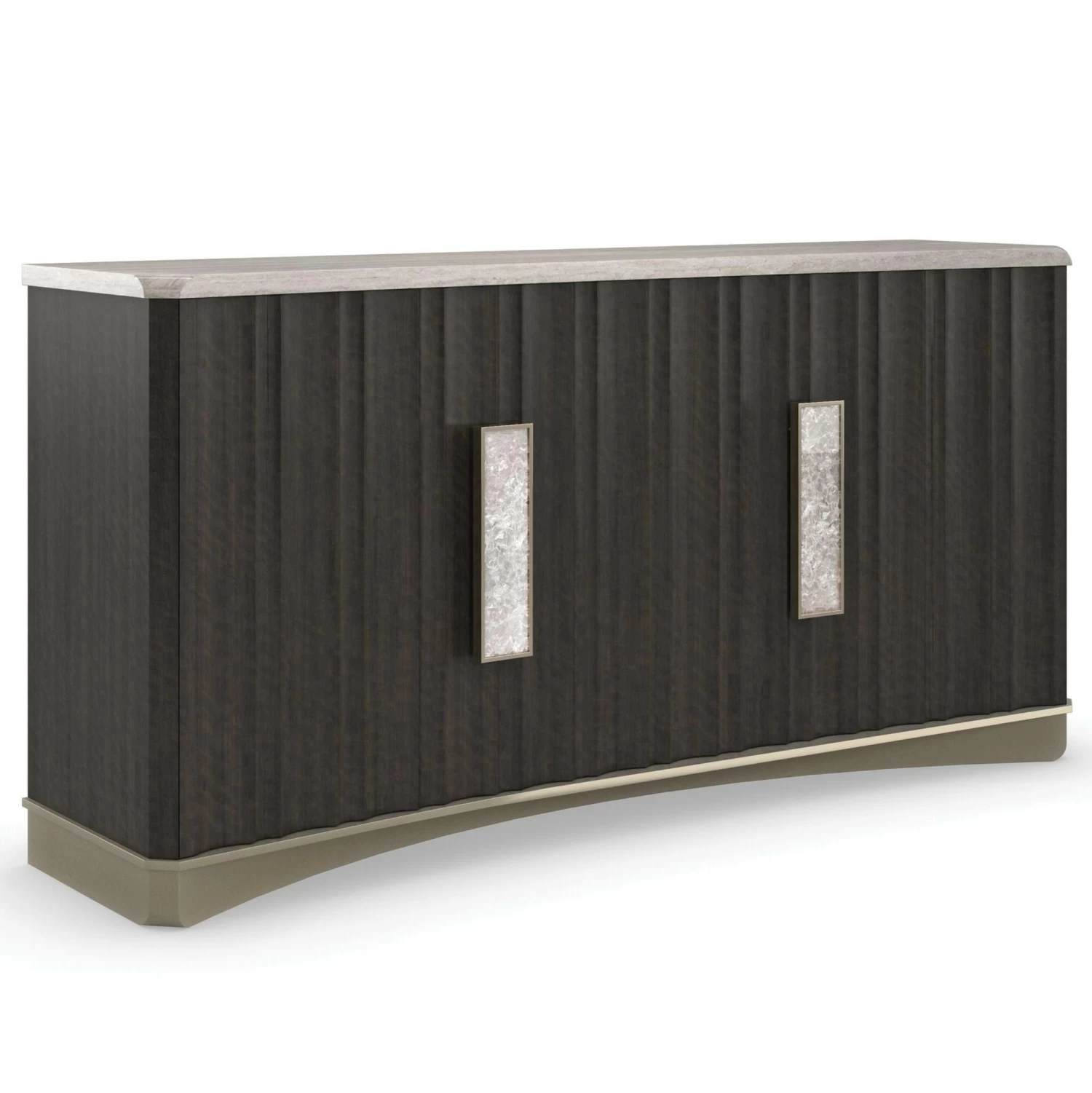 Meticulously handcrafted with a curtain-fold carving on the doors and subtly curved plinth base, this buffet makes a dramatic statement. Majestic Gold-plated, rectangular door pulls inset with crushed crystal acrylic create warmth and shimmer against its dark, Charred Bark finish. Merging form with function, it features a silver Travertine stone top and ample storage for linens and entertaining essentials, including a top shelf that flips to store stemware and bottles. Silver Travertine stone top. Case in Charred Bark. Three doors with Euro hinge. Interior behind center doors features open storage, one felt lined drawer and upper wire bottle storage. Interior behind end doors feature two adjustable shelves. Top shelf is flippable for bottle storage. Wood plinth base in Platinum. Interior in Charred Bark. Hardware in plated Majestic Gold with cracked acrylic inset. Top is a natural stone. Natural variations in color, veining and spotting will vary from piece to piece. Natural materials are porous in nature and care should be taken protect the surface.