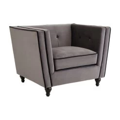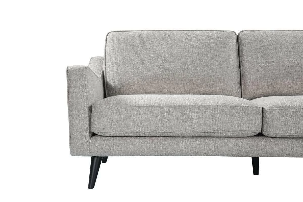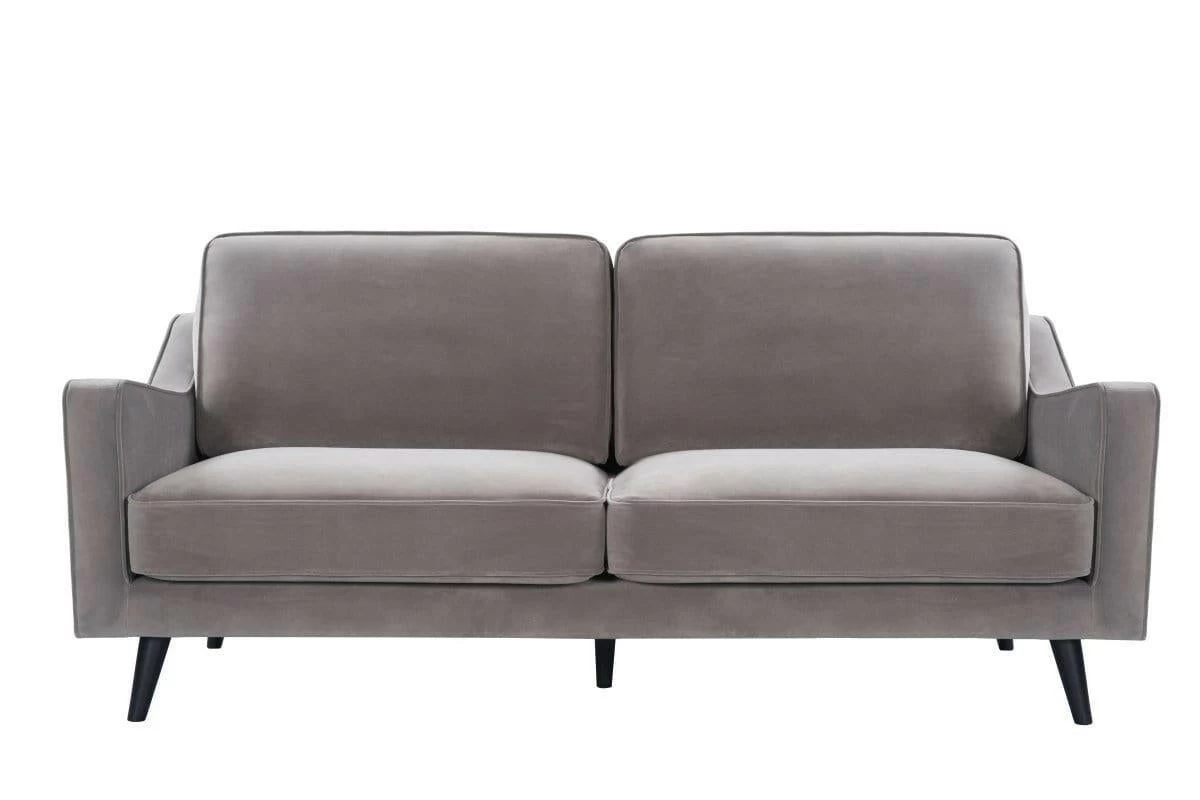 The Daffy Sofa is a luxurious and elegant compact sofa, with its unique curved arms and black modern angular legs. Its clean lines and sleek design create a focal point for any living space. The Daffy Sofa is finished in a sophisticated Mink soft velvet fabric and Greige linen Fabric.