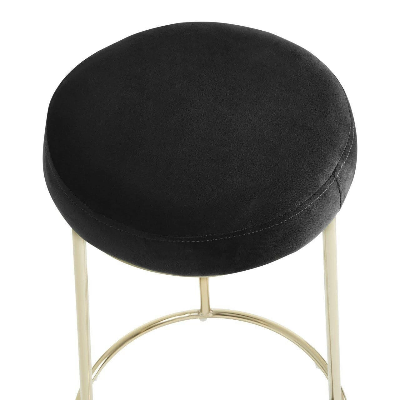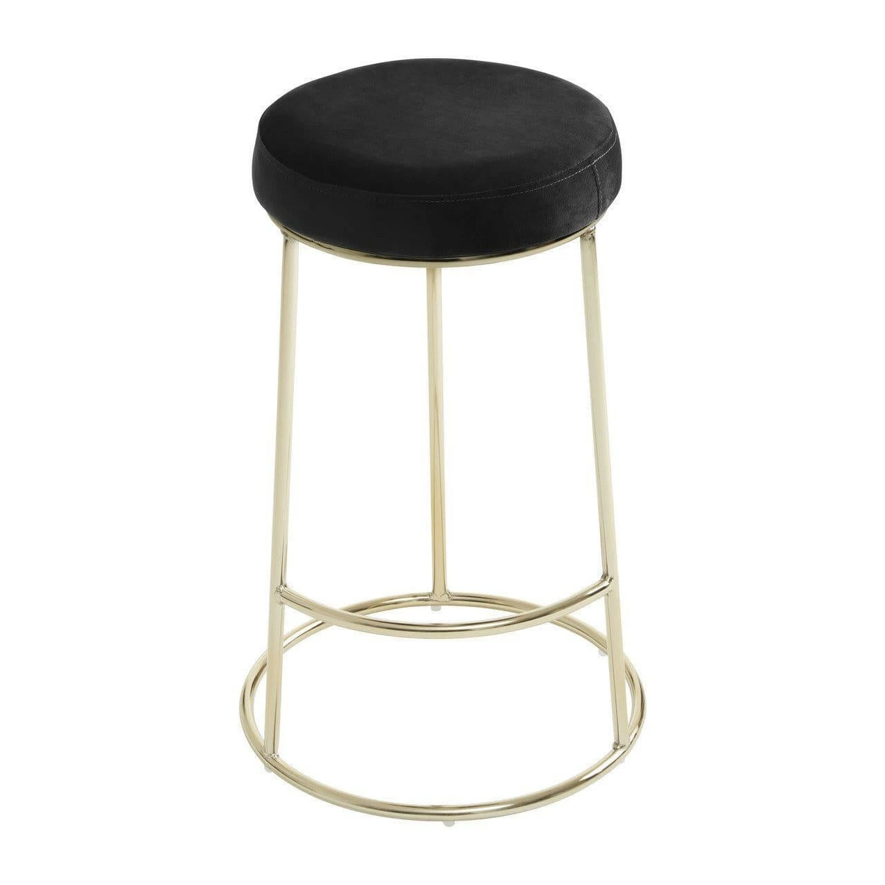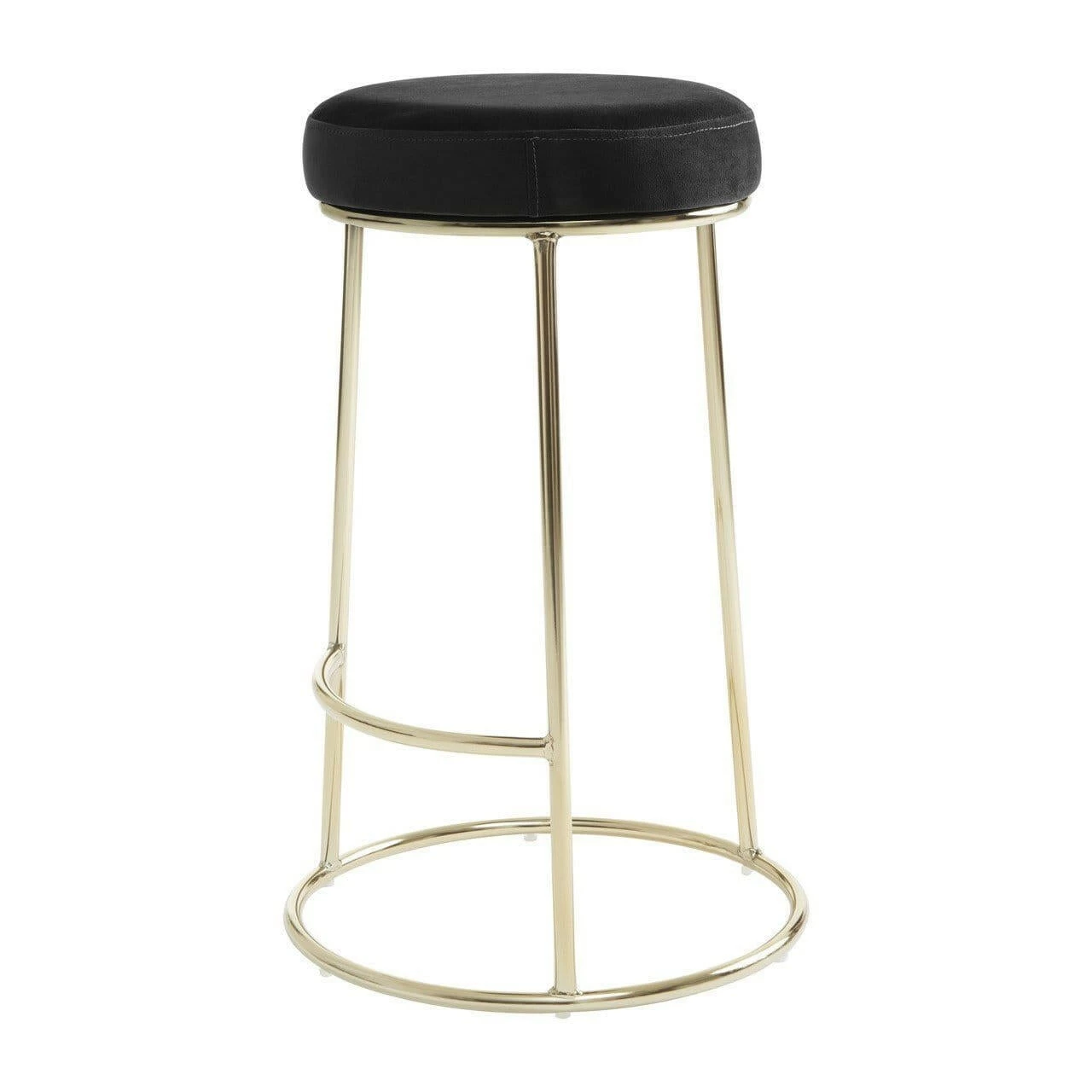 Designed for counter heights, this stool has a padded seat upholstered in black velvet. Sleek and minimal, the gold finish metal frame with footrest enhances the glam appeal of the design.