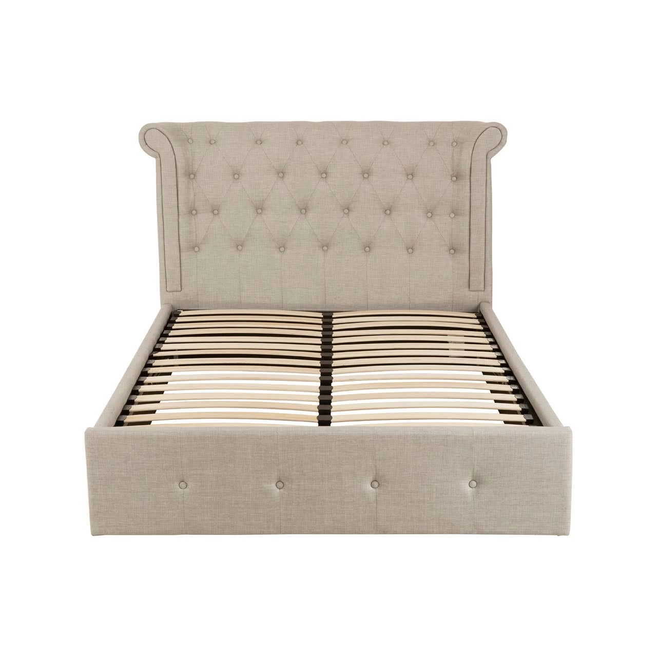 The Edison brushed velvet light grey double ottoman bed has a diamond tufted panel adding classic character to its decorative aesthetic. The soft upholstery is adorned with stud and button detailing on the headboard and footboard.