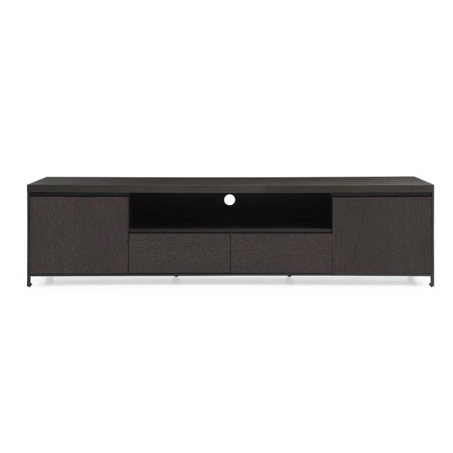 The Falcone TV Unit showcases a perfect blend of refined aesthetics and functionality, making it a standout addition to any living room. Its sleek smoke oak veneer body exudes a sense of contemporary elegance while offering a touch of warmth and natural charm. The brass foot caps on the legs add a luxurious accent, elevating the overall design. The unit features two drawers and two doors, providing ample storage space for media equipment and accessories, keeping the space organized and clutter-free. Additionally, the open space is perfect for displaying decorative items or media consoles. With its thoughtful design and attention to detail, the Falcone TV Unit complements various interior styles, becoming a stylish centerpiece that enhances both the visual appeal and functionality of any entertainment area.