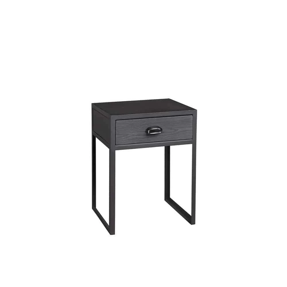 One drawer black industrial style bedside table, faux concrete top, solid oak drawer front, distressed slate grey oak, slate grey metal frame, industrial metal handle