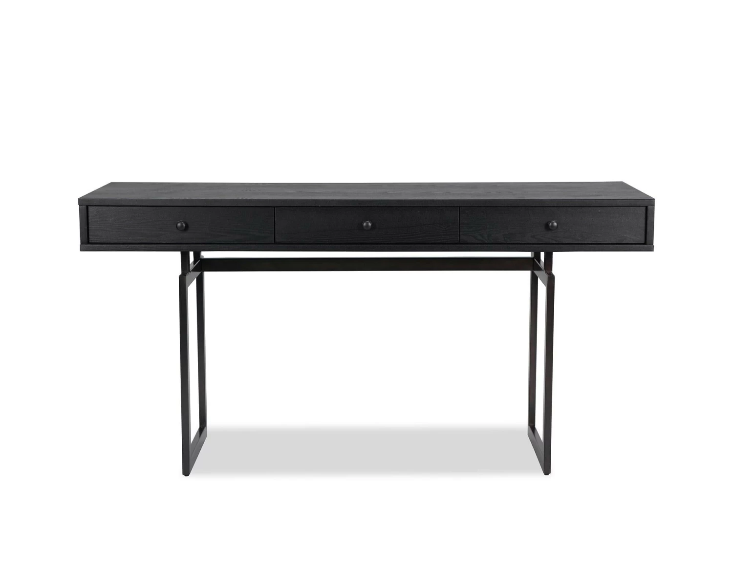 Black Ash Veneer, Powder Coated Industrial Bronze Steel Legs Refined and resplendent with a slightly rustic feel, the Hamilton Desk creates a handsome space. Supported by a mesmerising metal base in a stunning selection of finishes, the desk is an uncomplicated addition for both the office or lounge. Also suitable for use as a captivating console, the Hamilton is ideal for the larger entrance halls or even in the spare lounge space. A truly attractive addition, it can be topped with a statement lamp or your favourite photo frames.