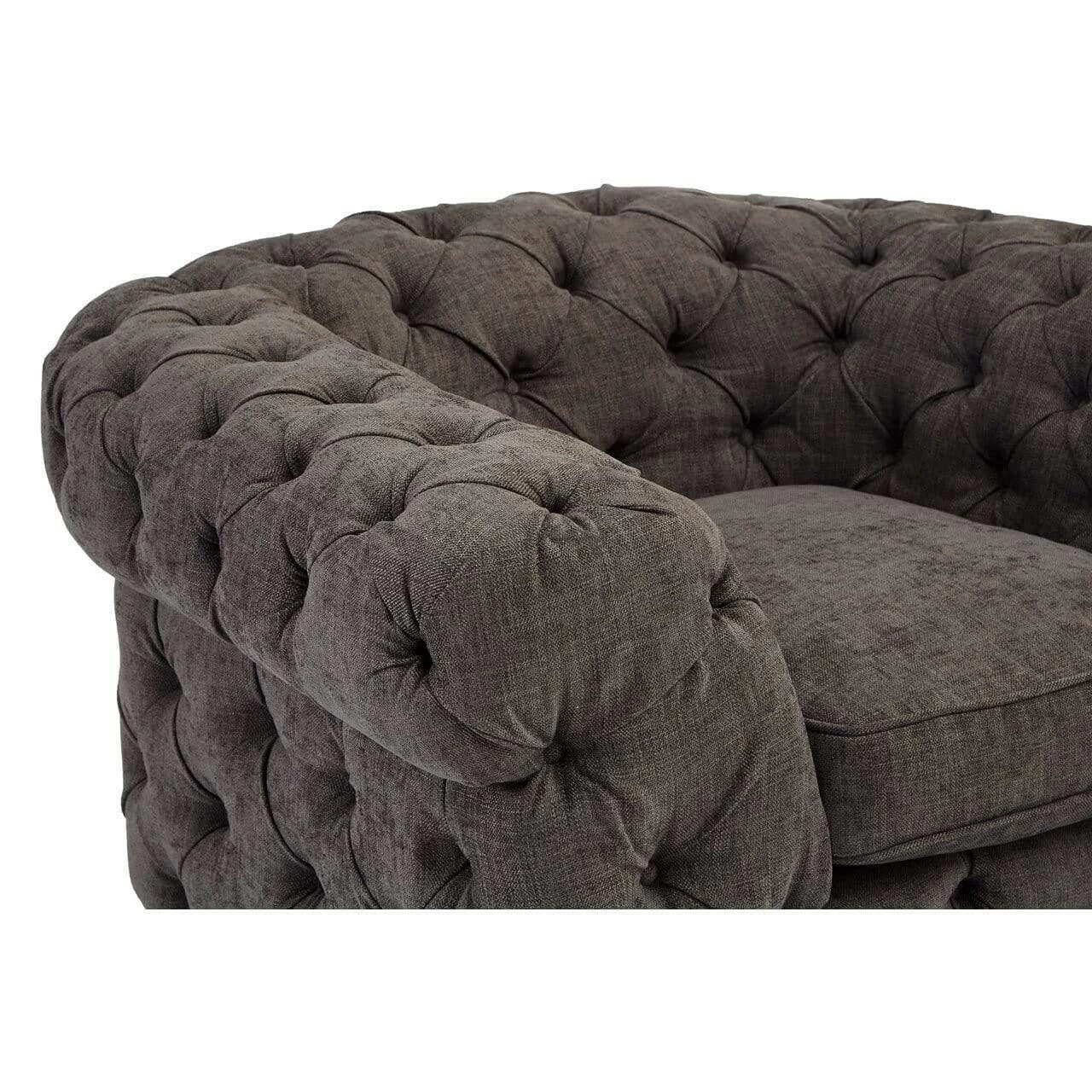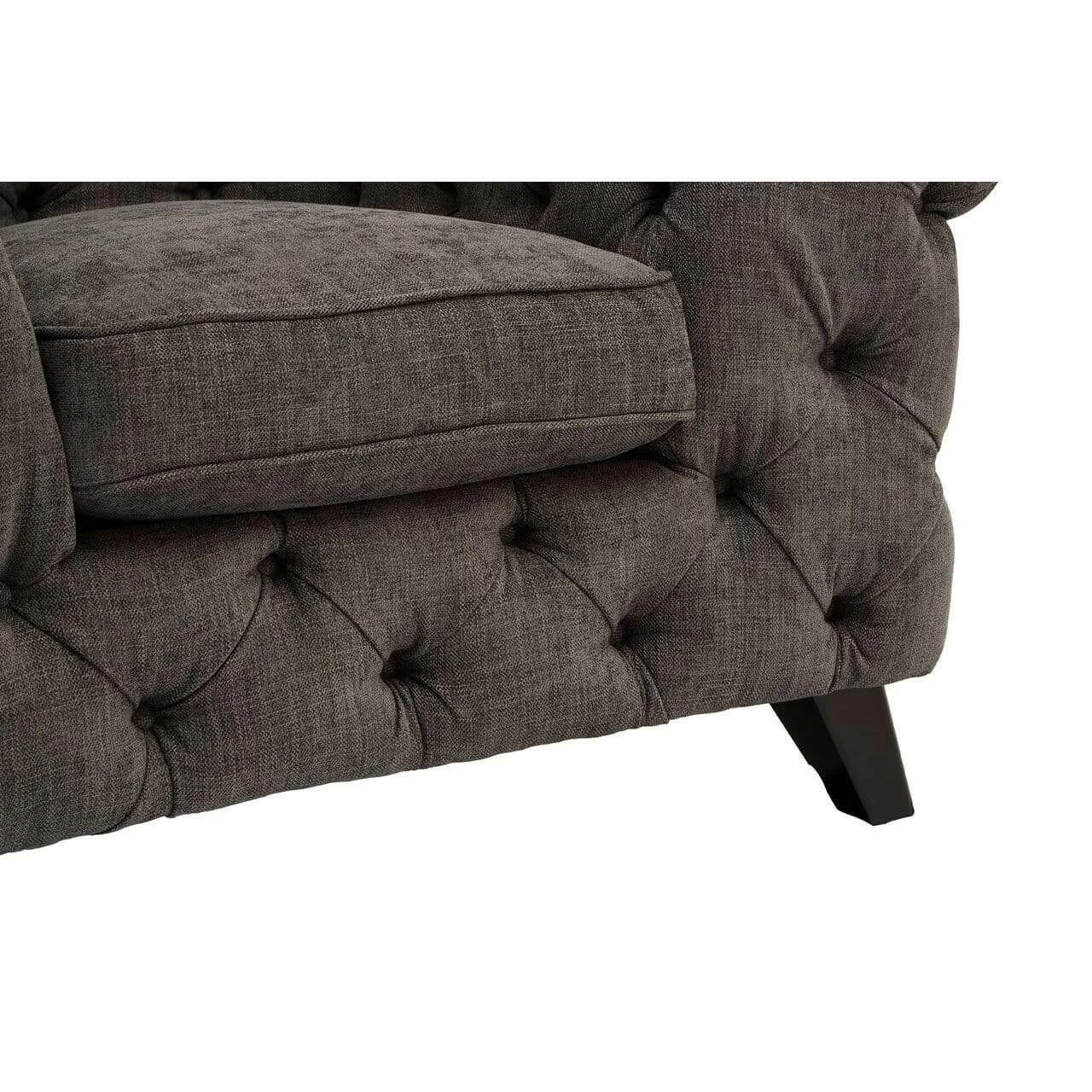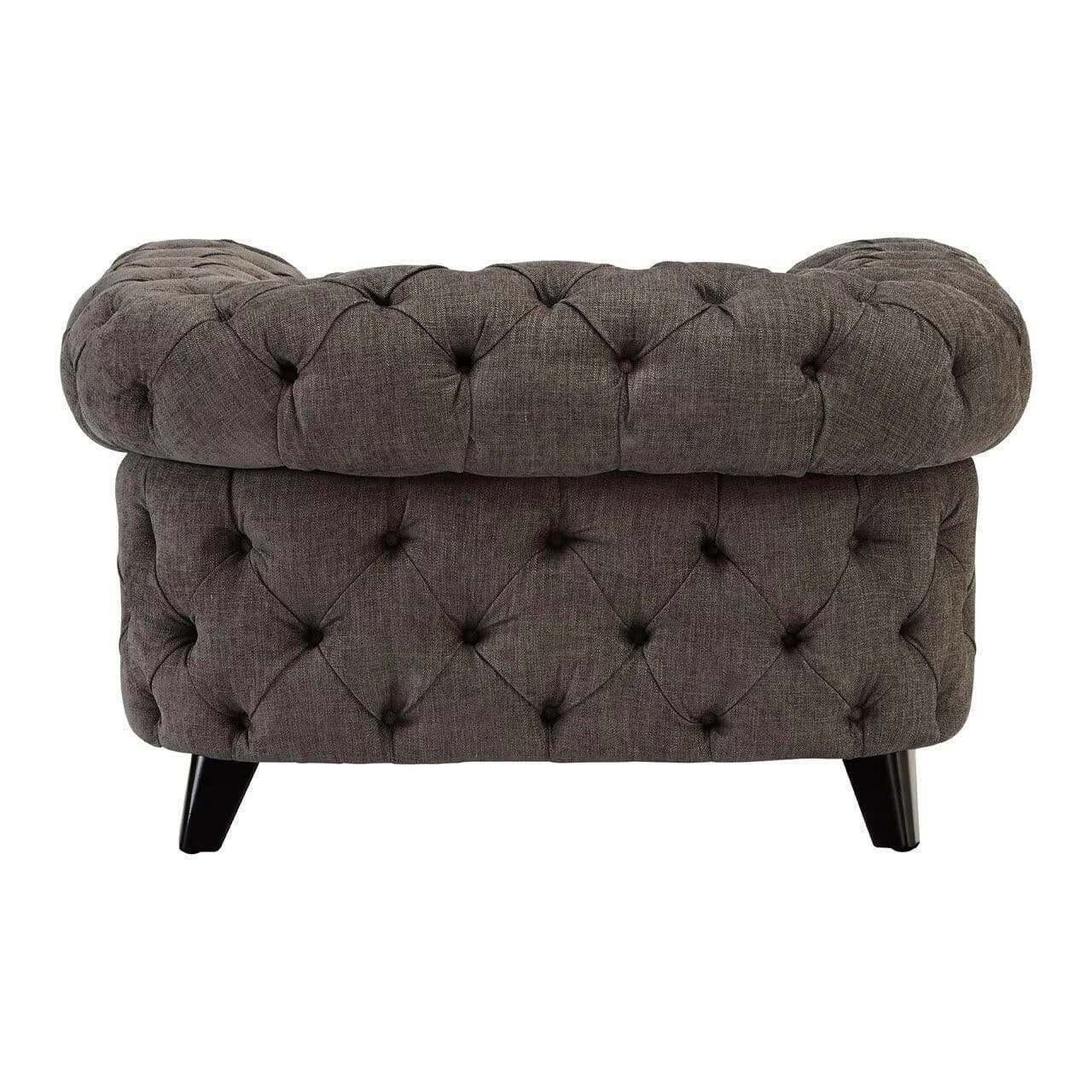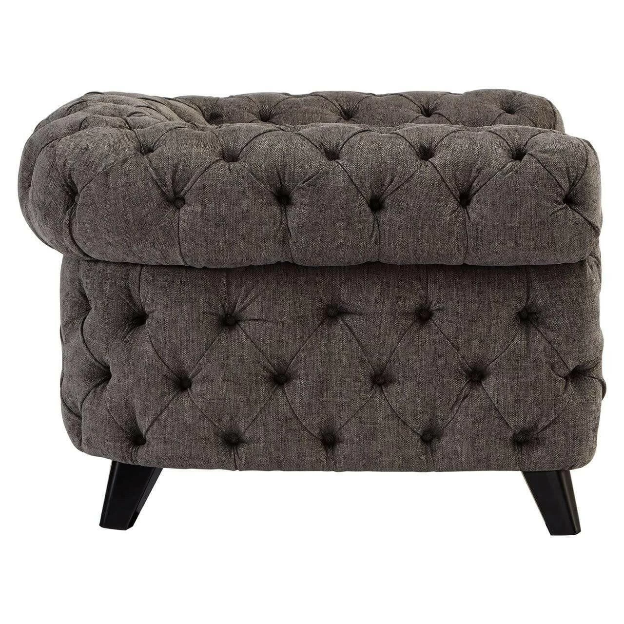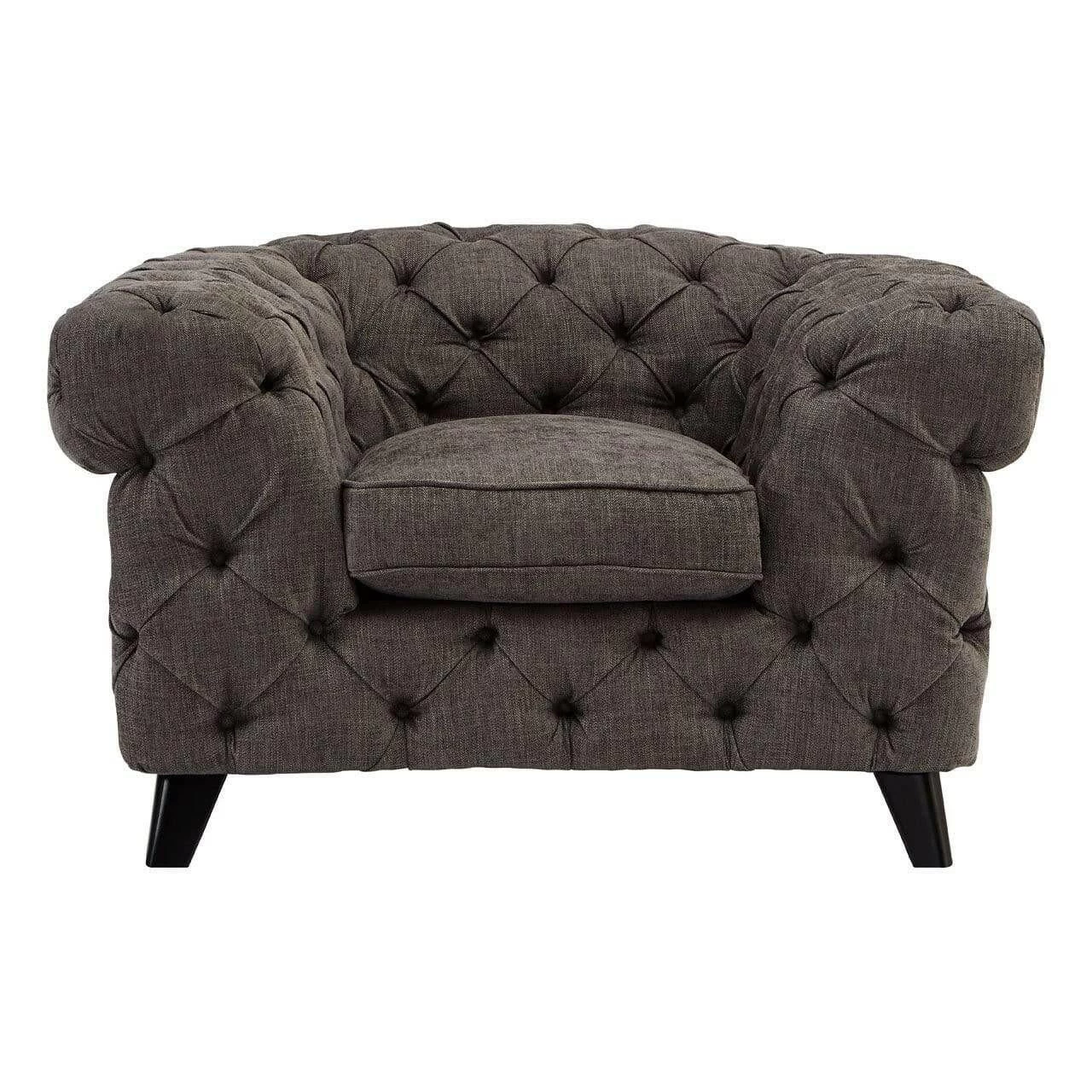 Angled legs, crafted from smooth pine wood, support this classically inspired chair. Their matte black finish complements the luxurious dark grey fabric upholstery, which itself is tufted for a refined look. A smooth cushion is enveloped by thick padded armrests, their rounded form corresponding with the chair’s low profile u-shape design.