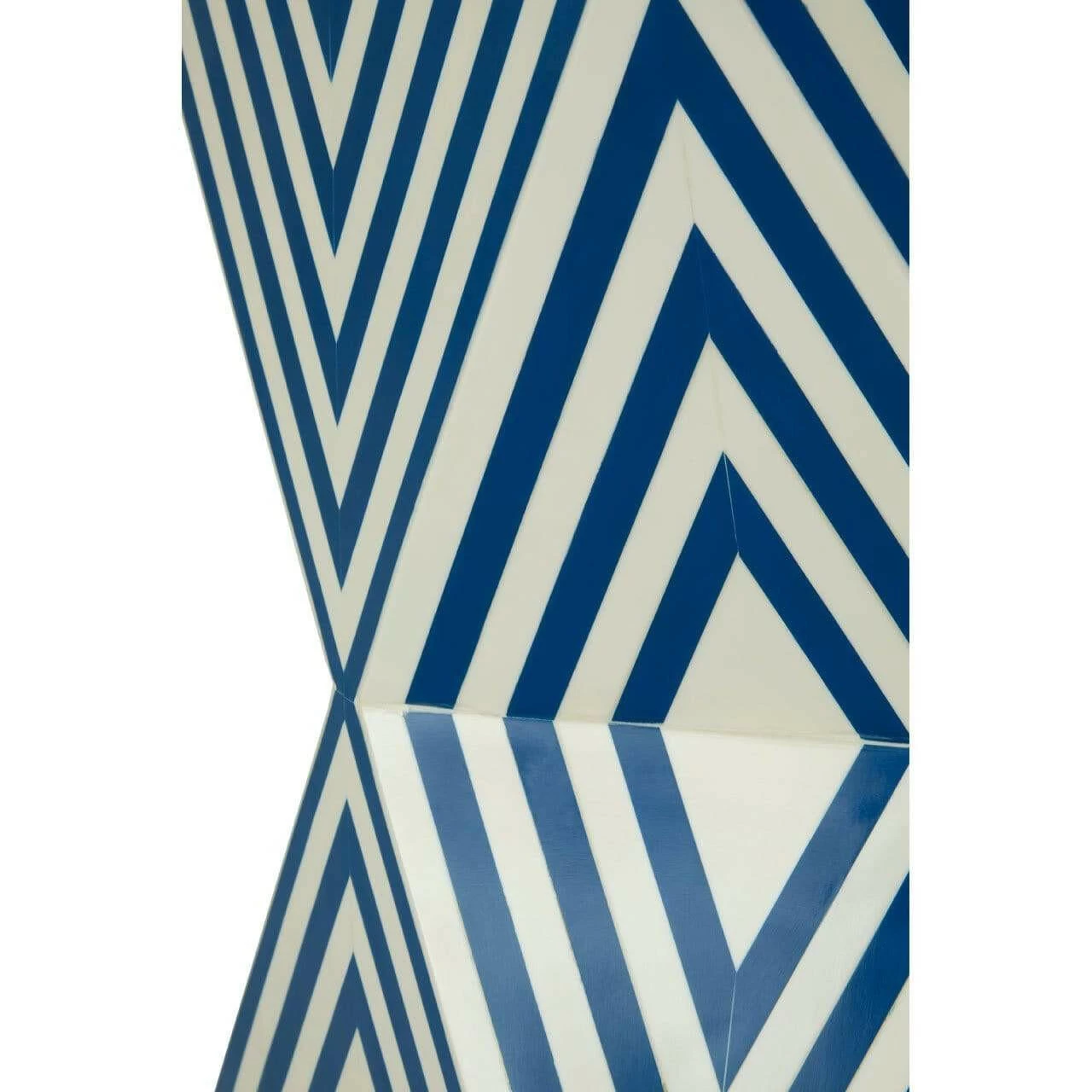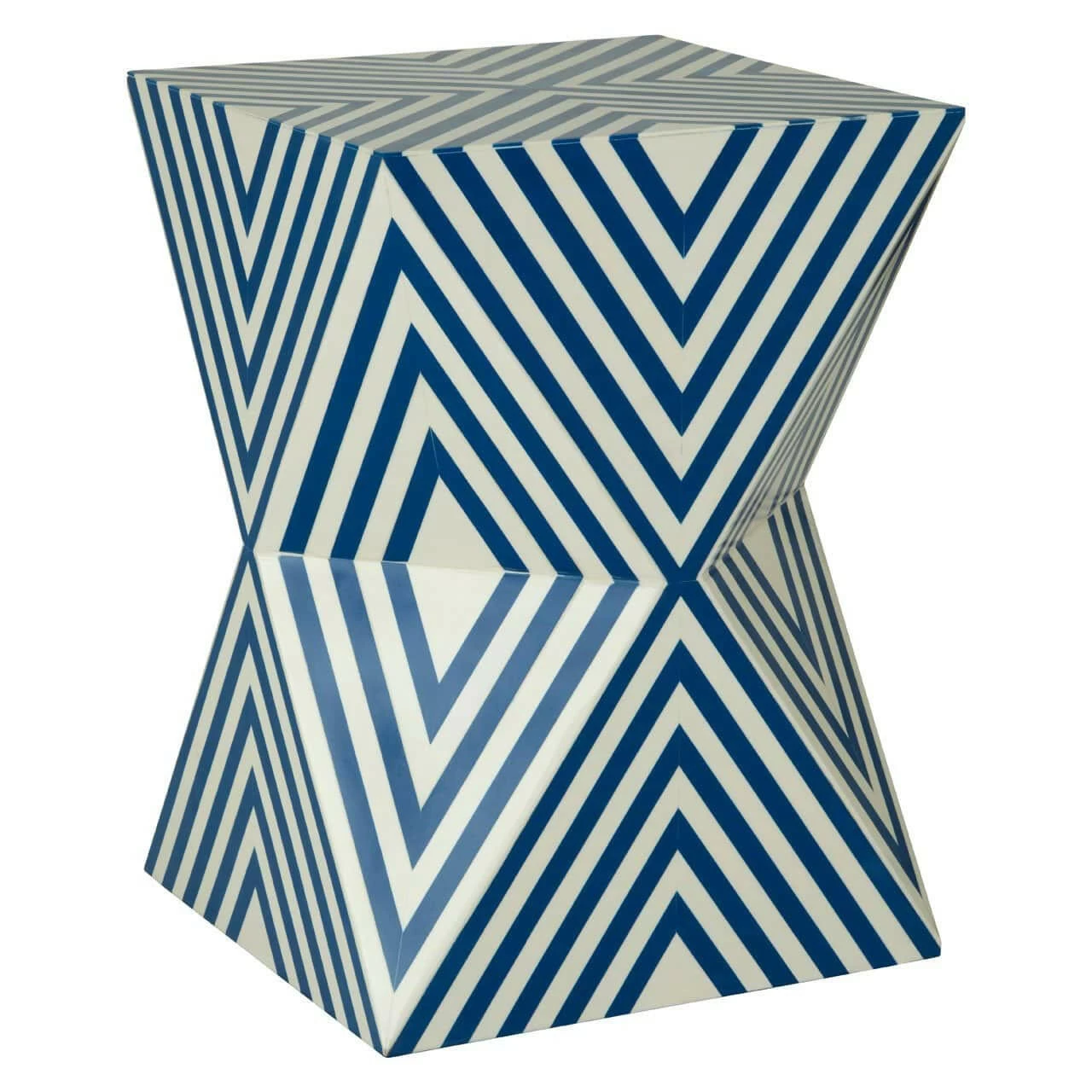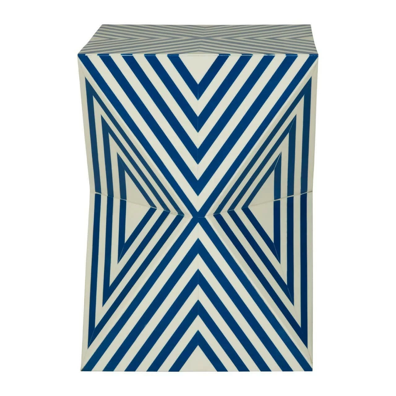 The Hasso stool is covered with smooth resin for a tactile finish, and features a white and blue linear pattern that accentuates its 3D design.