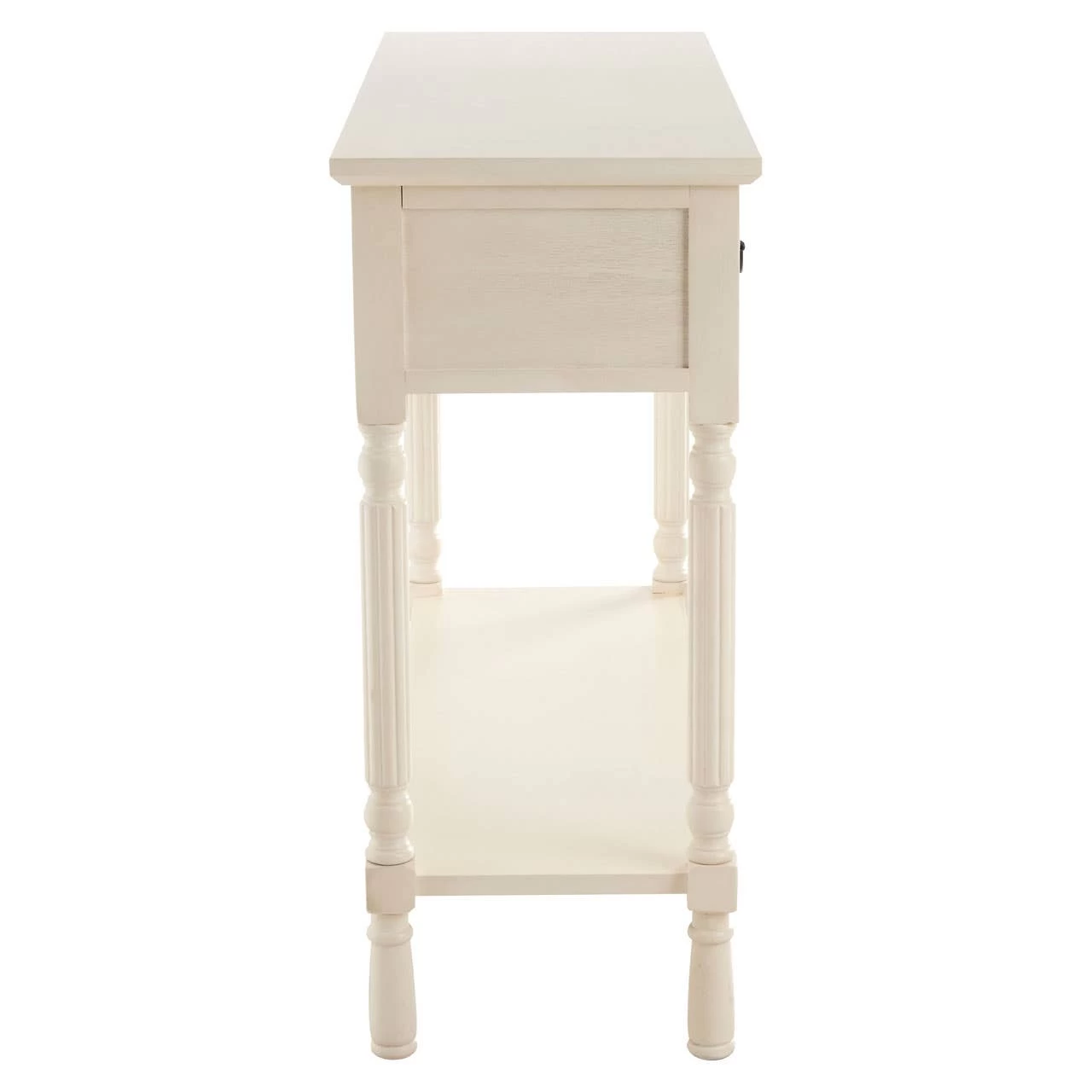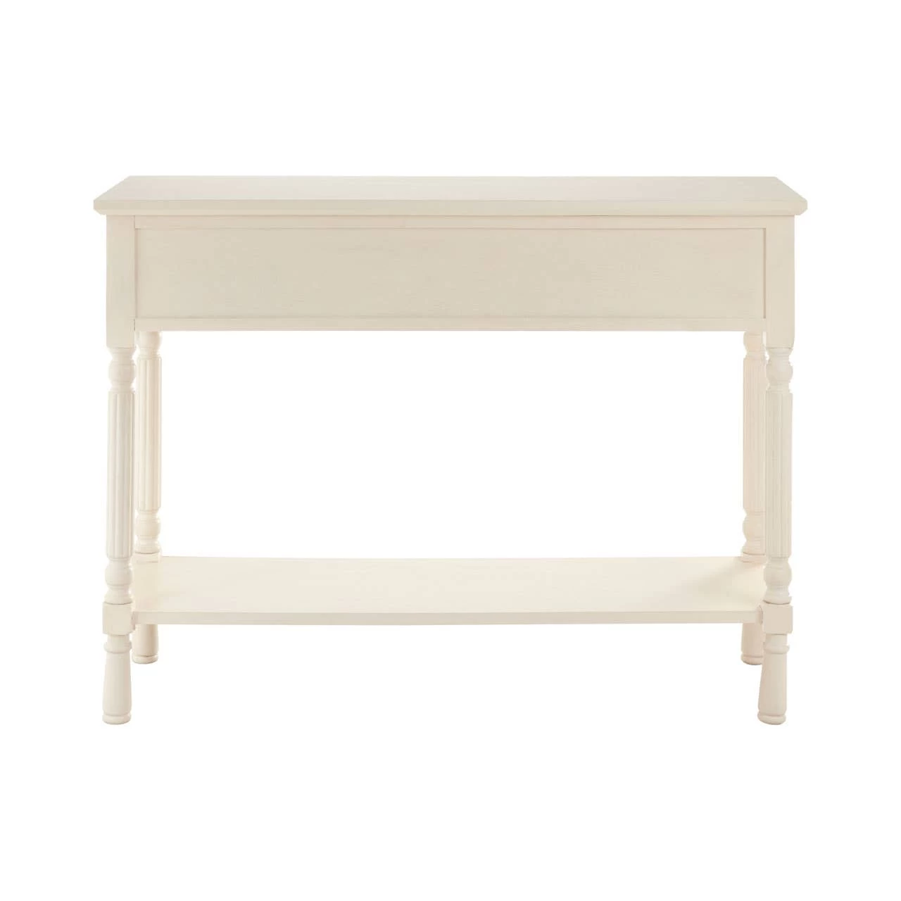 This 3 drawer console table has a rectangular top with bevelled lower corners that coordinates to its bottom shelf. Each of its three sliding drawers has an antique silver metallic handle contrasting table’s light tone finish. Standing on carved spindle legs, it will make a statement in the living space or hallway.