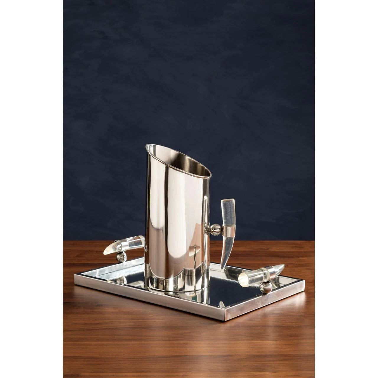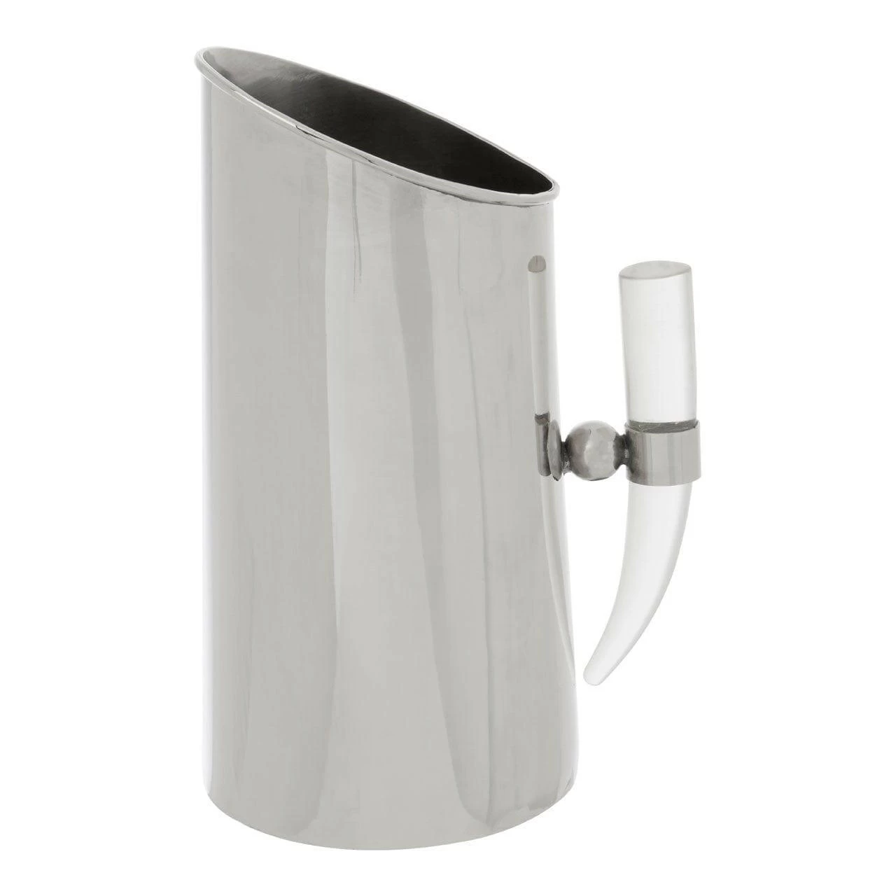 Crafted from robust silver finish steel, this pitcher boasts a smooth surface in a glazed finish. The pitcher has an angular edge coordinating with straight sides. The curved acrylic horn handle clasped in the silver ring provides a secure grip.