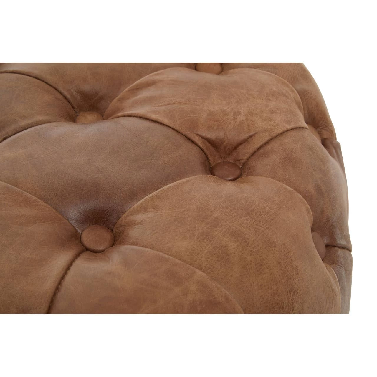 The Hoxton round ottoman is a classic for a reason. Tufted vintage brown leather creates a strong stately presence.