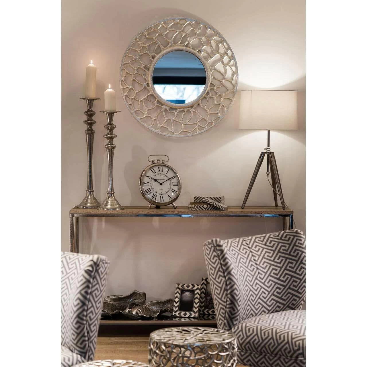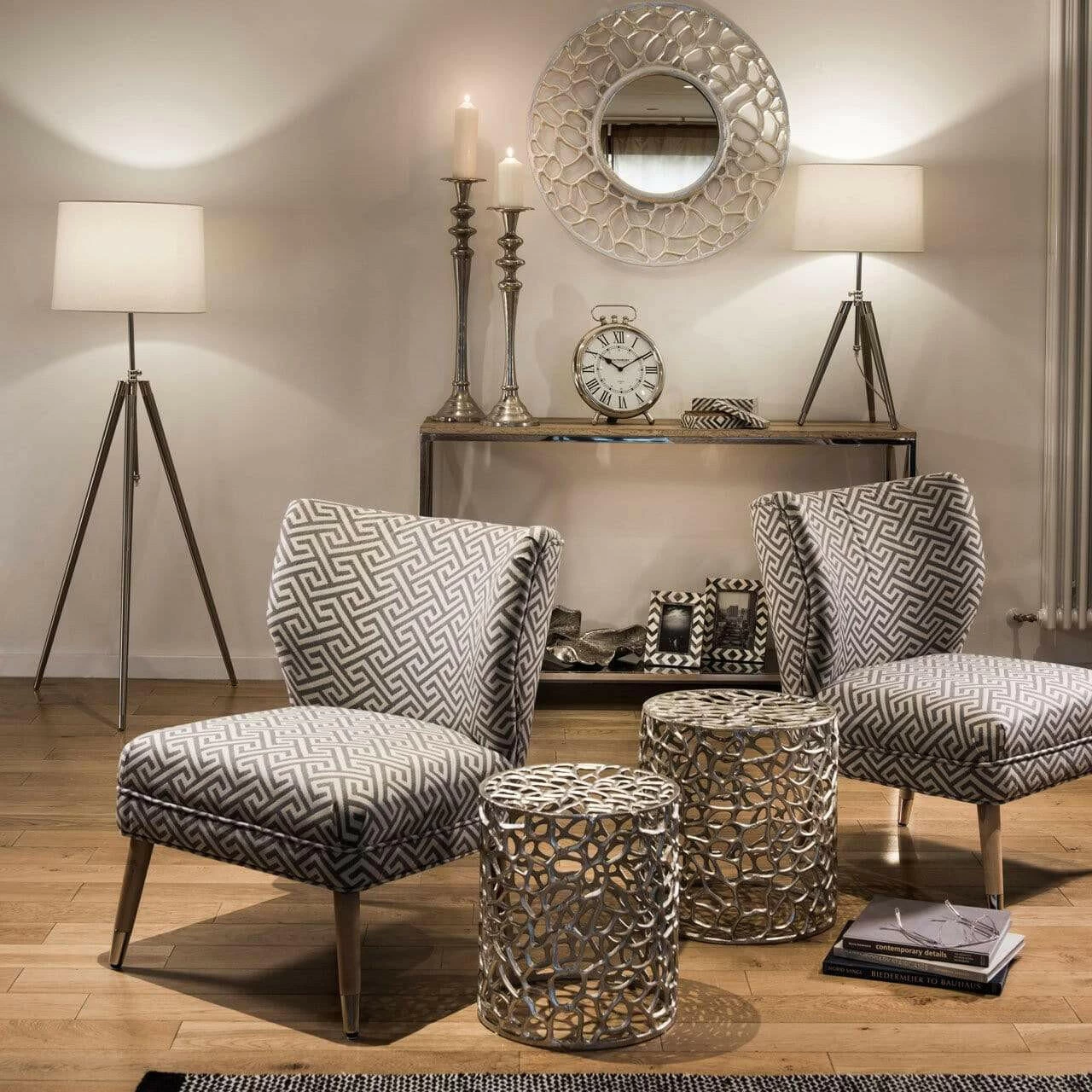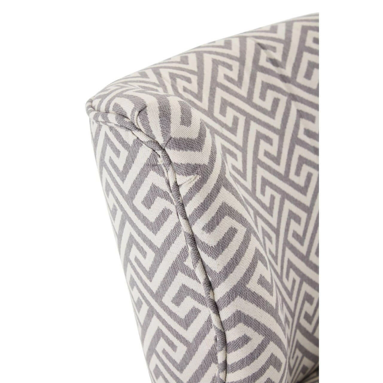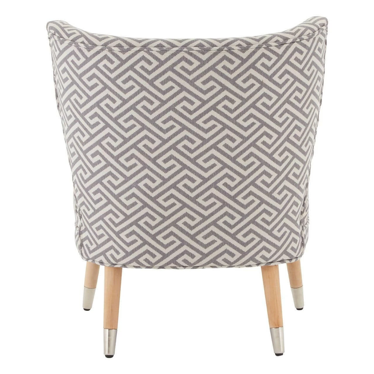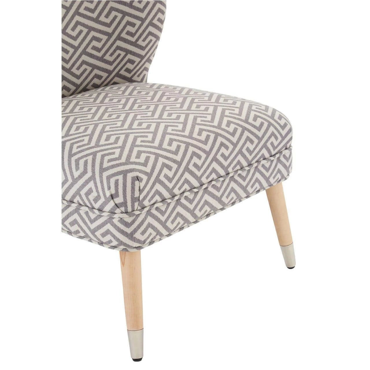 Its cushioned seat and backrest make this chair a joy to sink in to, while the distinctive beige and grey Greek Key pattern design gives it visual appeal. The chair stands on four environmentally friendly rubberwood legs, each one slightly angled, and covered with reflective metal at the bottom. Display it as an accent piece in a mono tribal-styled room.