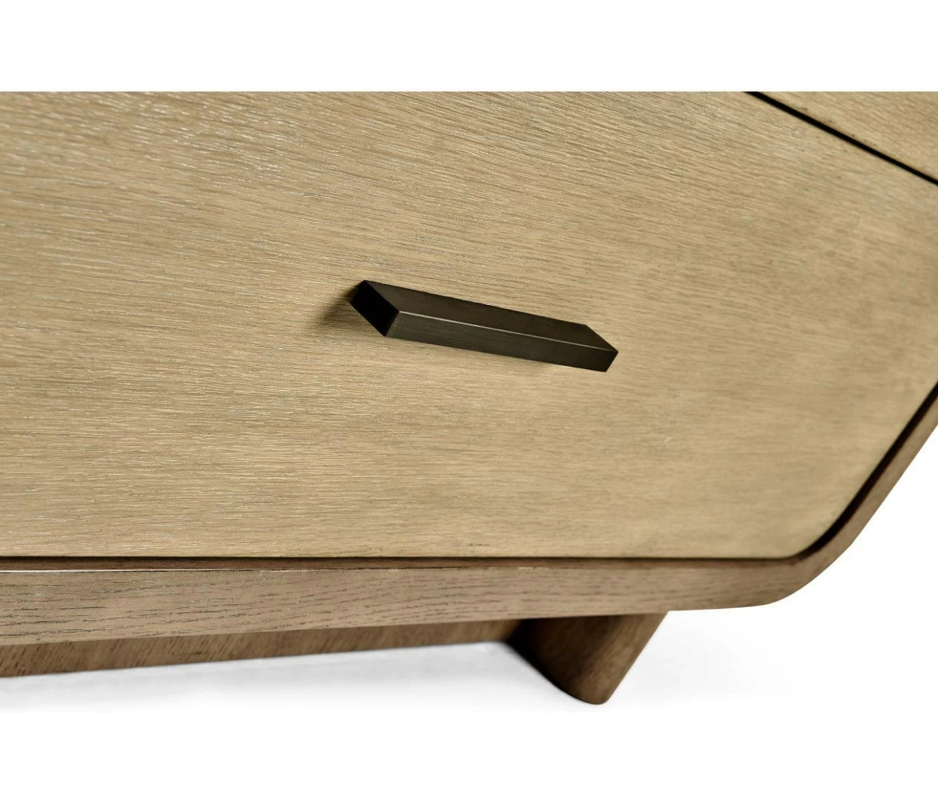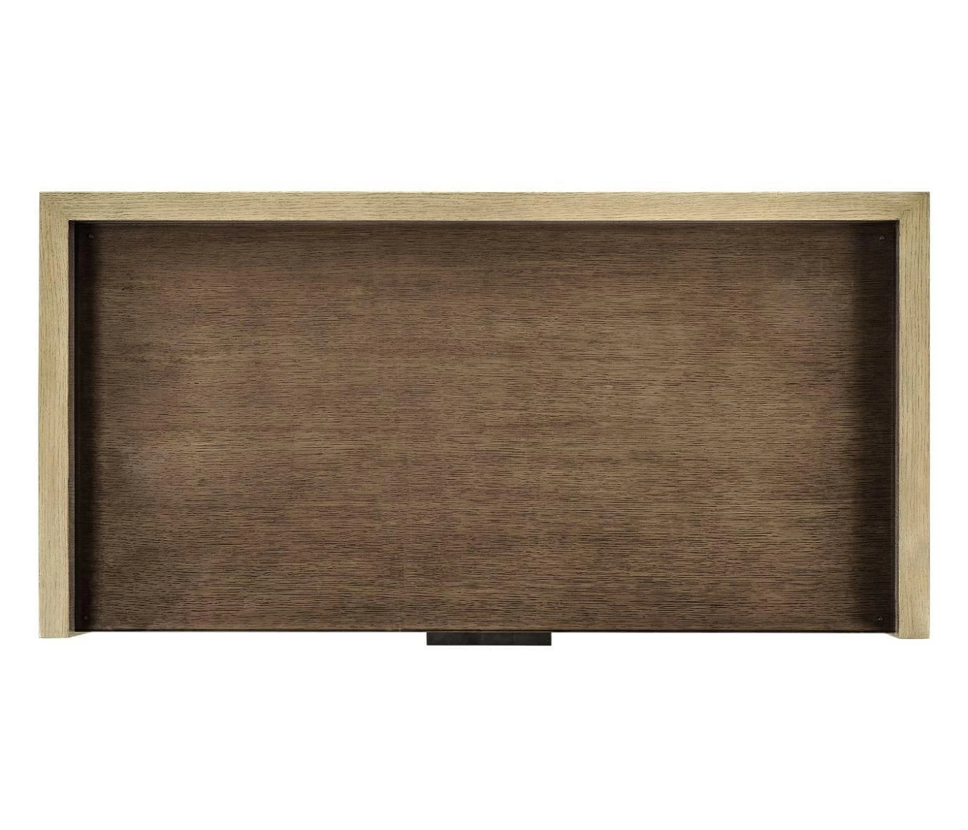 Constructed from American white oak with a lightly textured, ceruse finish. Top displays a bronze glass cover. Pulls are cast from brass with a dark, natural patina.