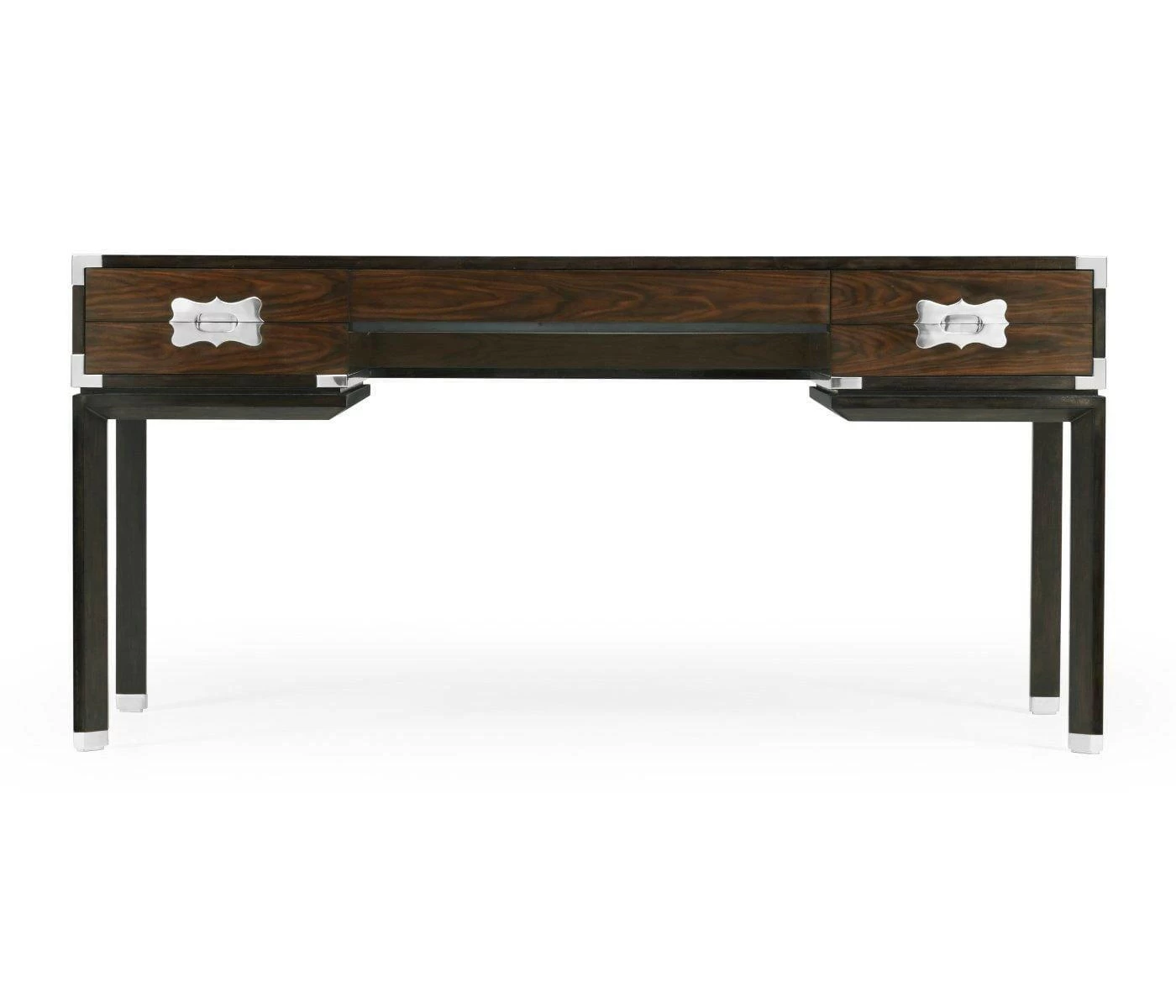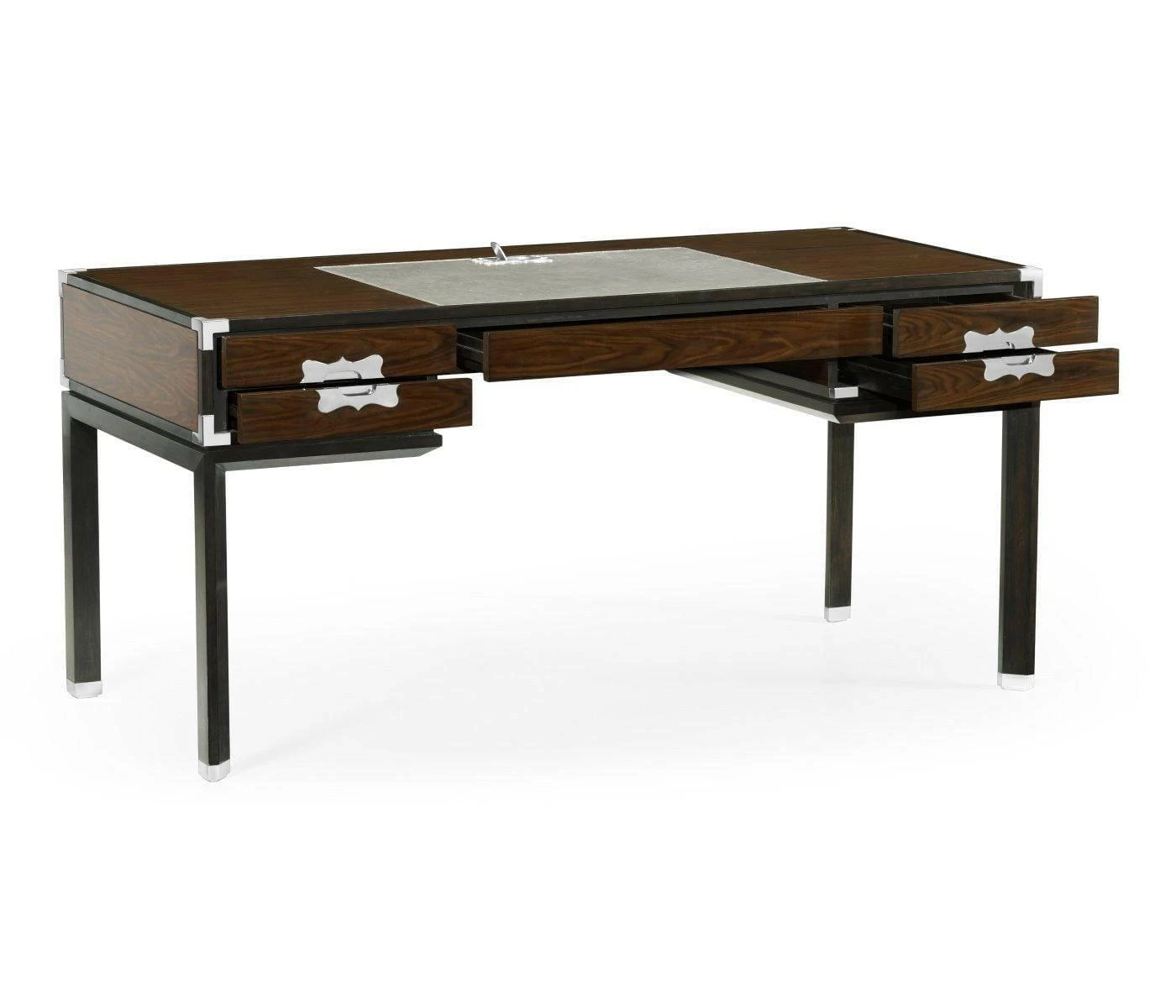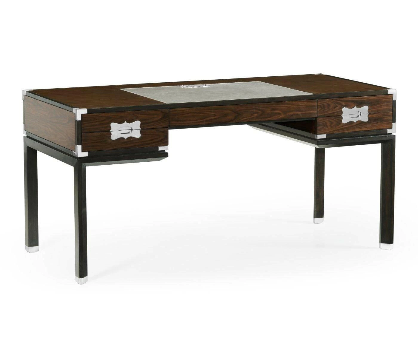 Influenced by 19th and 20th century originals historically made for British military generals who relied on the furniture’s quick assembly and ease of mobility, the aptly titled Campaign Collection incorporates classic design elements – brass corners, strapwork handles, X frames – into modern silhouettes that speak to an elevated form of travel-inspired luxury furniture. Black croc-embossed leather and rich Santos rosewood reign supreme in the collection’s palette, while white brass accentuates the iconic hardware of the style and soft grey leather adds levity to the dark colours.