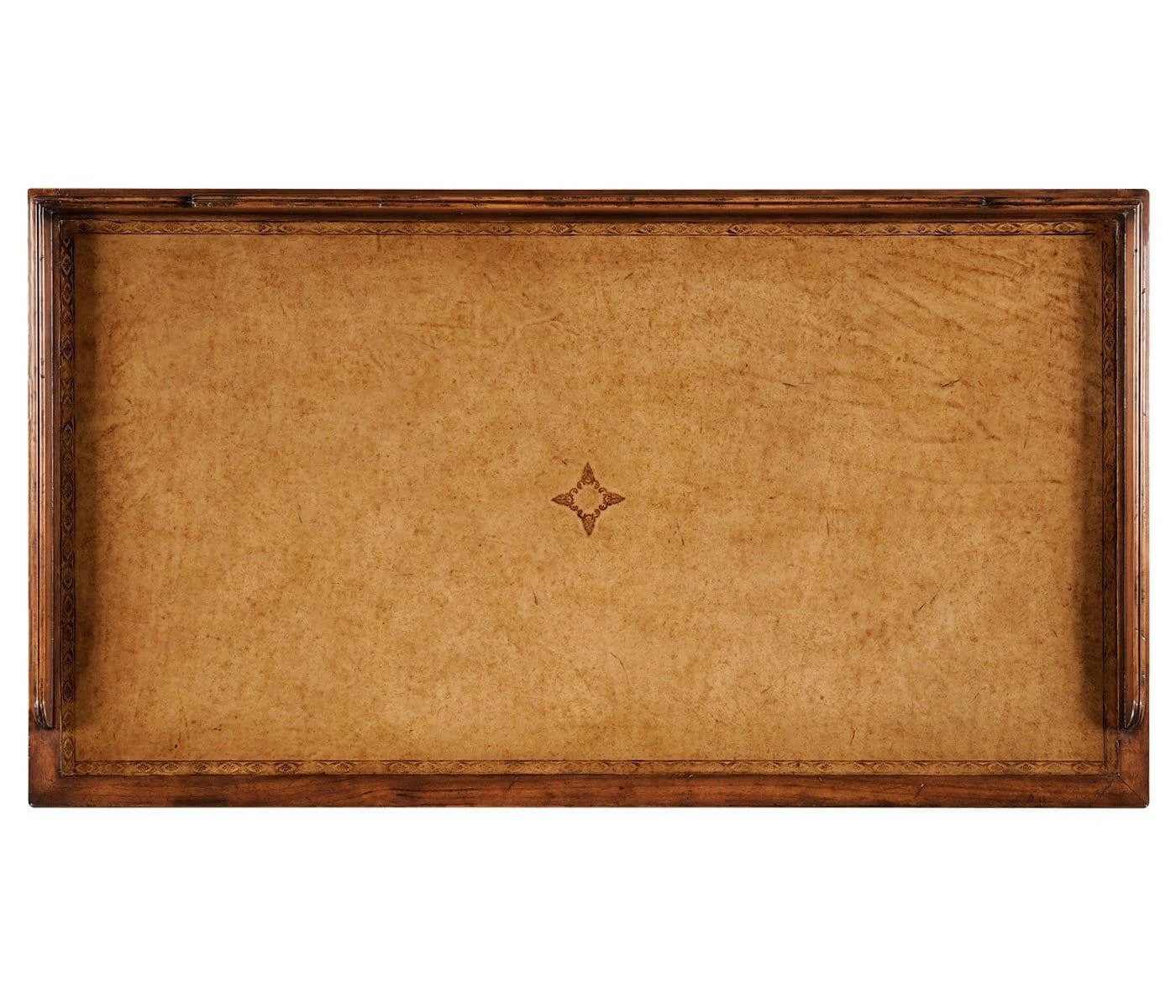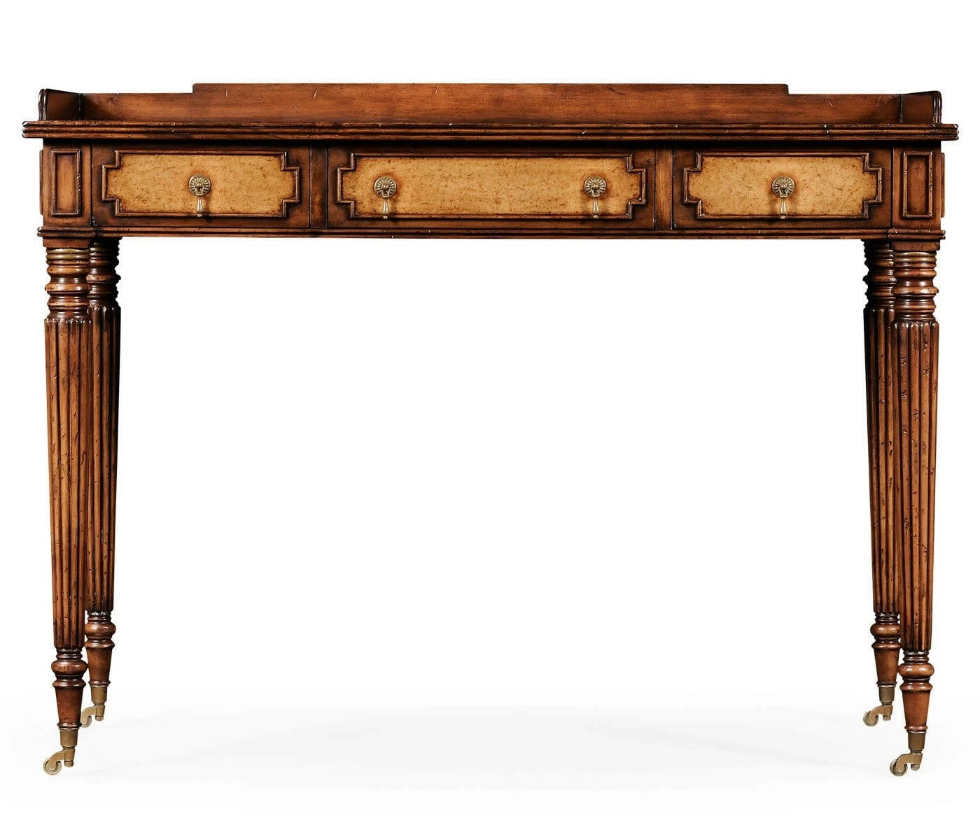 Walnut dressing table with three panelled and leather inset drawers and antiqued leather top. Beaded back and side rails the whole raised on tapering fluted legs terminating in antiqued brass castors.