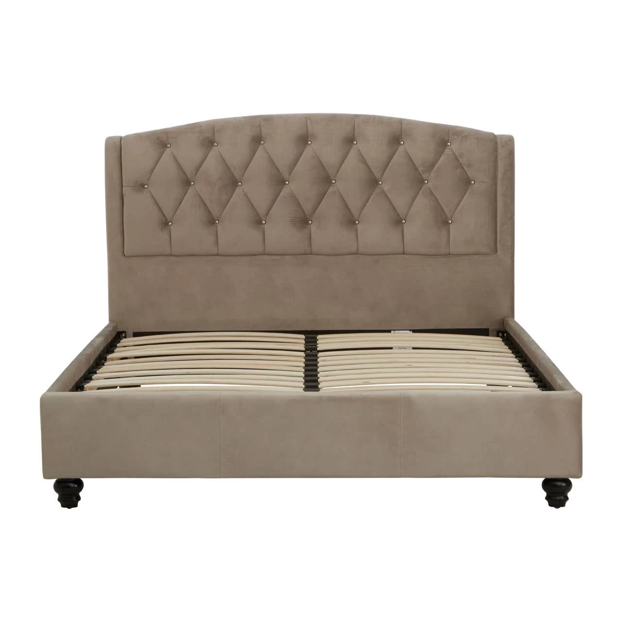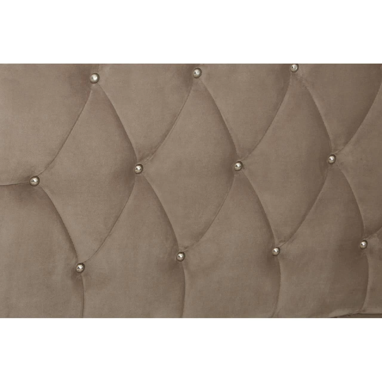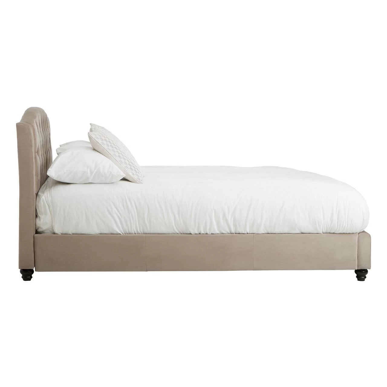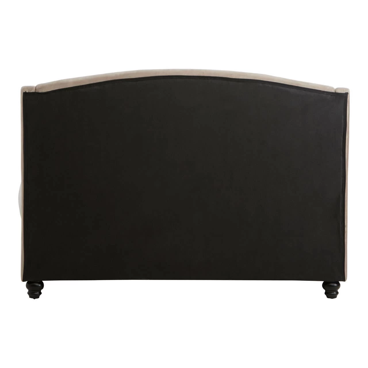This bed has a tall, arched headboard in diamond patterned tufting that creates a striking visual appeal and provides a comfortable support to the back. The metallic button detailing complements the sumptuous cushioning and furthers bed’s elegant aesthetic. The renewable pine wood frame ensures sturdiness while black finish orb feet keep it stable above the floor.