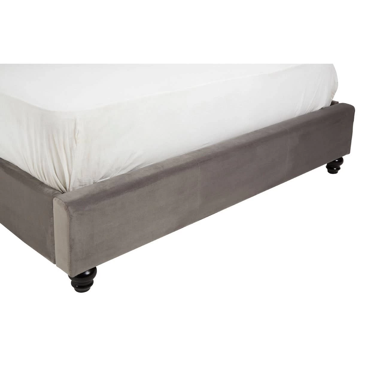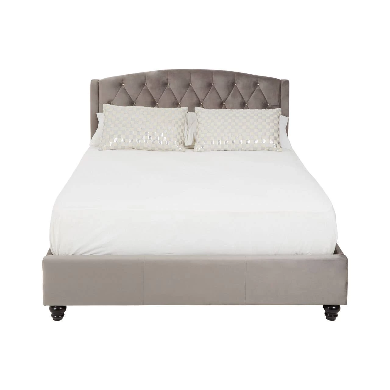 This statement bed’s arched headboard is upholstered in plush, brushed steel velvet and features diamond tufting. Finished with a stud detail that contrasts the muted shade, it combines style with sophistication.