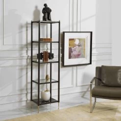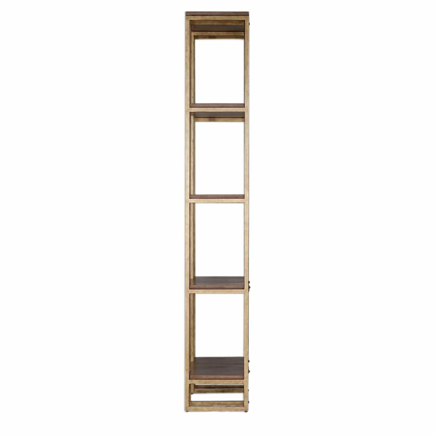 Easily Display Items On This Transitional Etagere, Finished In A Brushed Antique Gold And Accented By Four Acacia Veneer Fixed Shelves In A Rich Dark Walnut Stain. Uttermost Uttermost is a family owned and managed US interior brand with an extensive range of furniture , lighting & accessories with an upscale luxury aesthetic. We have some of the of the most talented designers in the industry creating fresh and unique complimentary collections to beautify your home. While we are focused on bringing you the most fashion-forward products in the industry, we know that good design means nothing without quality manufacturing. You can be certain that no shortcuts are taken in manufacturing to make sure our products exceed expectations.
