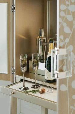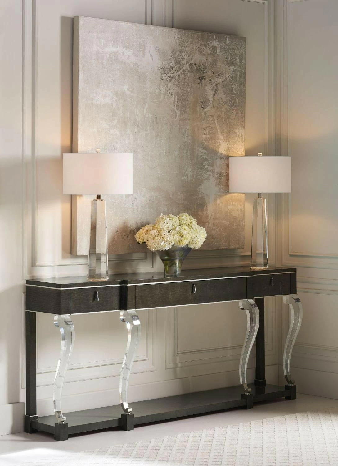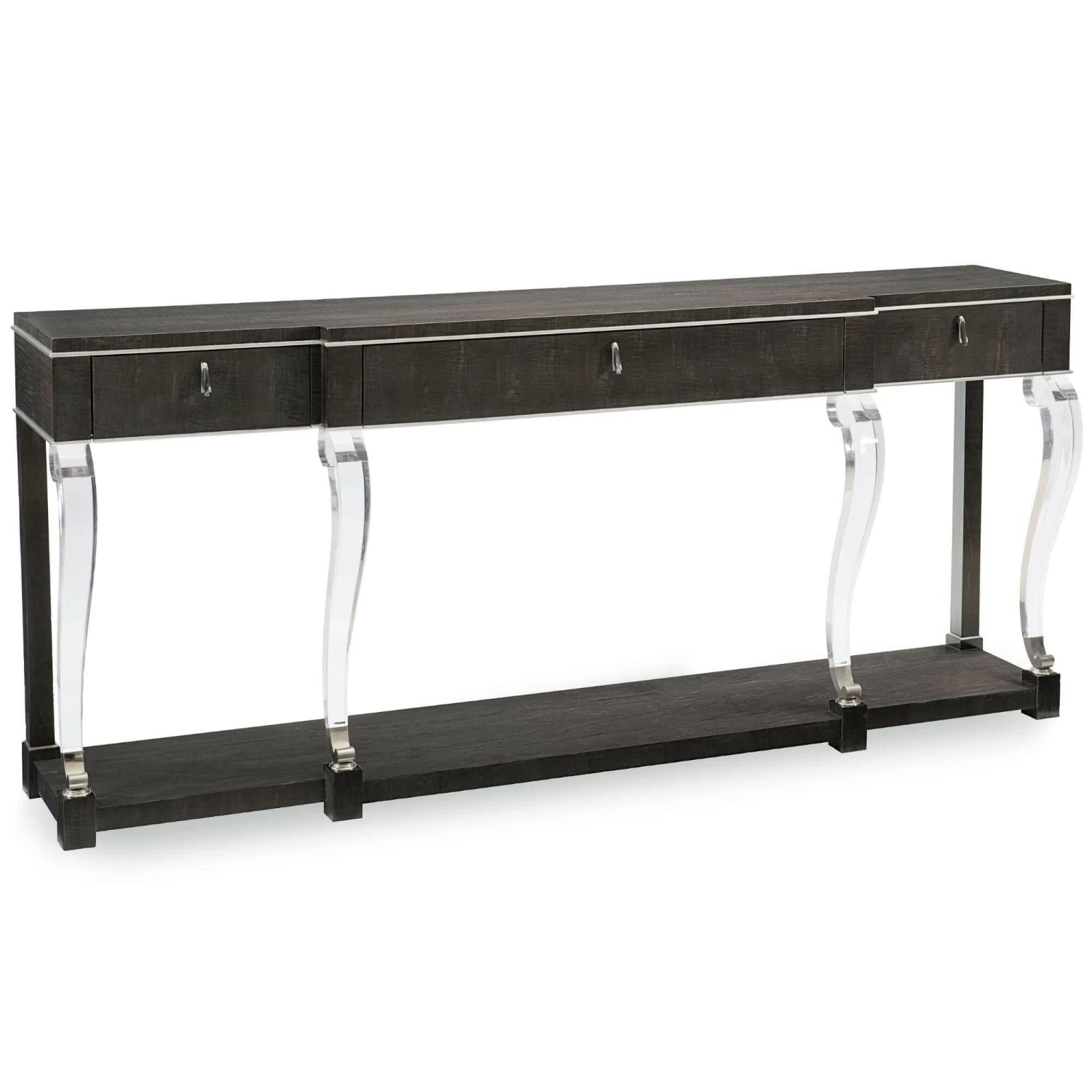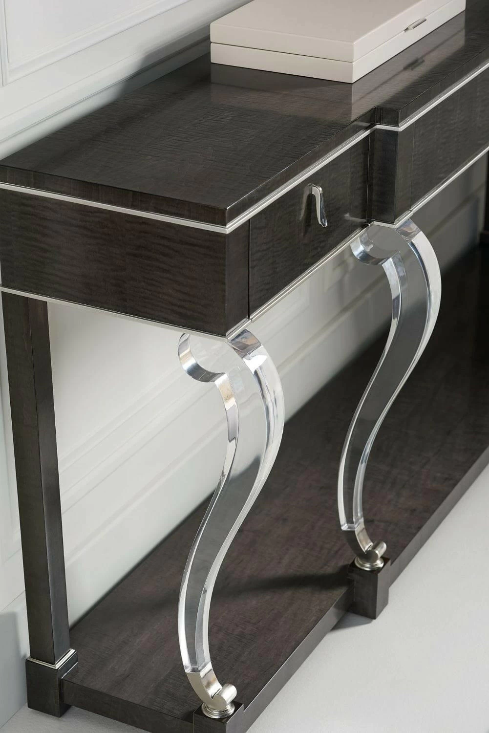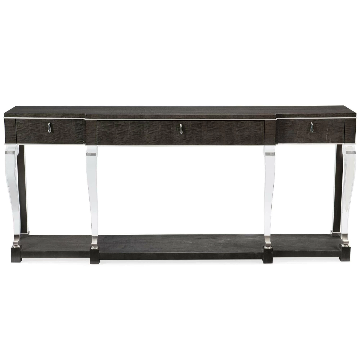 Add uncommon elegance to a space with this console — the perfect piece for a well-composed display or favourite objet d’art. Curvaceous front legs are crafted from acrylic and provide contrast to the rich Midnight Maple finish on its Black Curly Maple veneers. Metal accents in Polished Chrome add a finished look. Altogether, the lasting impression is one of timeless contemporary sophistication. Case in Midnight Maple. Acrylic legs with metal collar accents. Three drawers with undermount soft-close guides. Drawer interiors in Midnight. Metal ferrules in Polished Chrome.