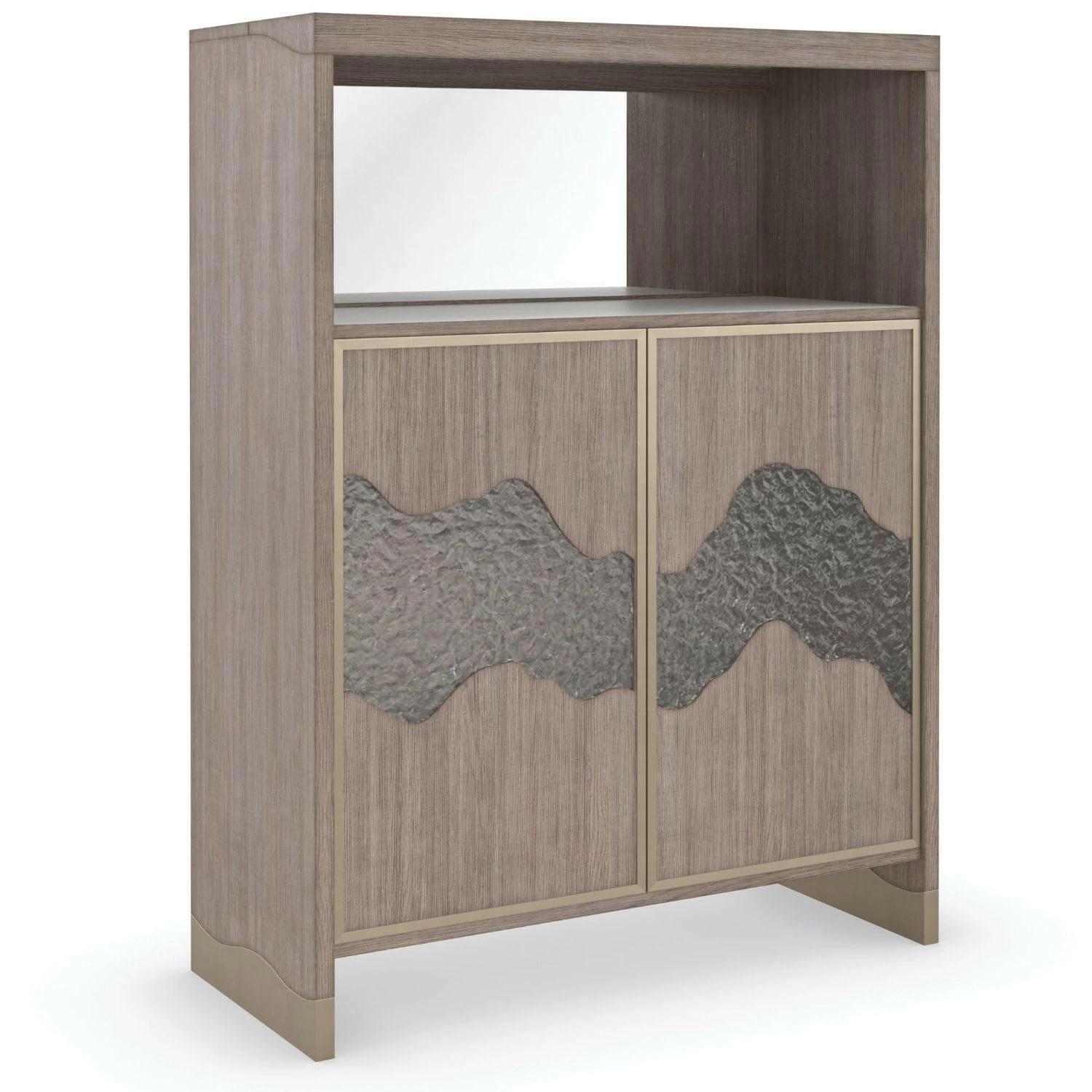 A reflection of beauty and fluidity found in the natural world, this bar cabinet mixes organic materials with the soft sheen of metal. Touch-latch doors are crafted with textured acrylic panels that recall the flow of a meandering river. Elevating function, a flip top lets you access space for pouring and mixing, while a removable stone tray slides under the interior drawer for ease of serving. Offers abundant storage with adjustable glass shelves and a drawer for keeping mixing tools, coasters, and linens. A single LED light illuminates the work surface, and for added ambiance, an LED-lit interior emits a soft glow behind the decorative inset door panels. Frame is highly distressed Pine solids and Fir veneers finished in Driftwood. Interior end panel backs behind the door and bottom panel in Driftwood. Top flips back for easy access to a stone shelf. Two touch latch doors have individual custom cast textured glass panels with a metal frame perimeter in Neutral Metallic. Cast glass inserts are lightly shaded on the back for frosting effect. Behind the doors is a 3/8 adjustable glass shelf (tempered), a removable tray with stone surface and a drawer with side guides. Interior is LED lighted to provide a soft glow behind the frosted glass. Upper open storage area is lighted with a mirrored back and stone surface. Interior is finished in Neutral Metallic.