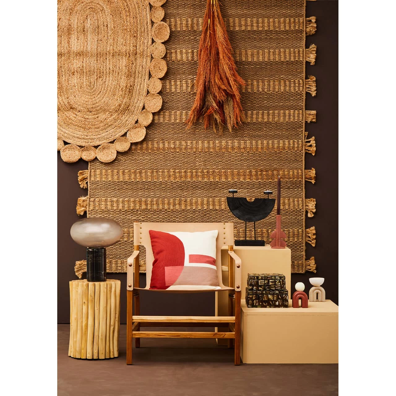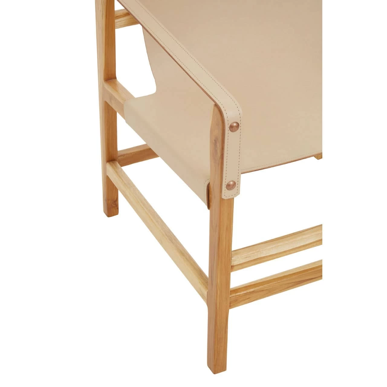 The natural cow leather seat and backrest of this chair form a sling design that is wrapped neatly around a solid natural teak wood frame. The clean line design contributes to the minimal aesthetics of this chair, while the studs add a metallic detail.