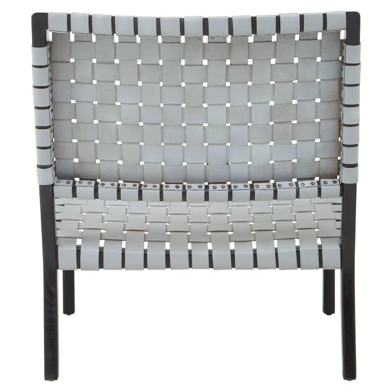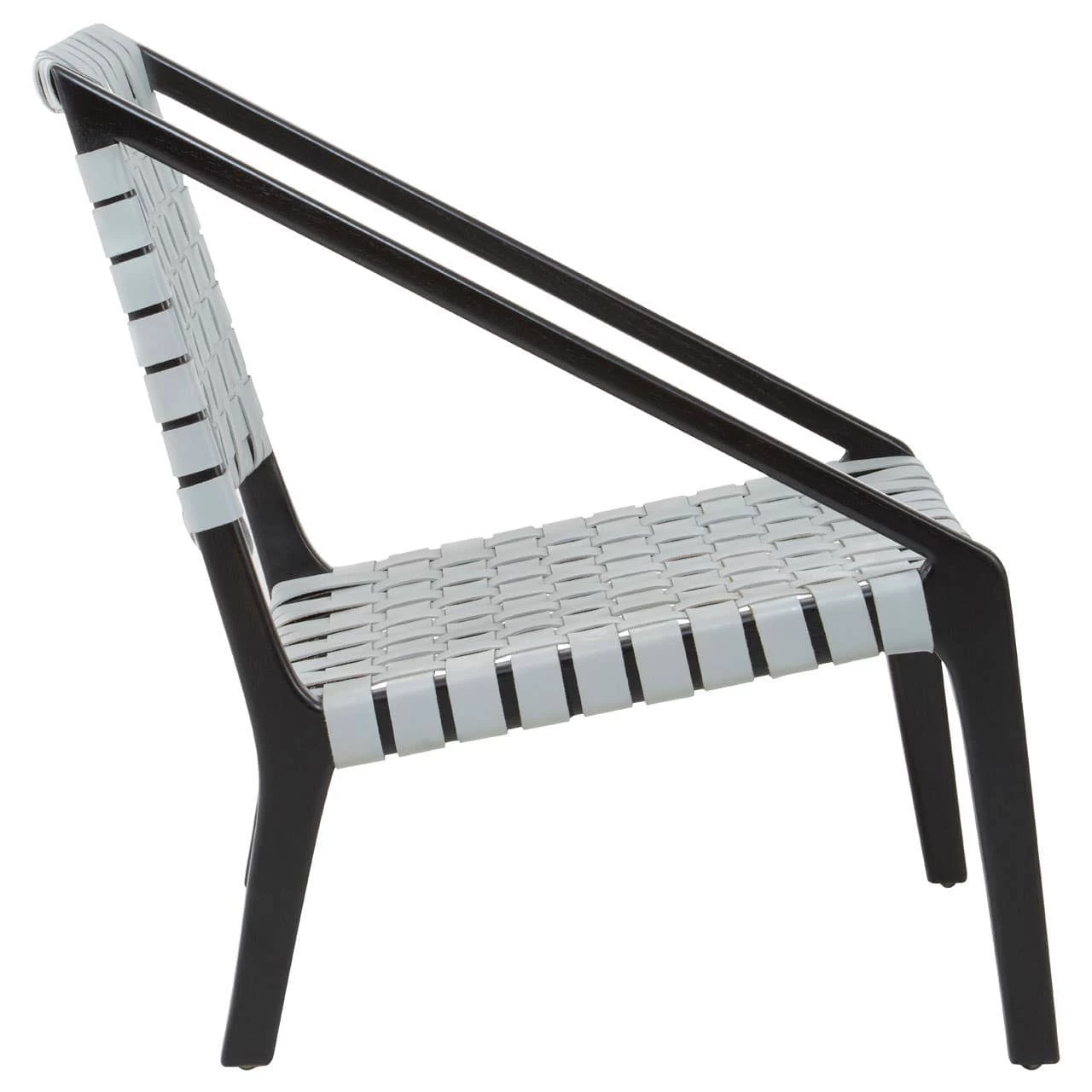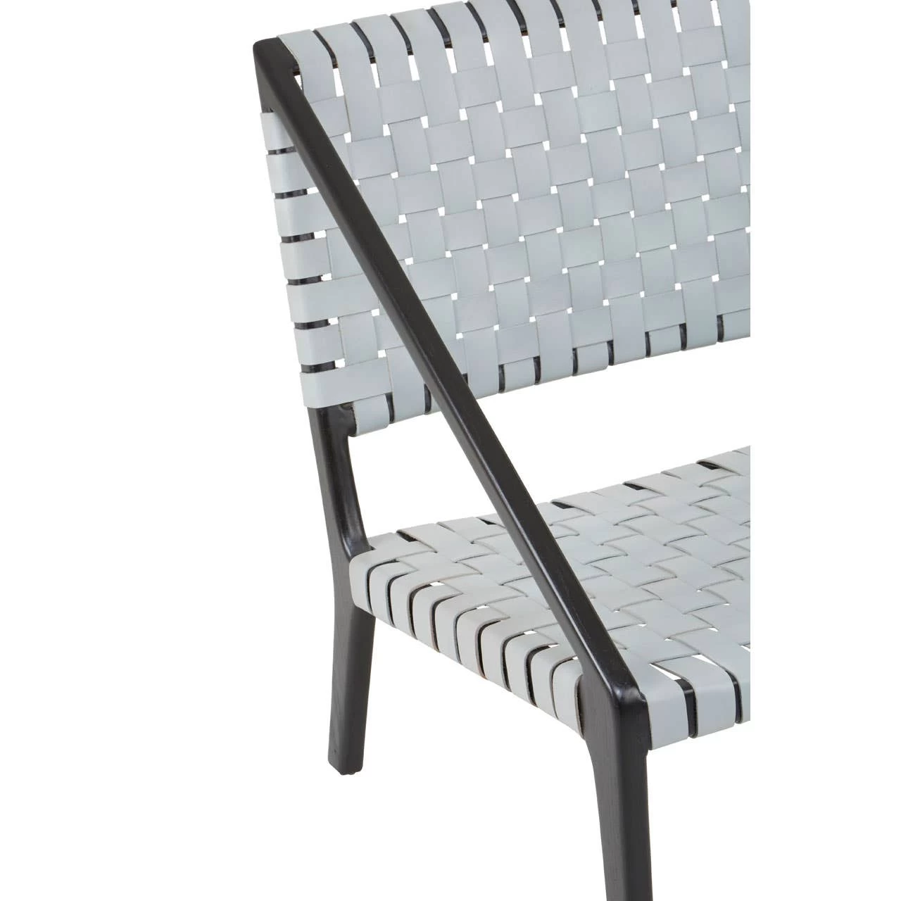 The chair’s frame is crafted from renewable teak wood and has a black colour that creates a sleek finish. A series of soft leather straps are tautly strung across the seat and backrest, producing a lattice design that opens up the aesthetic and provides a comfortable sitting experience. The grey leather coordinates seamlessley with the black wood.
