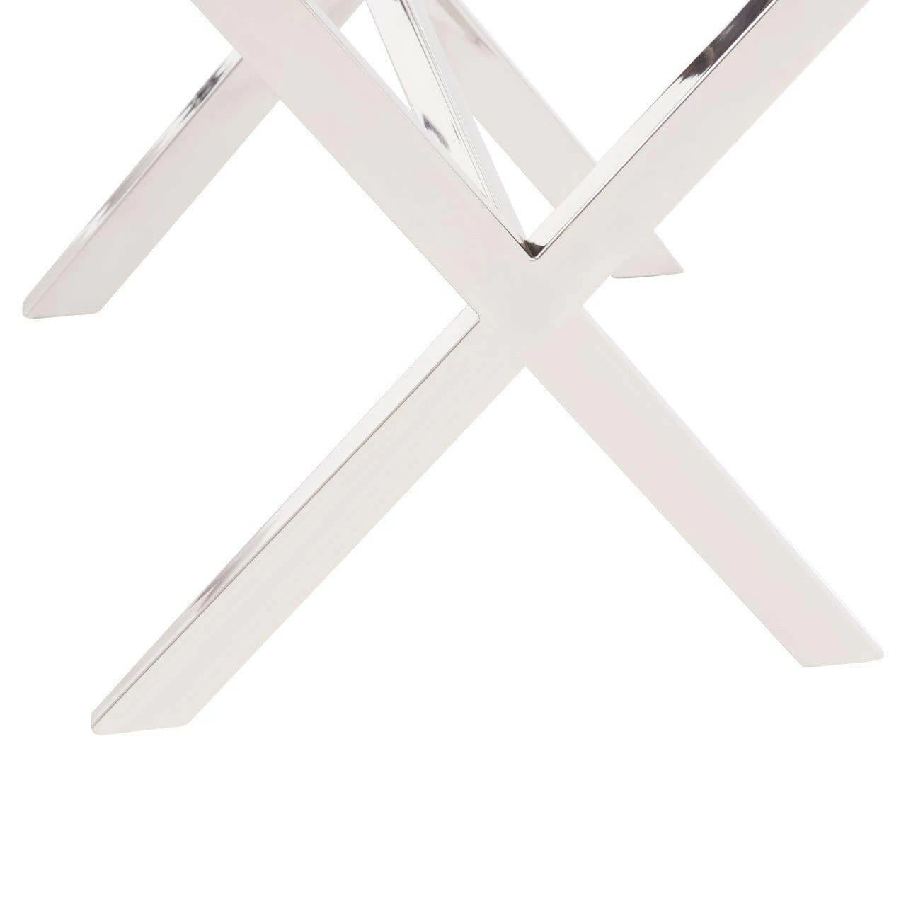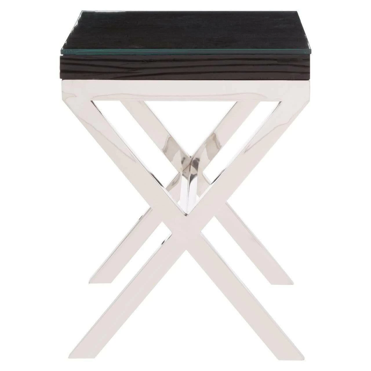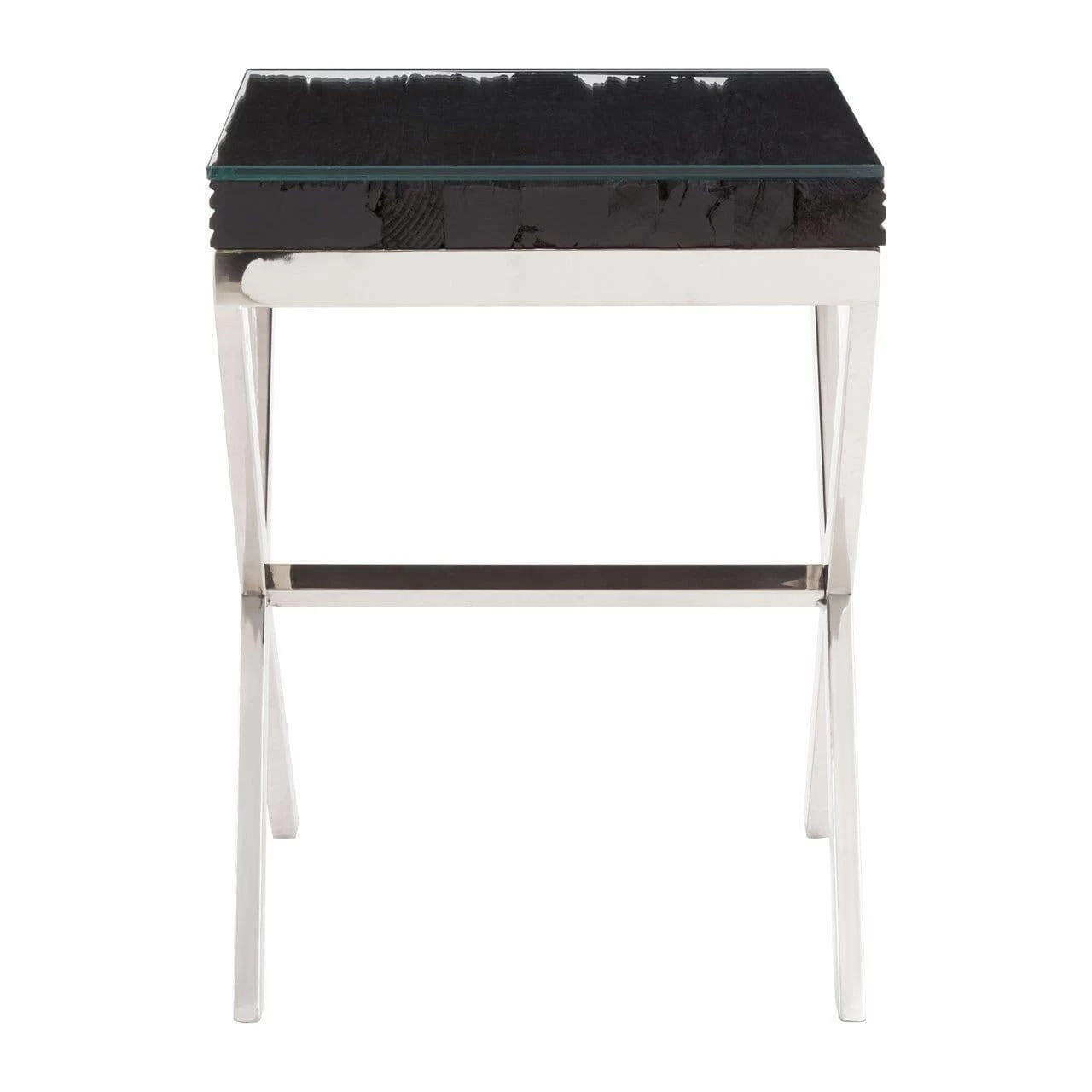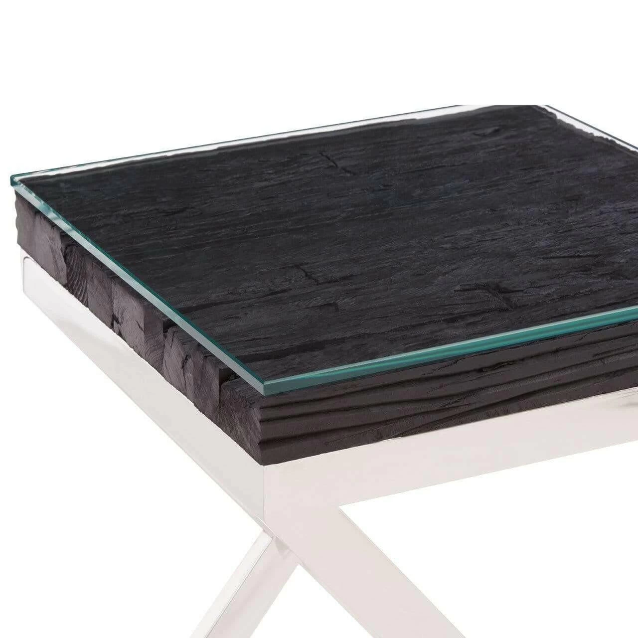 Black finish salvaged wood forms the square top of this side table which is further adorned with the clear glass slab. The top in natural grain and texture is supported with the metallic silver cross base in a smooth finish.