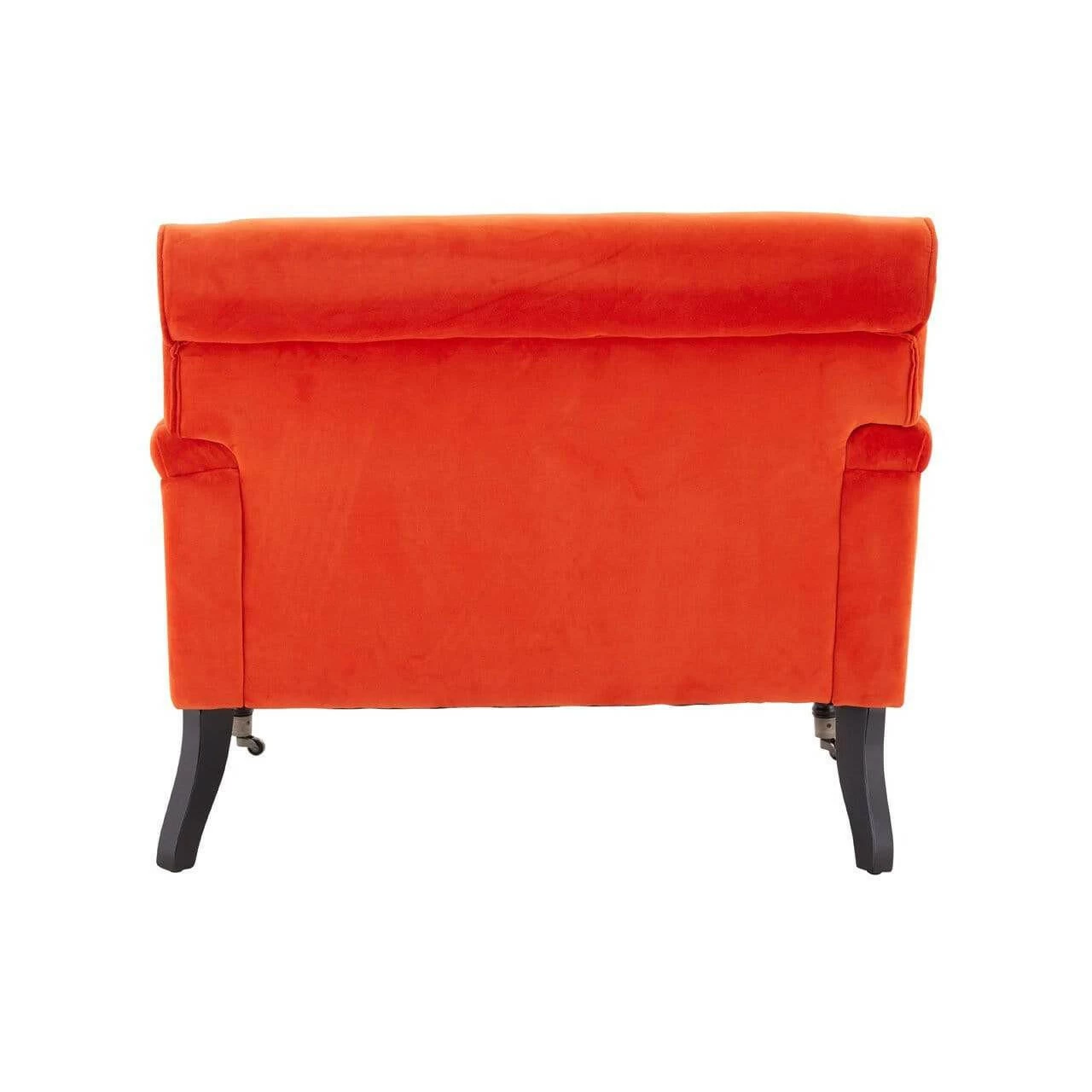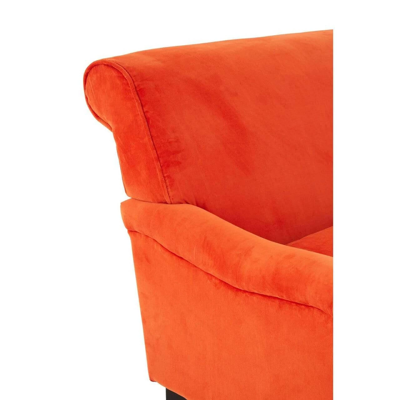 This stylish armchair is supported by elegantly carved legs made from environmentally friendly birchwood. Its orange colour gives it a vibrant look, while the plush velvet upholstery is both luxurious and easy to maintain. The front legs each have a caster wheel making the chair easy to move when required. Pair with the matching footstool to add an extra level of comfort.