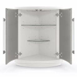 A mix of wood and stone lends a classic undertone to this lavish design. Mirrored doors add to the allure of its graceful tulip shape, beautifully balanced on a simple plinth base in Soft Radiance paint. Features a fixed shelf on the interior for bedside essentials, with open space beneath for keeping night-time reads. Case finished in Stone Manor. Stone Top. Two doors with fronts in Ivory Wash and interior with one fixed shelf. Interior in Stone Manor. Plinth base in Soft Radiance.