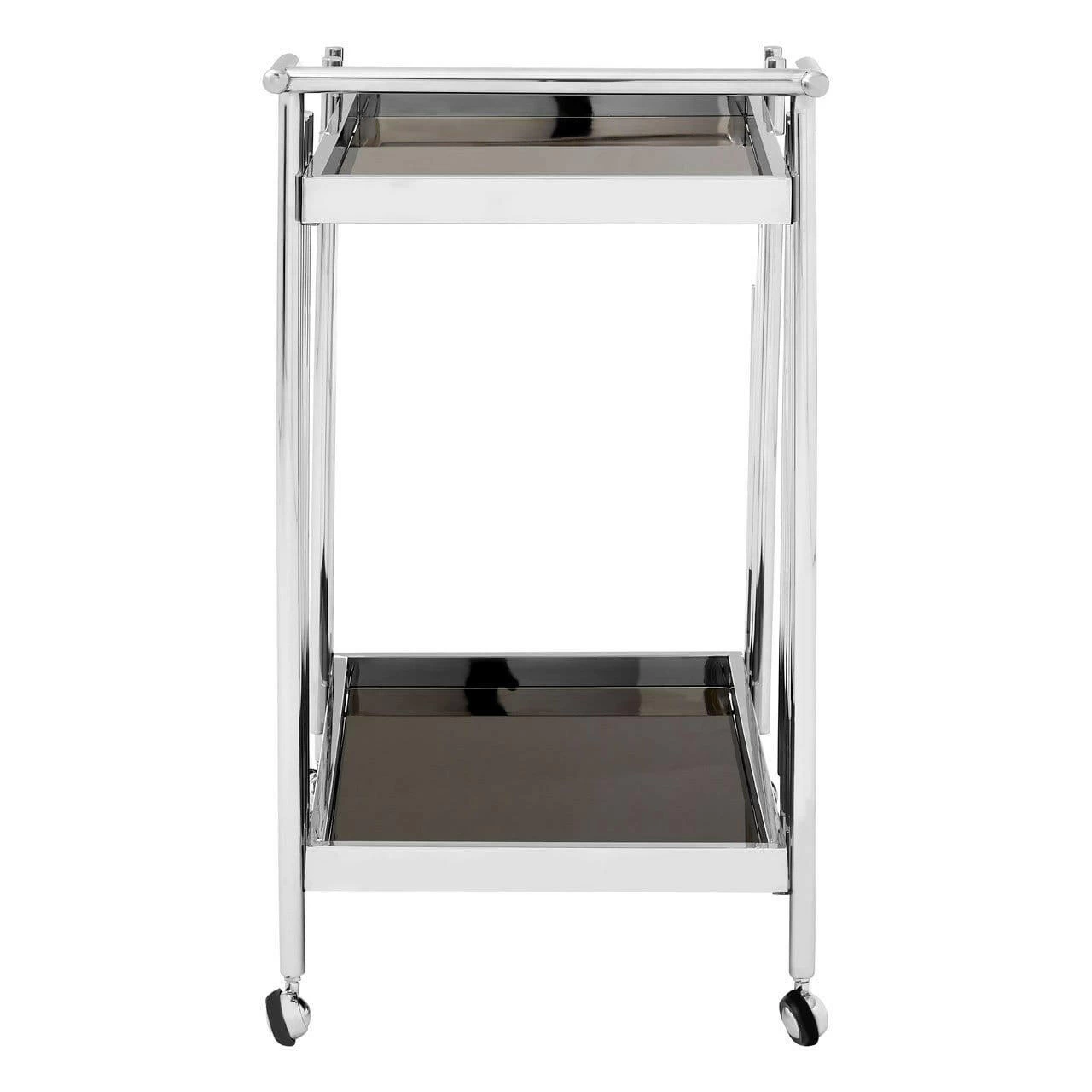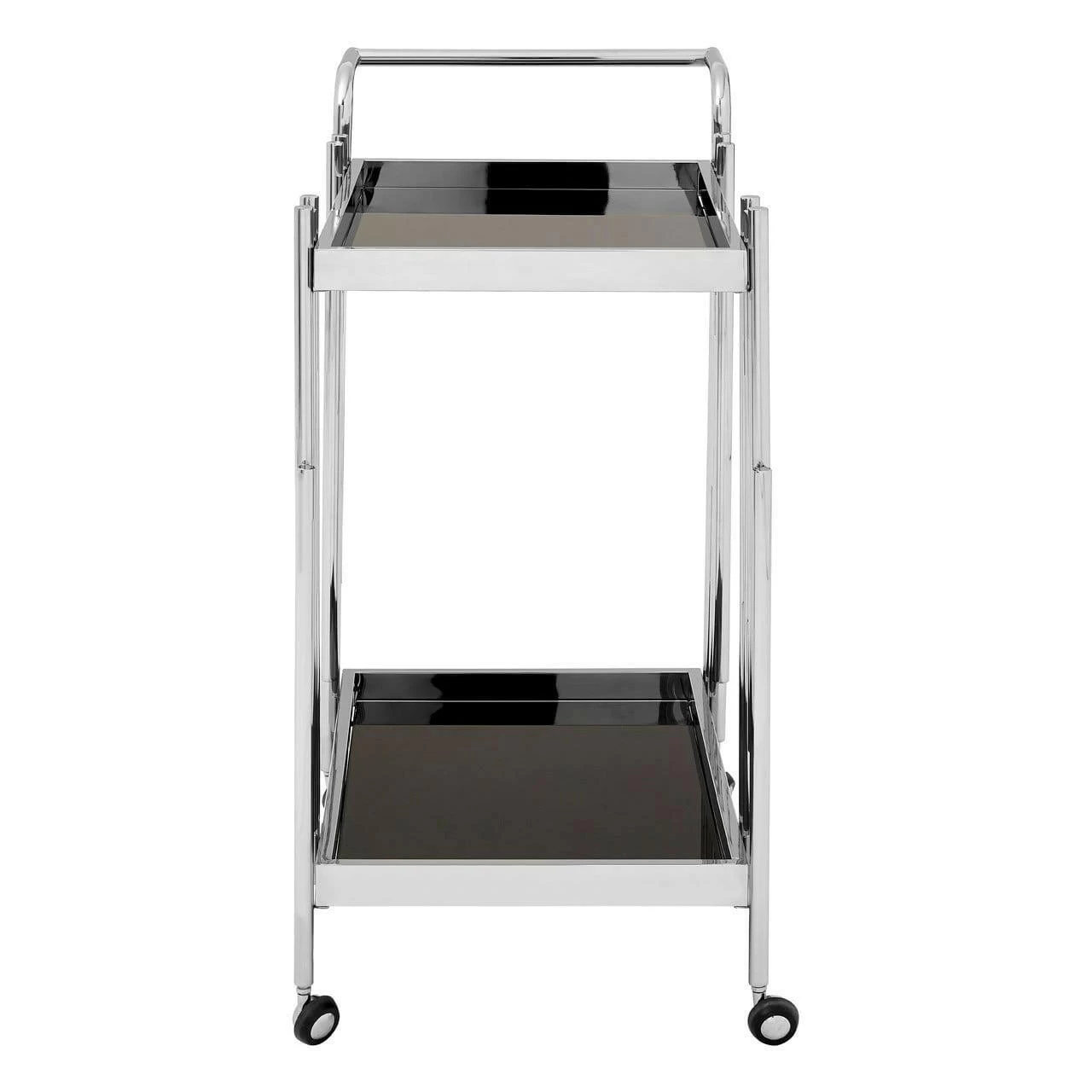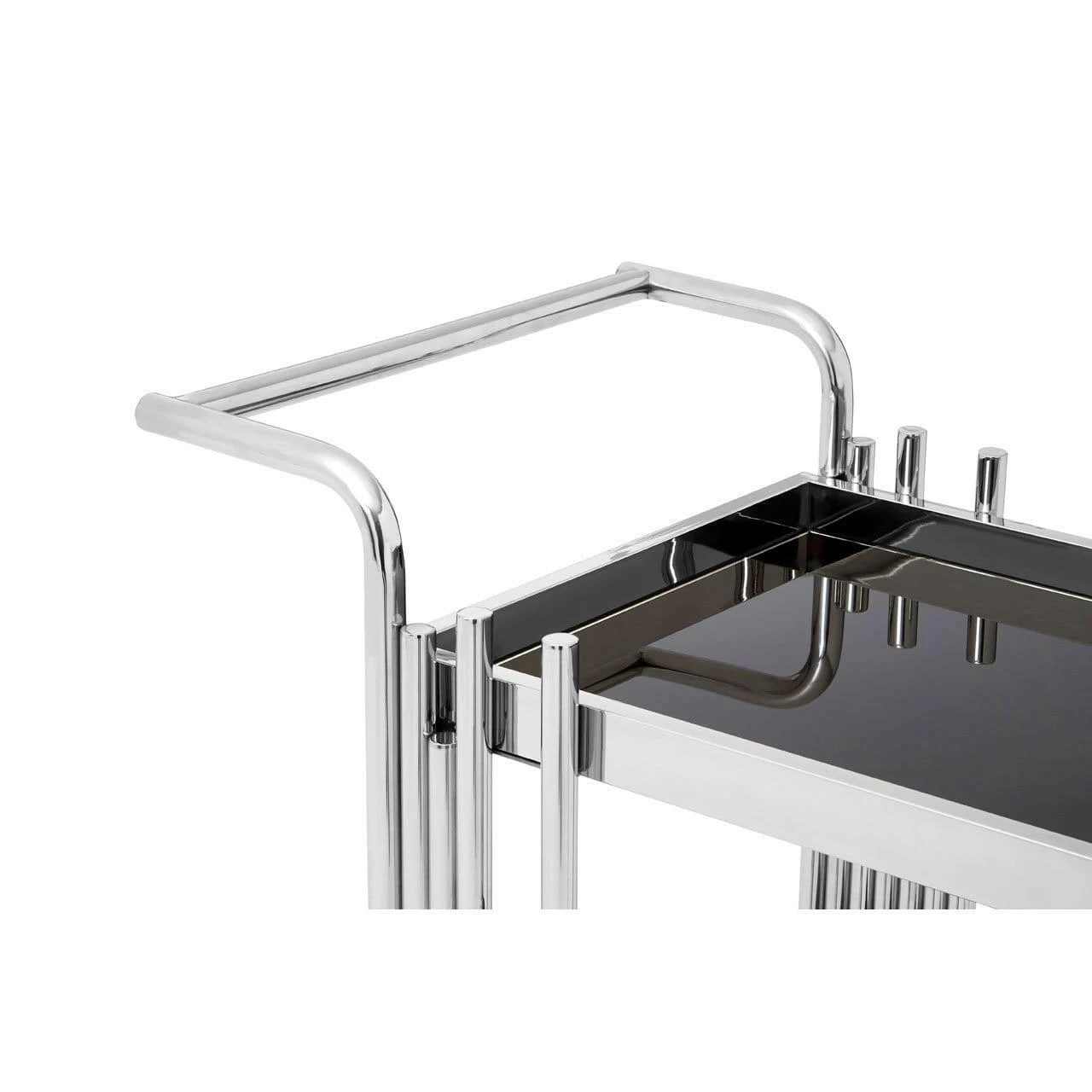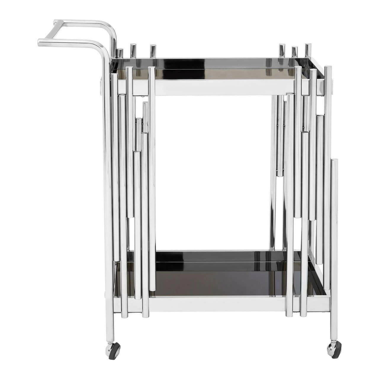 The Novo drinks trolley features a stylish frame and handle created from silver-finished stainless steel, with cylindrical bar motifs adding distinction. Two shelves are formed from tempered glass with a sleek black finish to counterpoint the cool metallic frame. Four wheels allow for the trolley to be easily transported and repositioned.