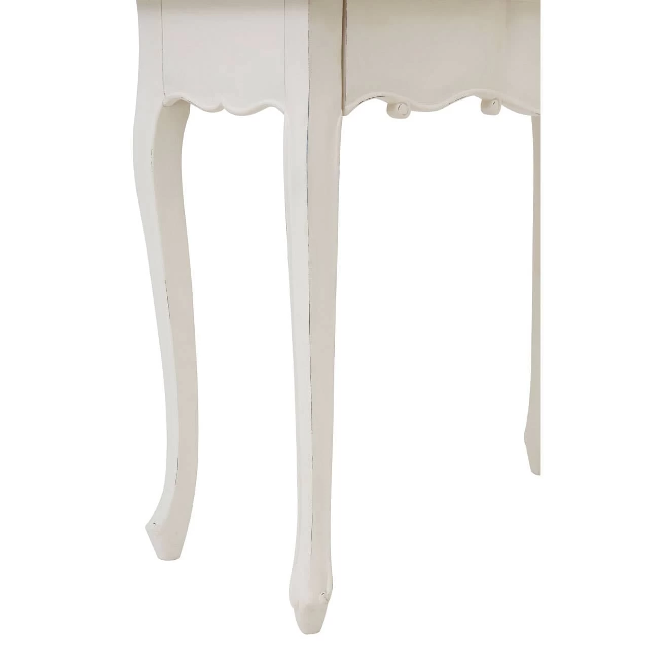 The Loire dressing table is formed from bayur wood and features carved legs and an undulating apron. The wood is coloured a crisp white and features subtle weathering that accentuates its curves. Ornate brass coloured metalwork adorns its storage drawers. Its three panel mirror can be adjusted at the sides.