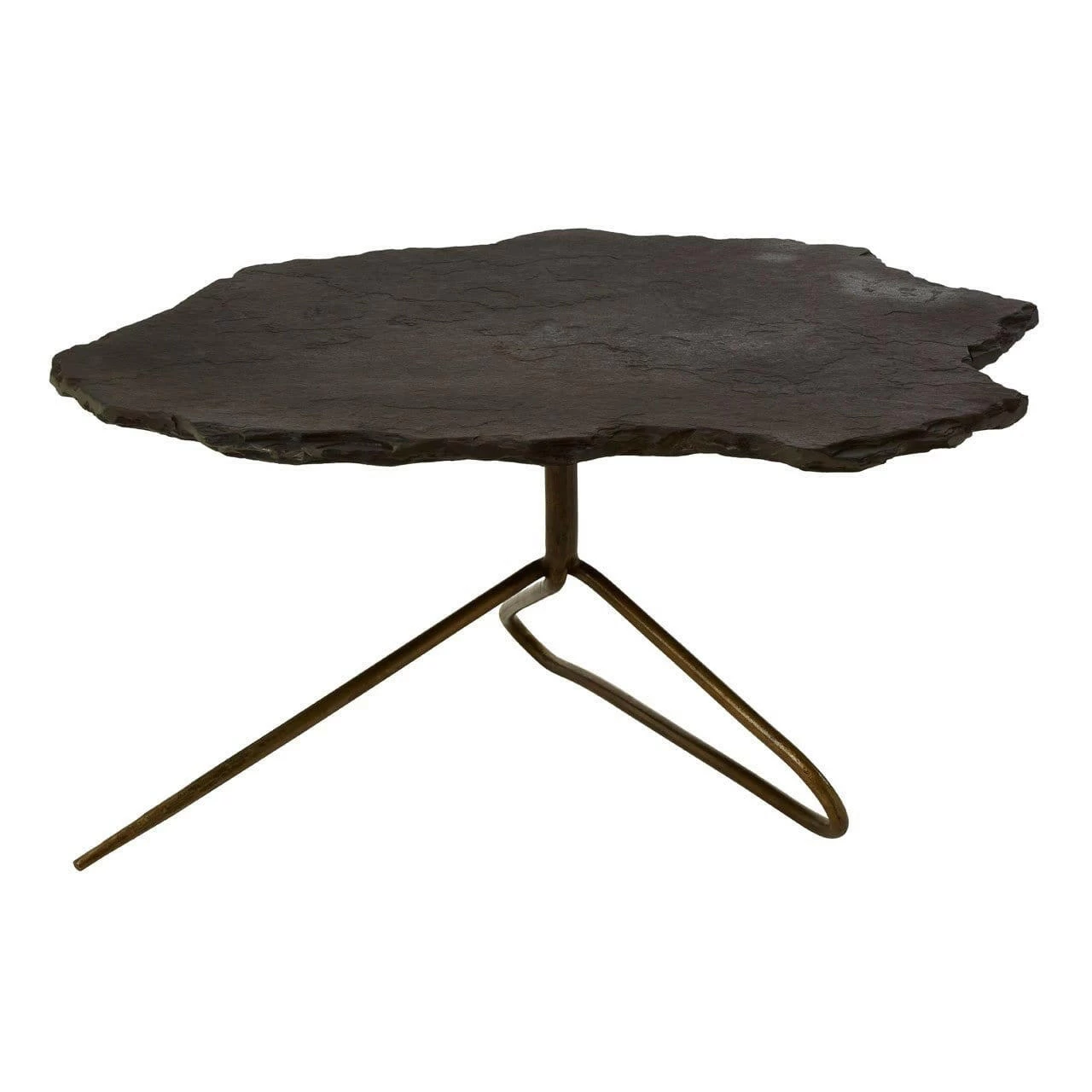 The stone top is notable for its irregular, unhewn edges and has a slate black colour. It’s supported by a single piece of iron that has been manipulated into three legs, and given an antique brass finish.