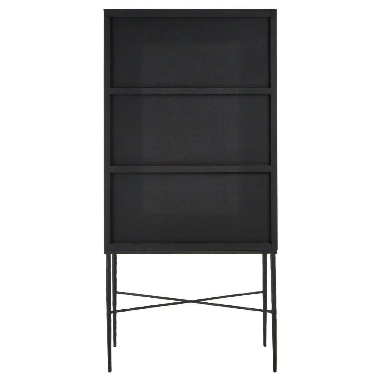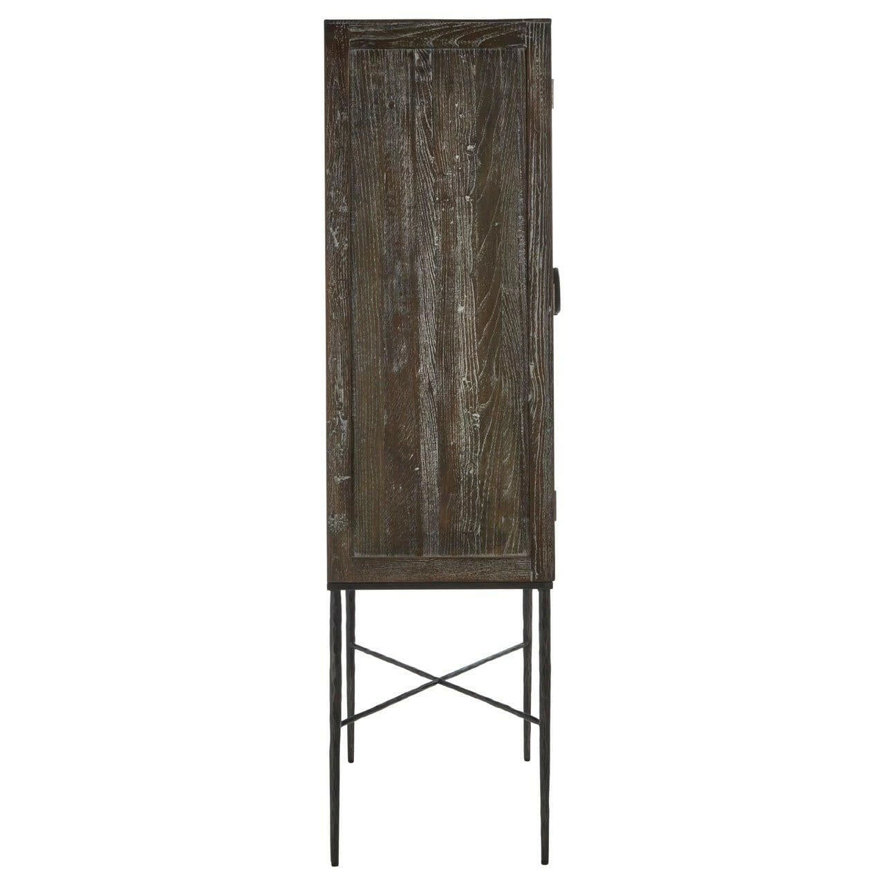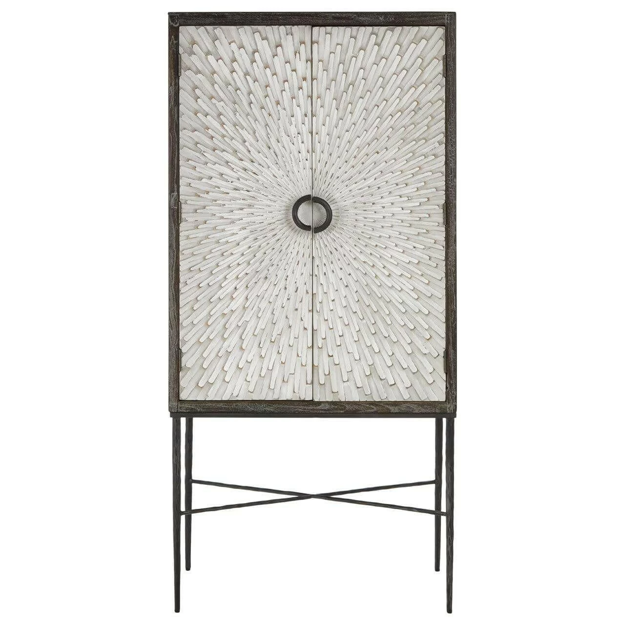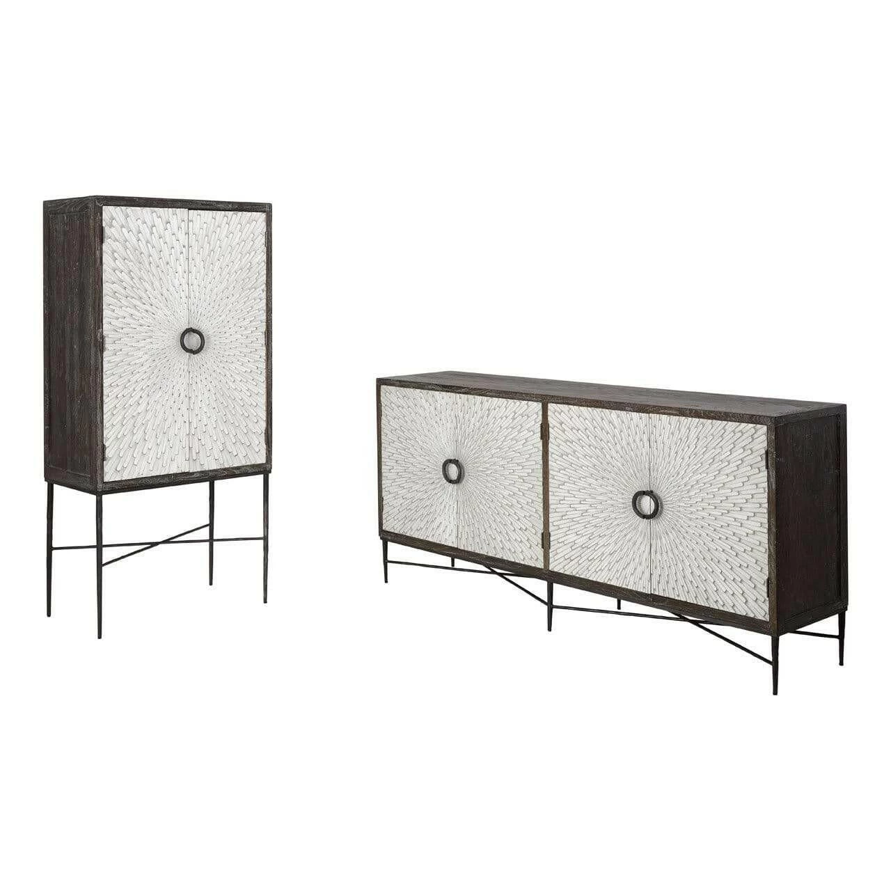 The cabinet is made from sustainable elm wood and are supported by black iron legs. Its doors have a striking carved starburst design with a cool silver finish. The design incorporates ample storage space for glasses, bottles, and accessories.