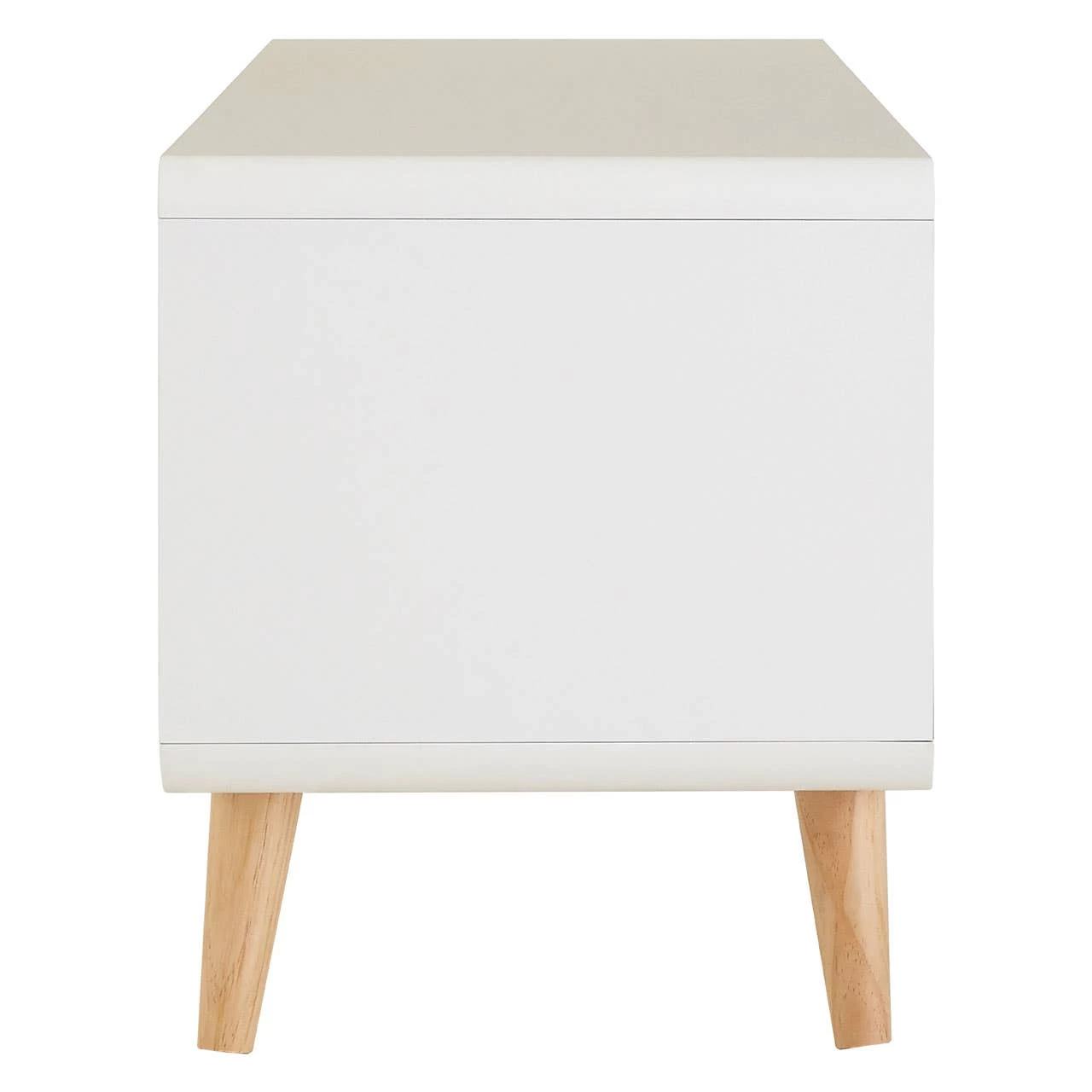The Milo media unit provides generous storage and display space thanks to its open shelves, two cupboards, and wide top surface area. Round holes are positioned behind the shelves to allow for neat and tidy cable arrangement. Both drawers feature cut-out handles that add to the unit’s sleek design. Natural pine wood legs complement the unit’s cool white and grey colour scheme.