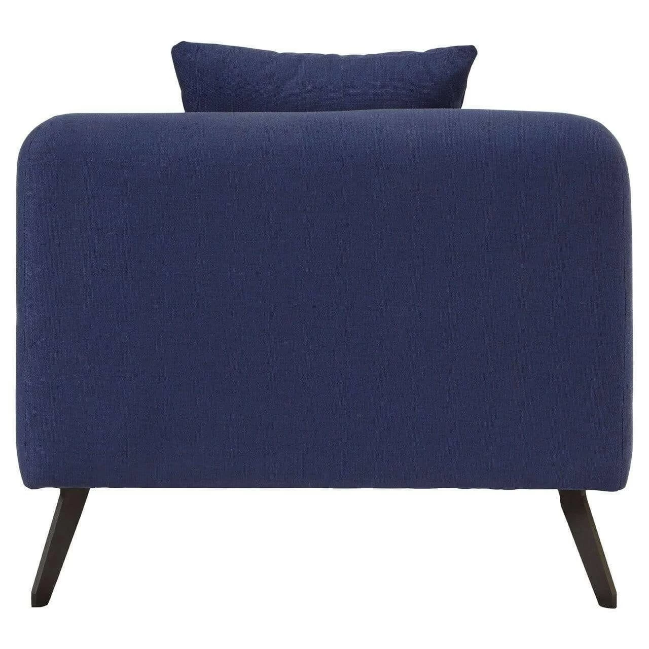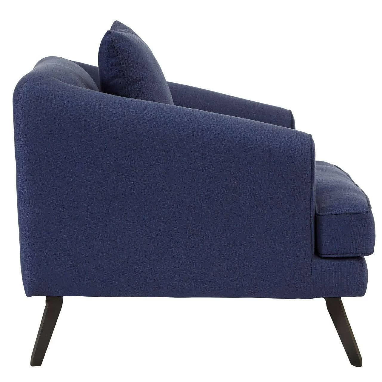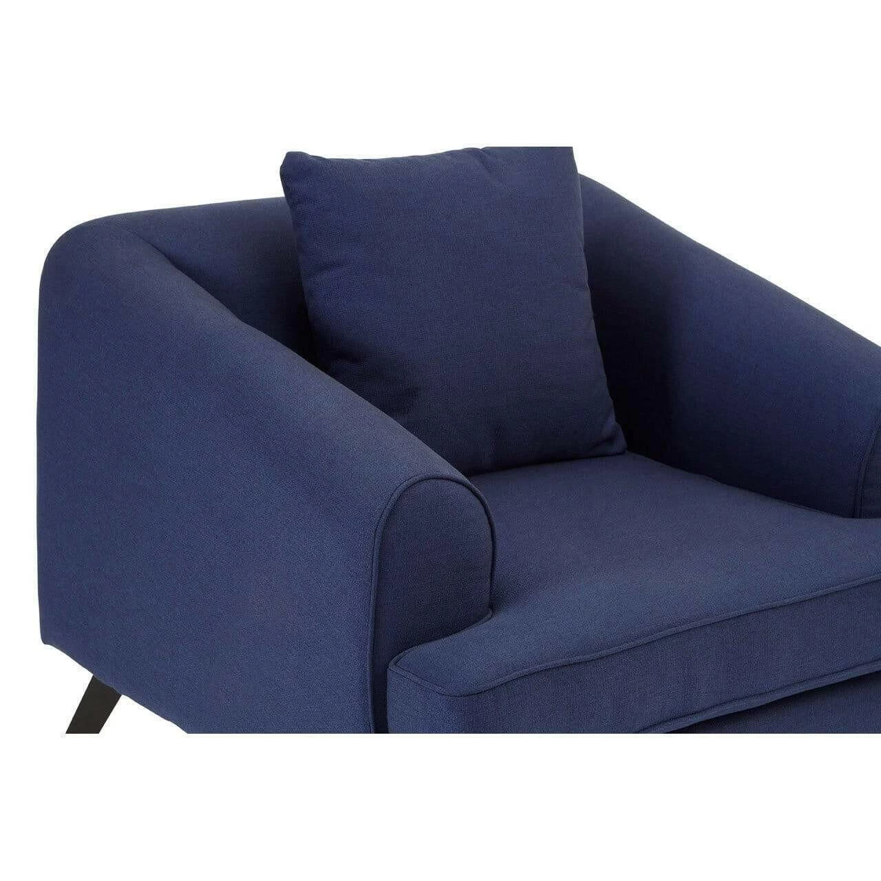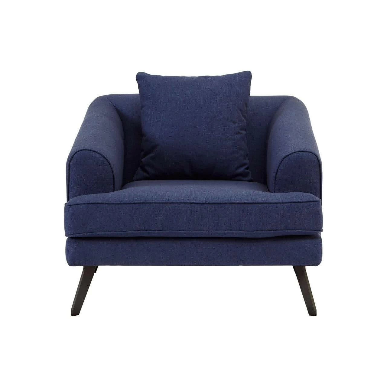 The Mylo chair is supported by angled metal legs, their sleek black finish creating a tonal contrast to the navy fabric upholstery. The arms slope downwards from its low profile backrest, stopping to enable the plump cushion to extend a little further forward. A coordinating cushion provides additional lumbar support.