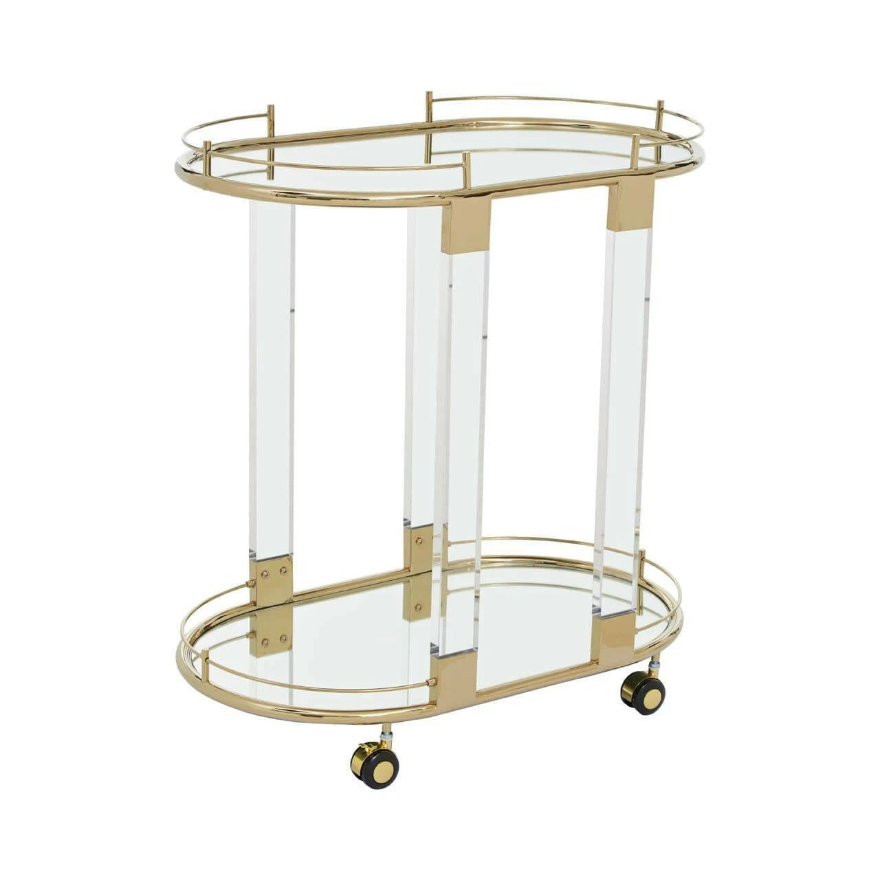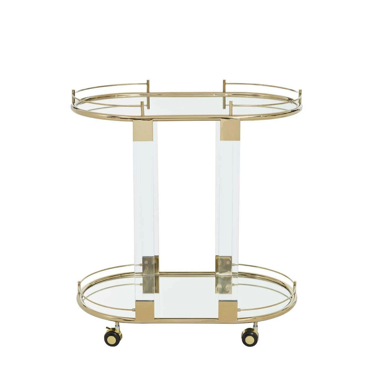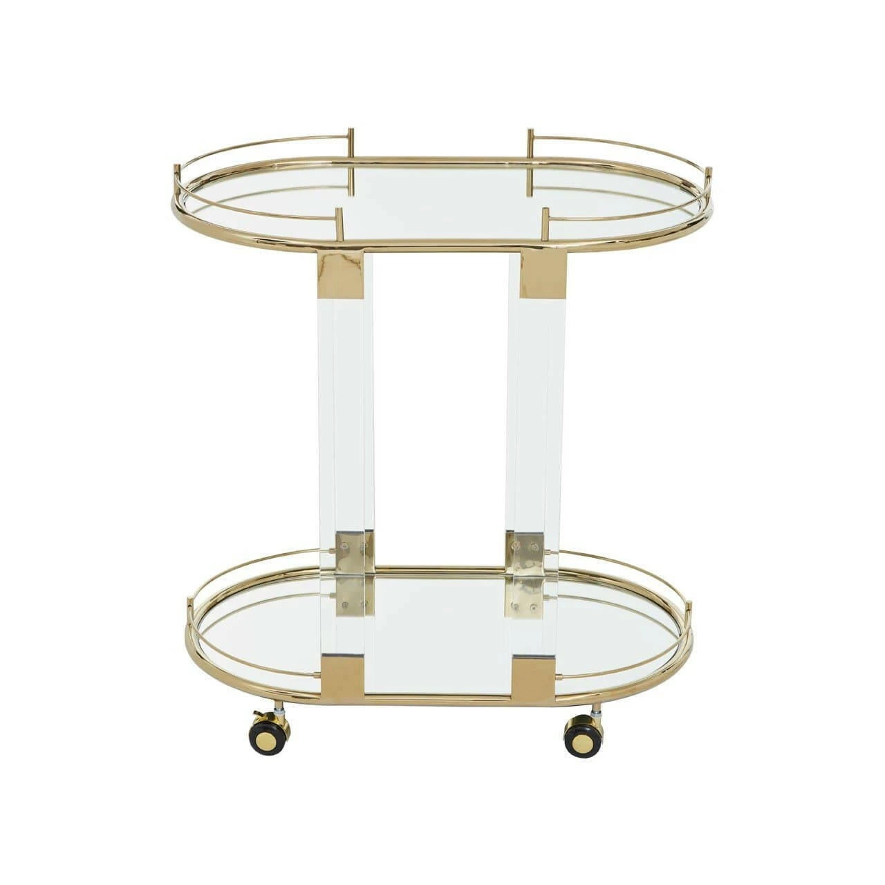Crafted of acrylic and stainless steel with a lustrous gold finish, this practical and stylish trolley on castors has a mirrored glass lower shelf and tray top. This trolley is ideal for serving cocktails, afternoon tea and more.