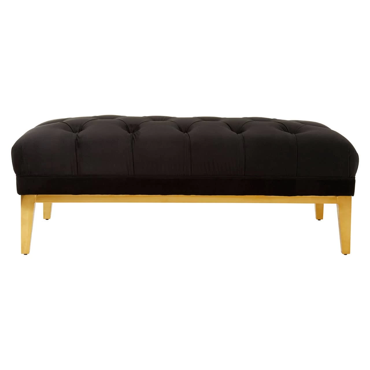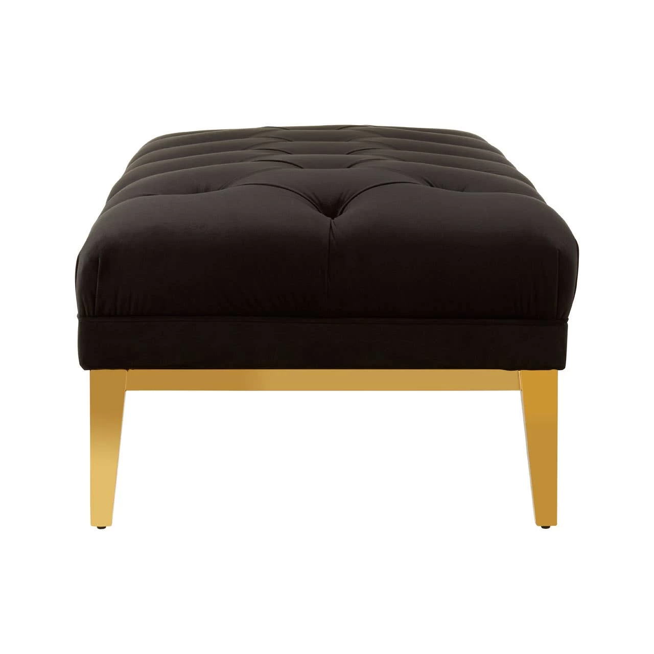 The rectangular Piermount ottoman is upholstered with soft black velvet to produce a finish that rewards the touch. Its deep button tufting pays homage to classical design. The base has a low profile and a reflective gold finish to complement the sleek black. Coordinate it with the Piermount bar unit.